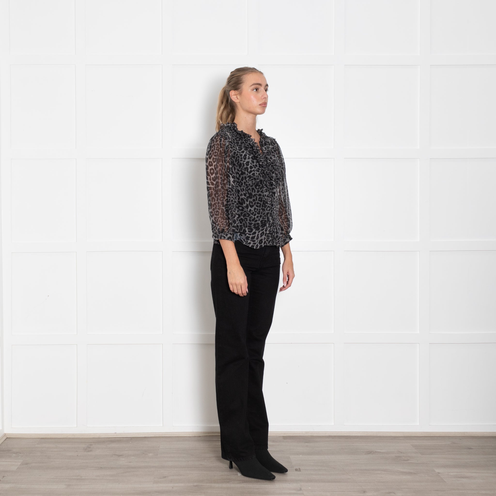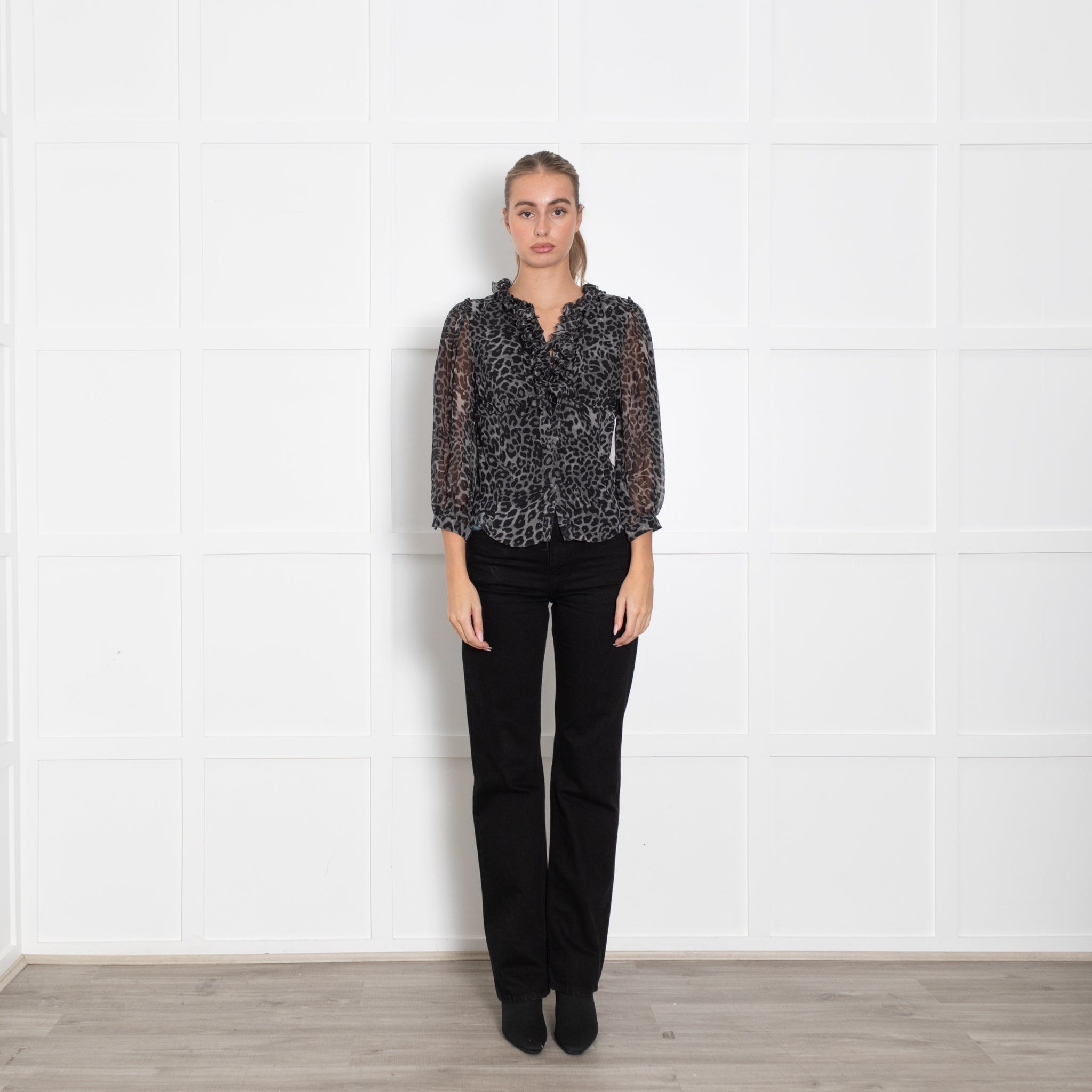 Diane Von Furstenberg grey long sleeve blouse, featuring an animal print exterior pattern design, with a frill trimmed cut design, a rounded frill neckline, and button-up front closure.
