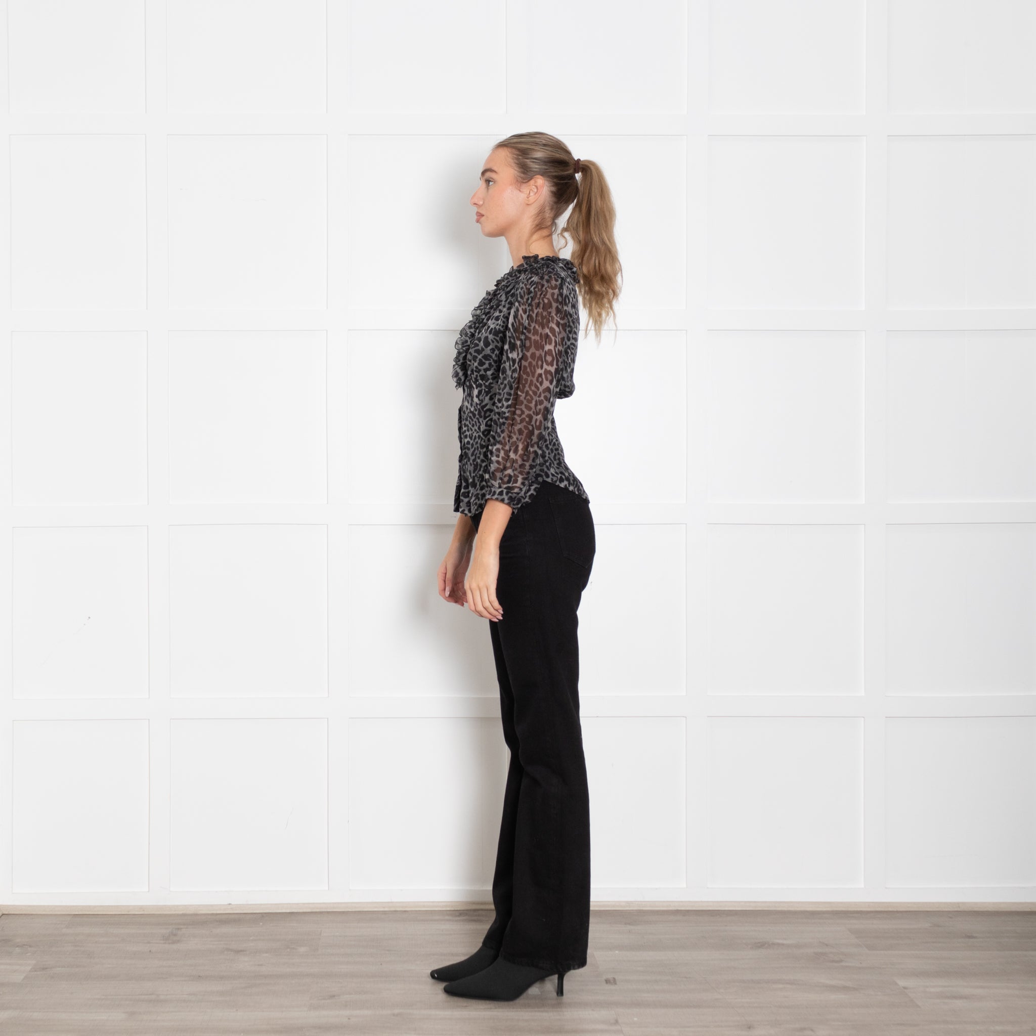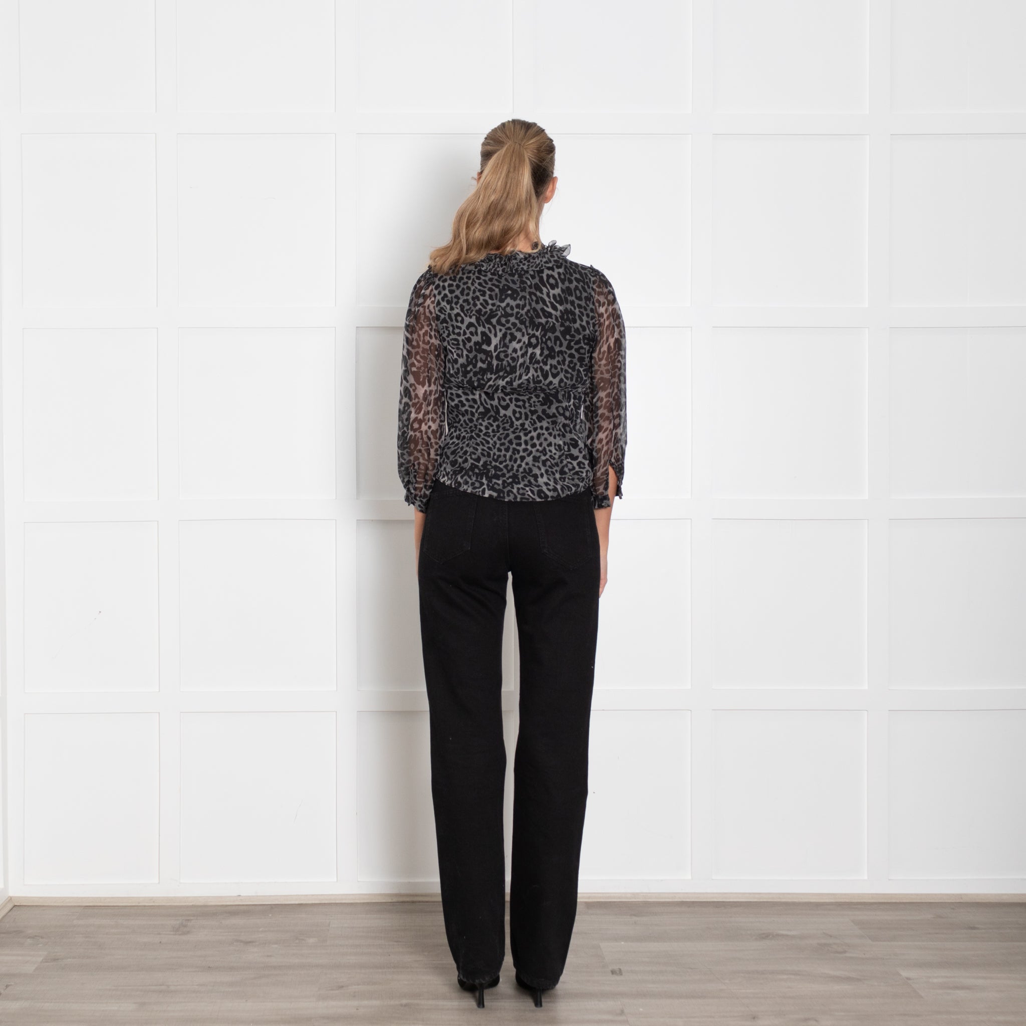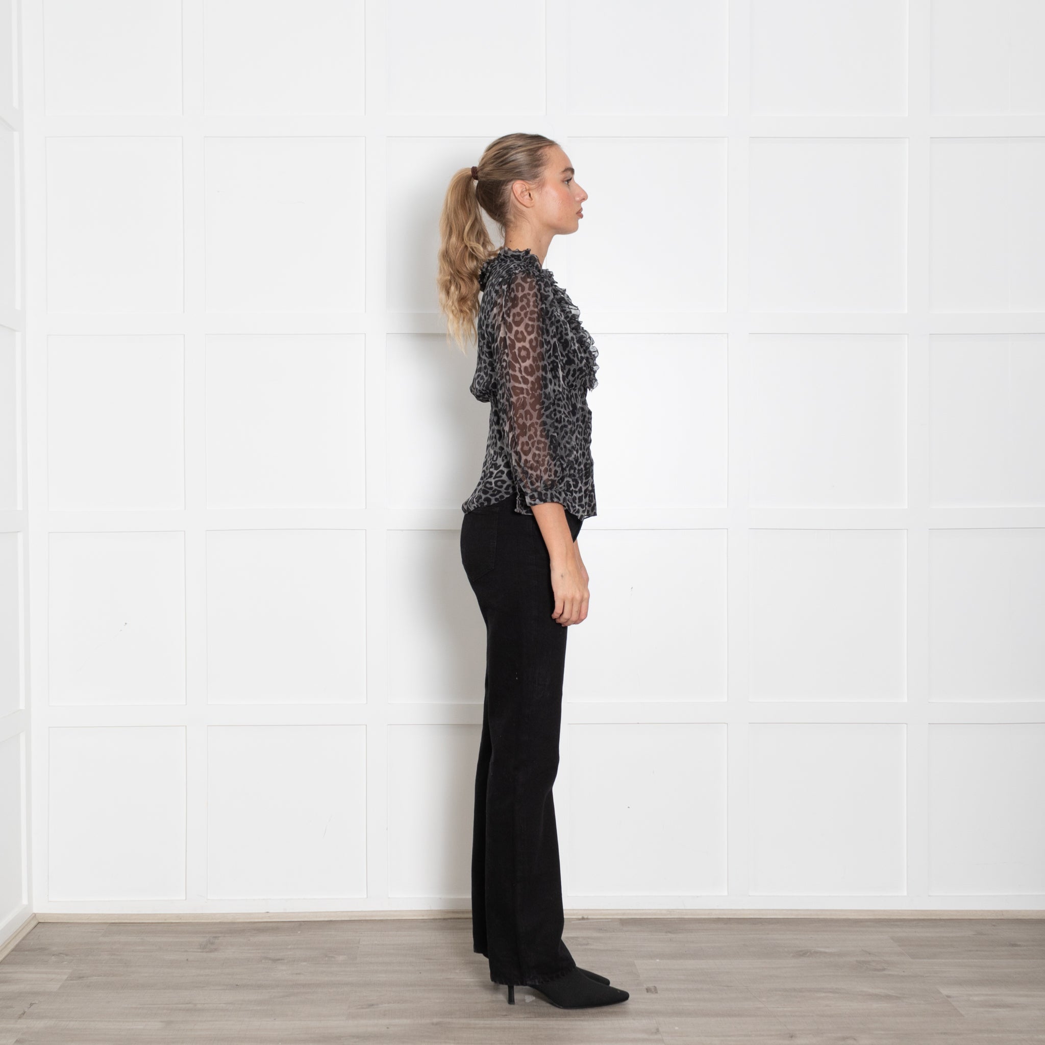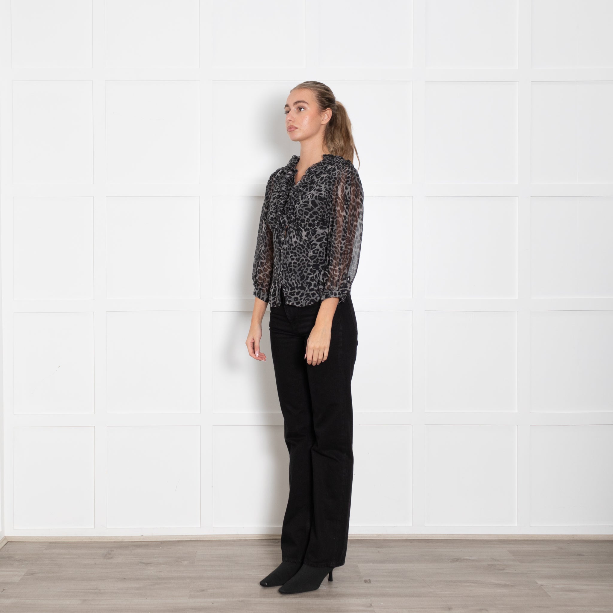 Diane Von Furstenberg Grey Animal Print Frill Trim Long Sleeve Blouse