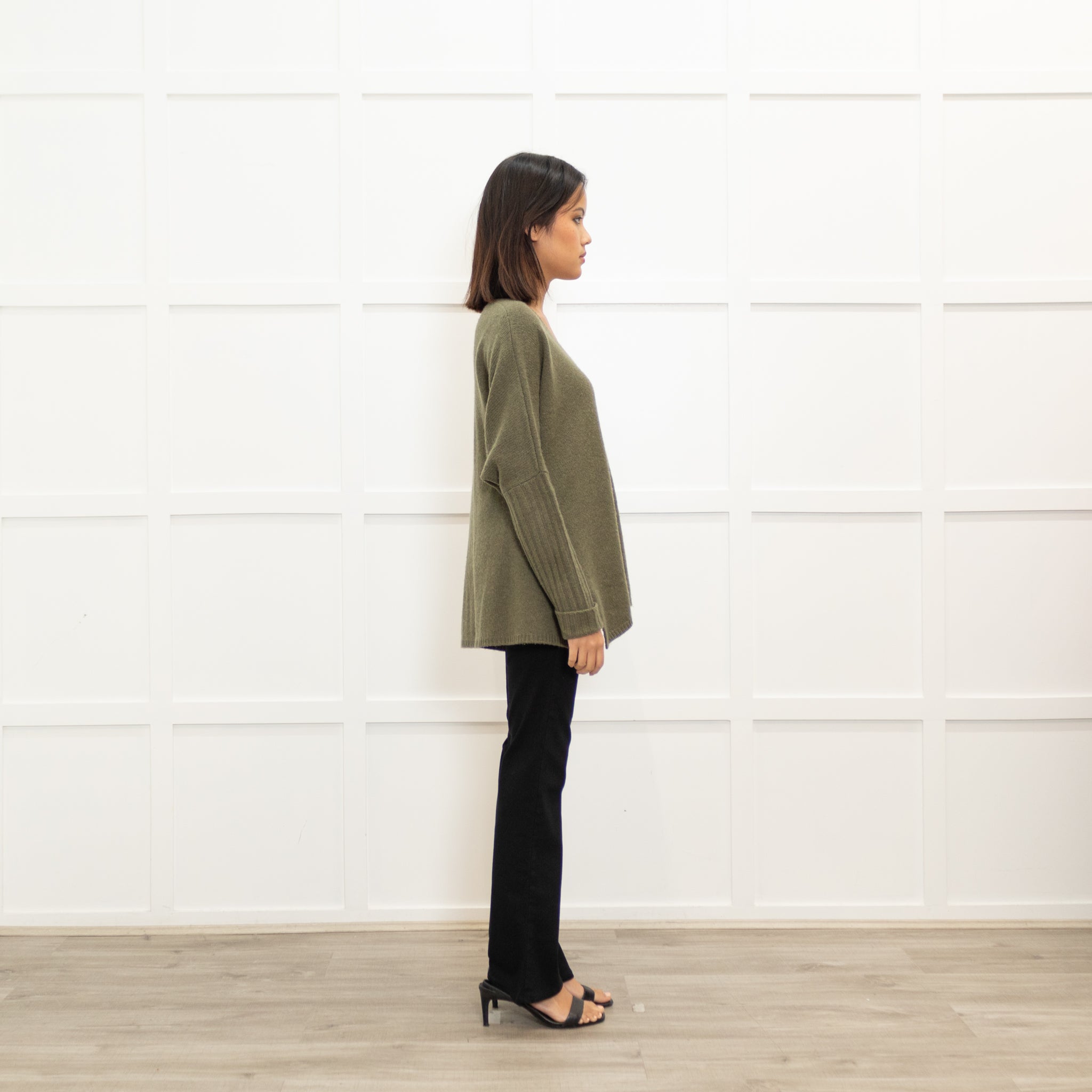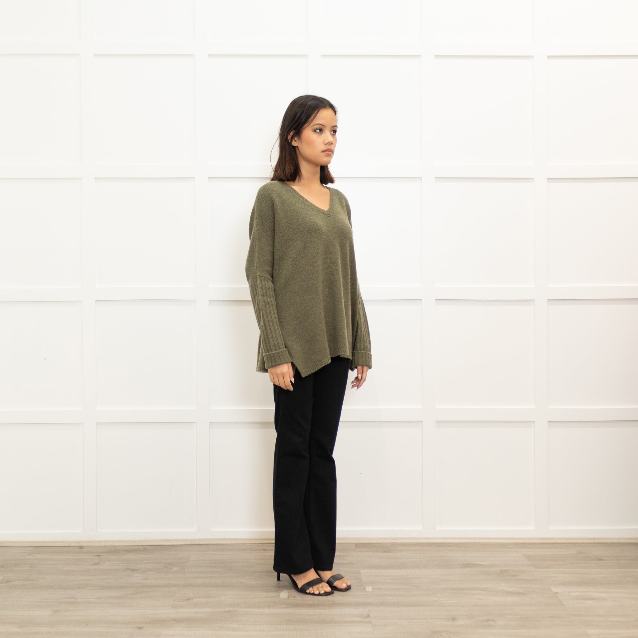 Divine Cashmere khaki cashmere v-neck jumper with ribbed sleeves and a drop shoulder.
