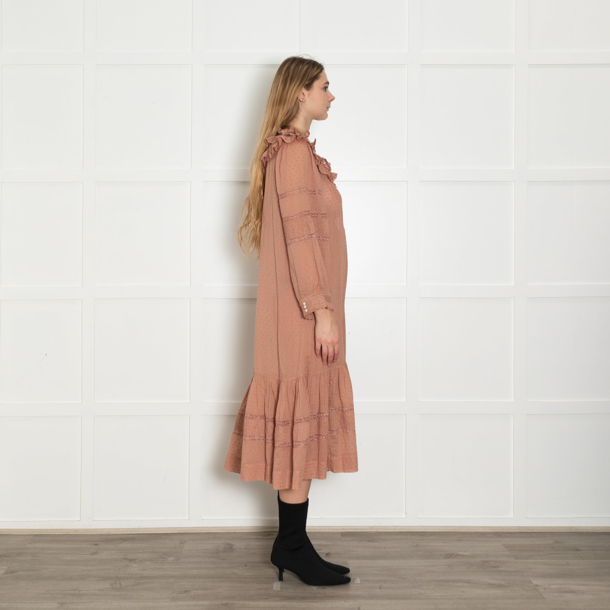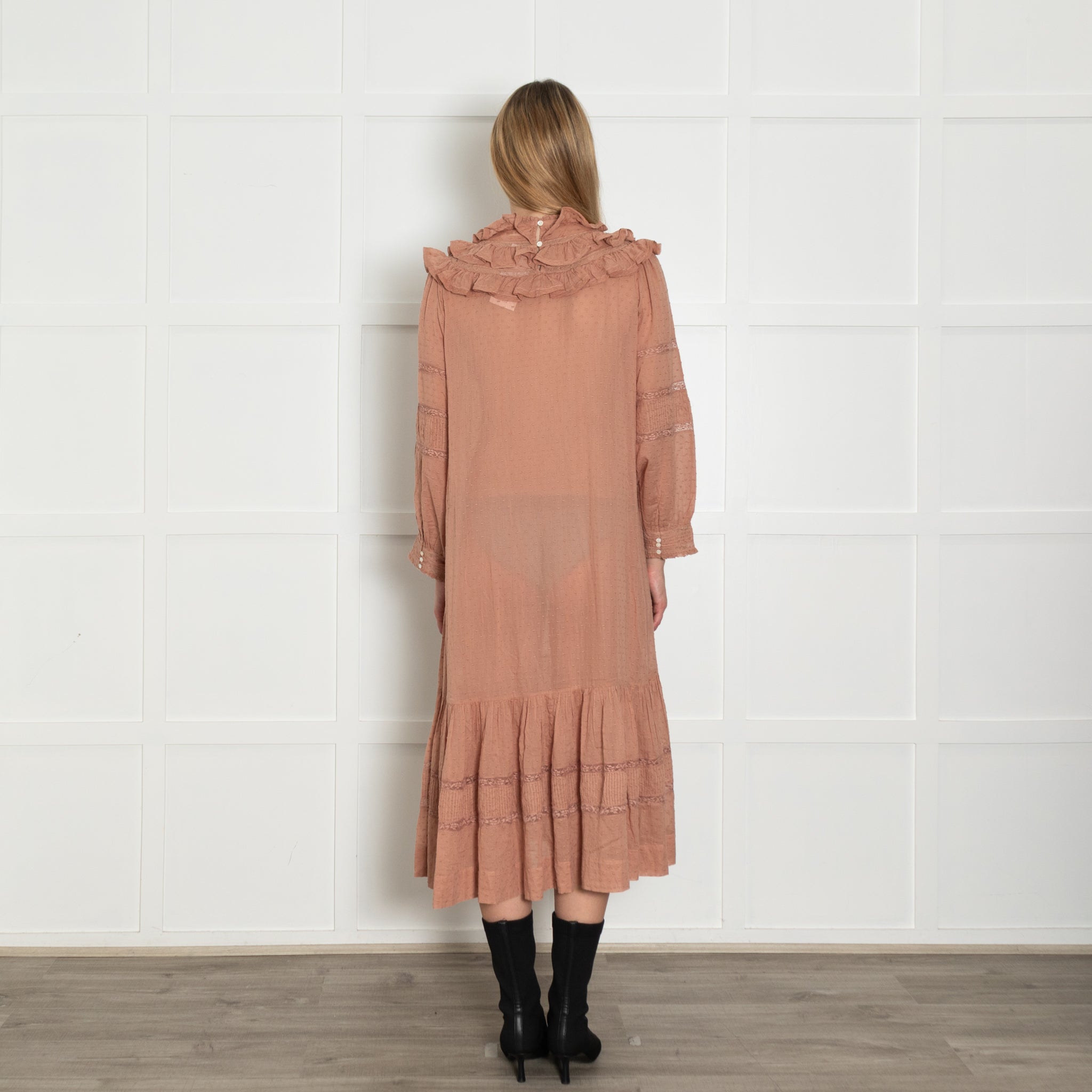 Doen blush cotton dress featuring a ruffled round neckline with frill detail. Designed with a ruffled hem and button fastening at the neck.