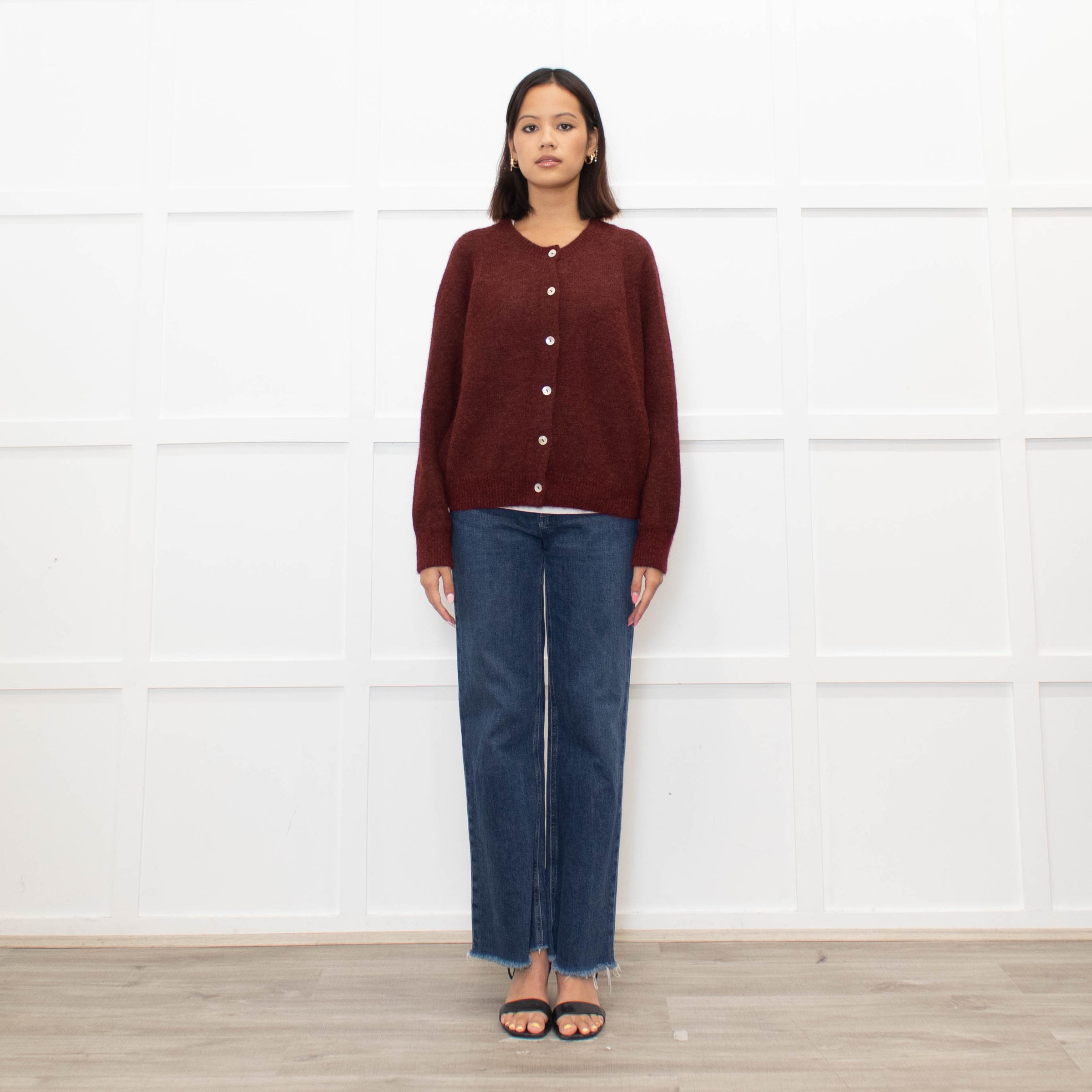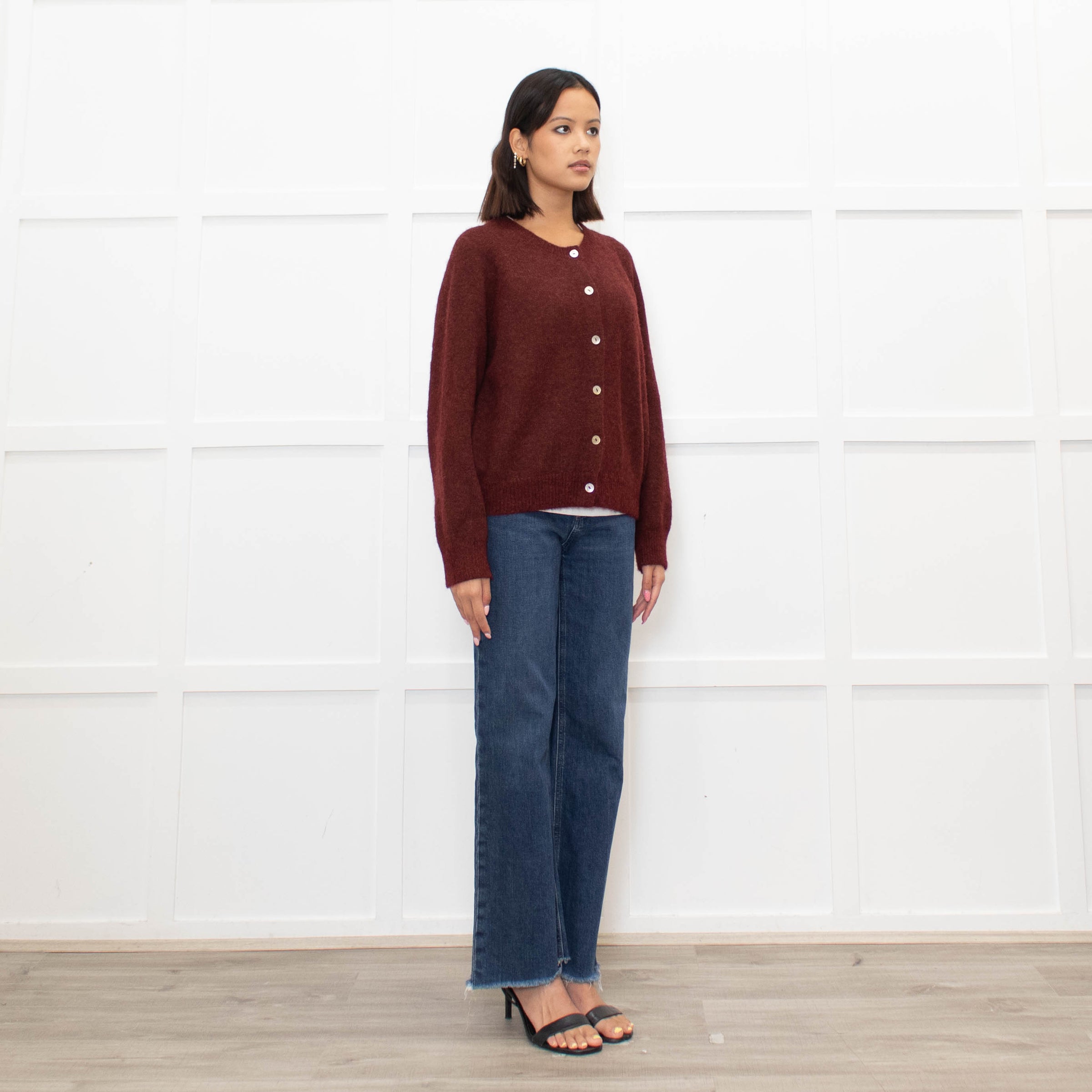 Doen burgundy alpaca wool blend cardigan with front button closure and a rounded neckline.