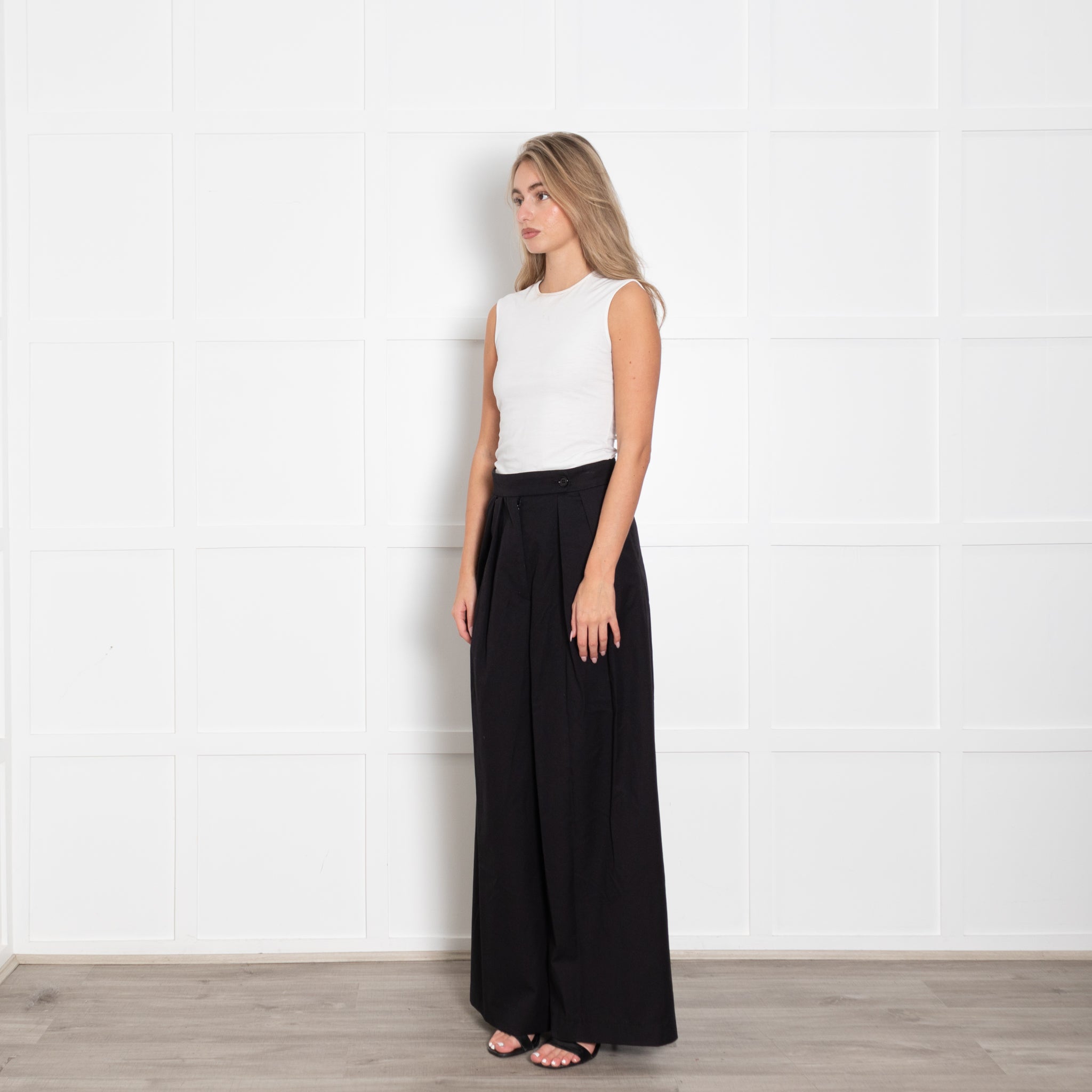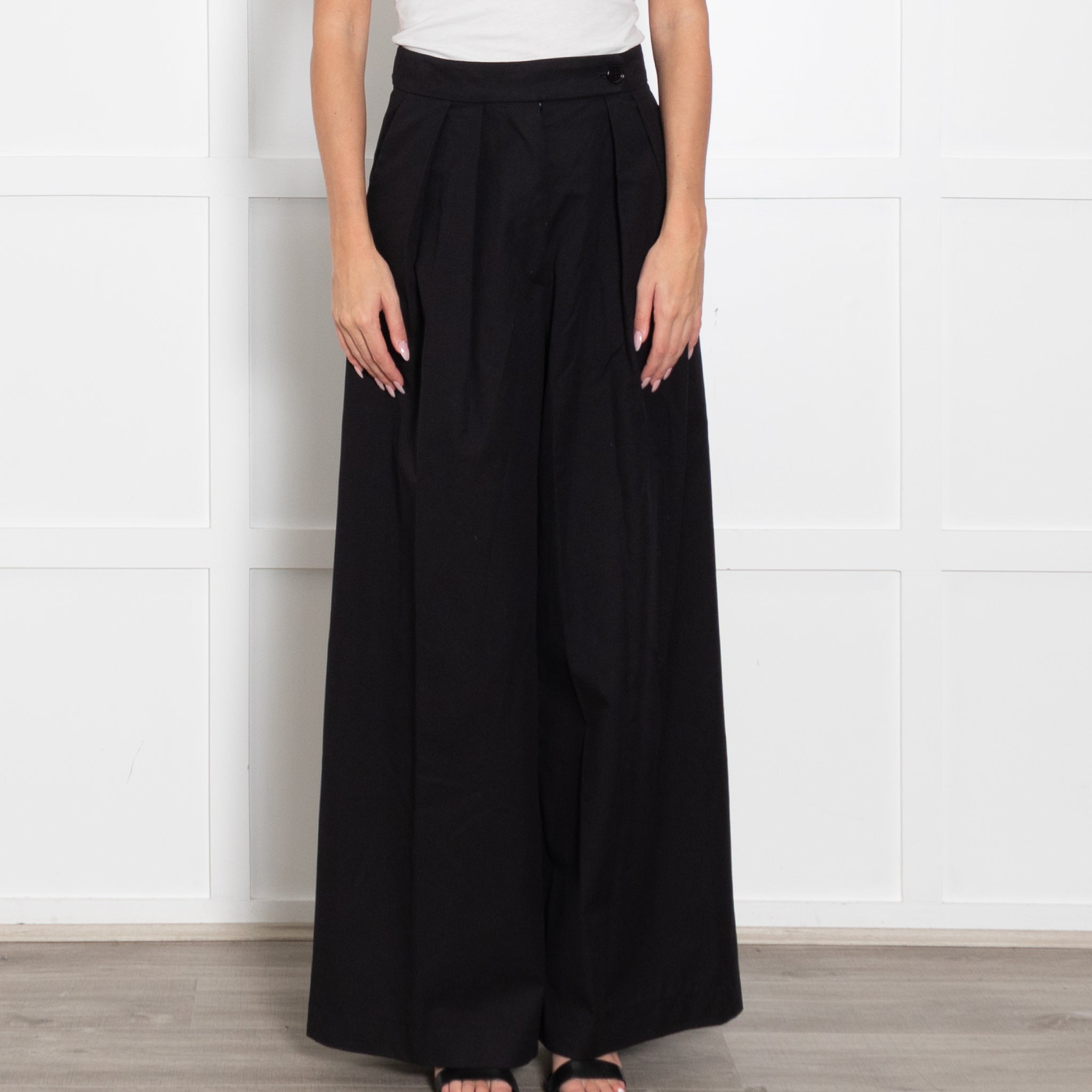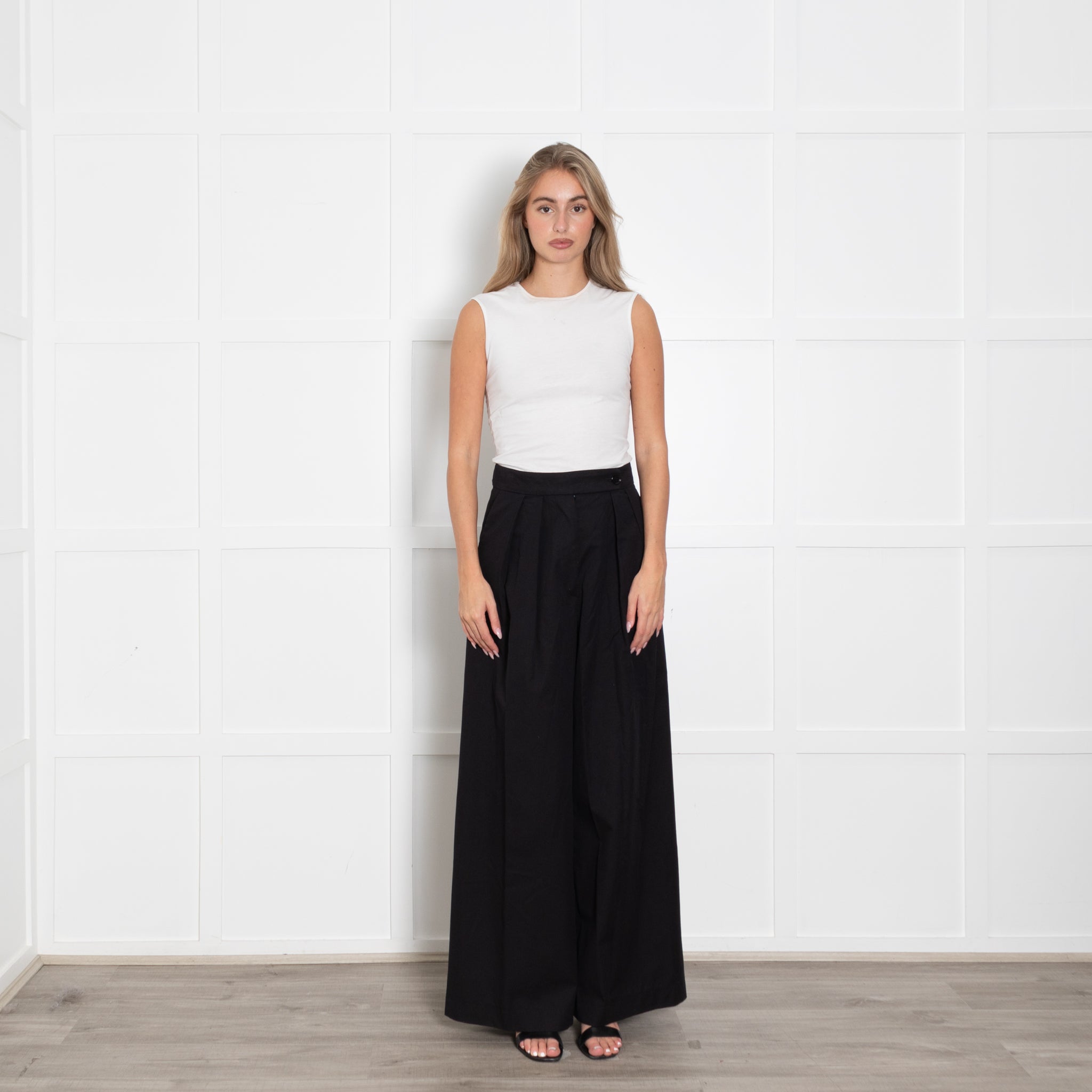 Dries Van Noten black high waist wide leg trousers featuring a pleated front and button up waistband closure.