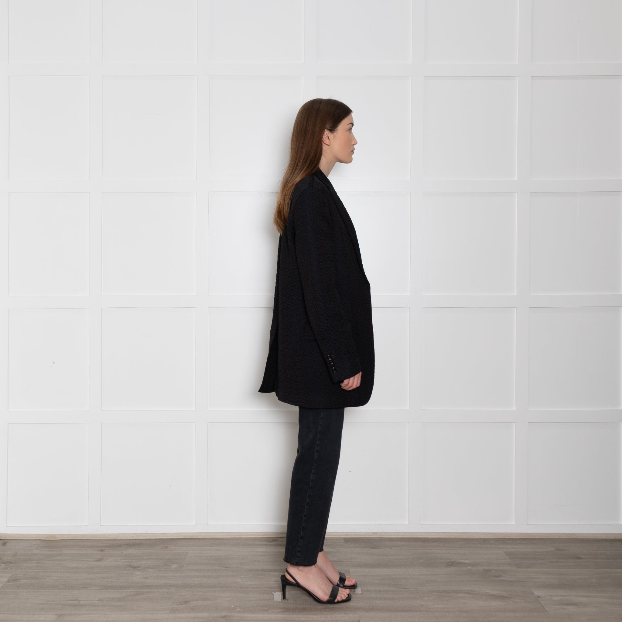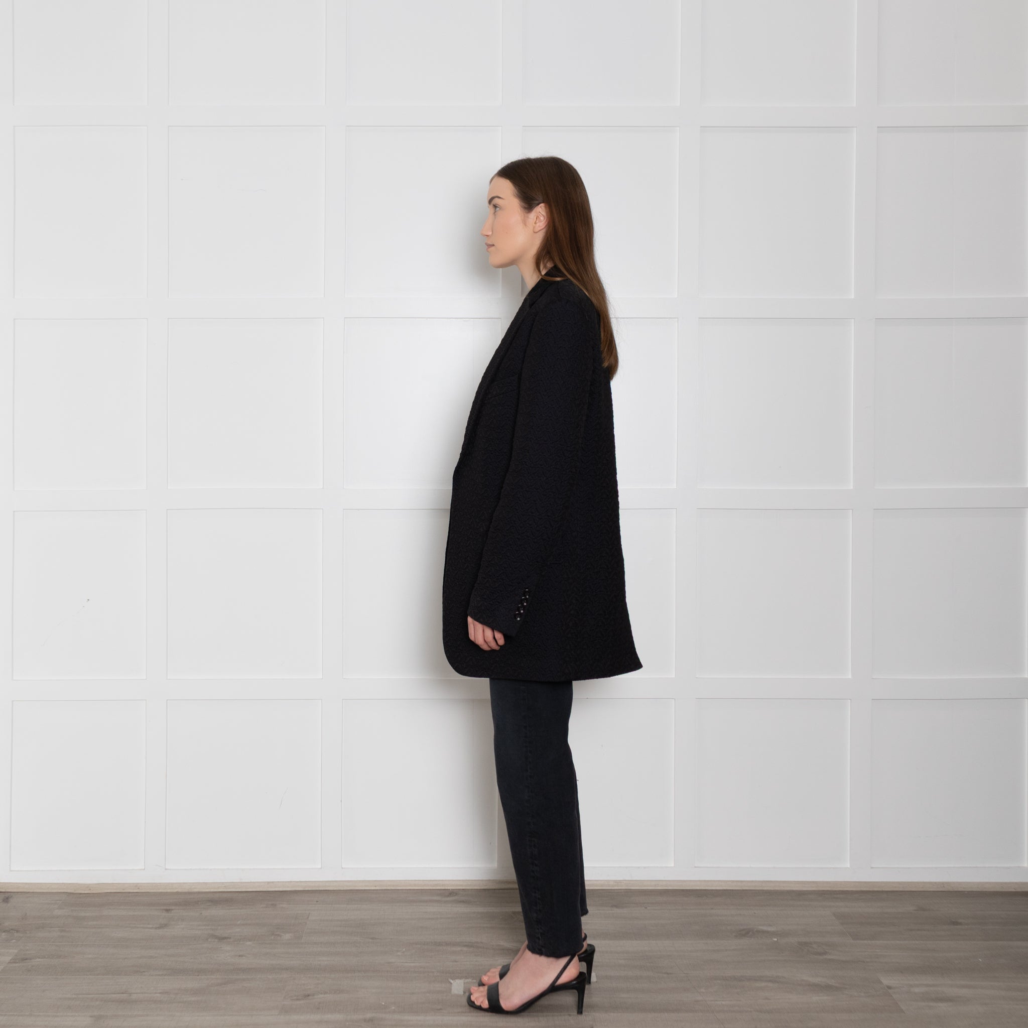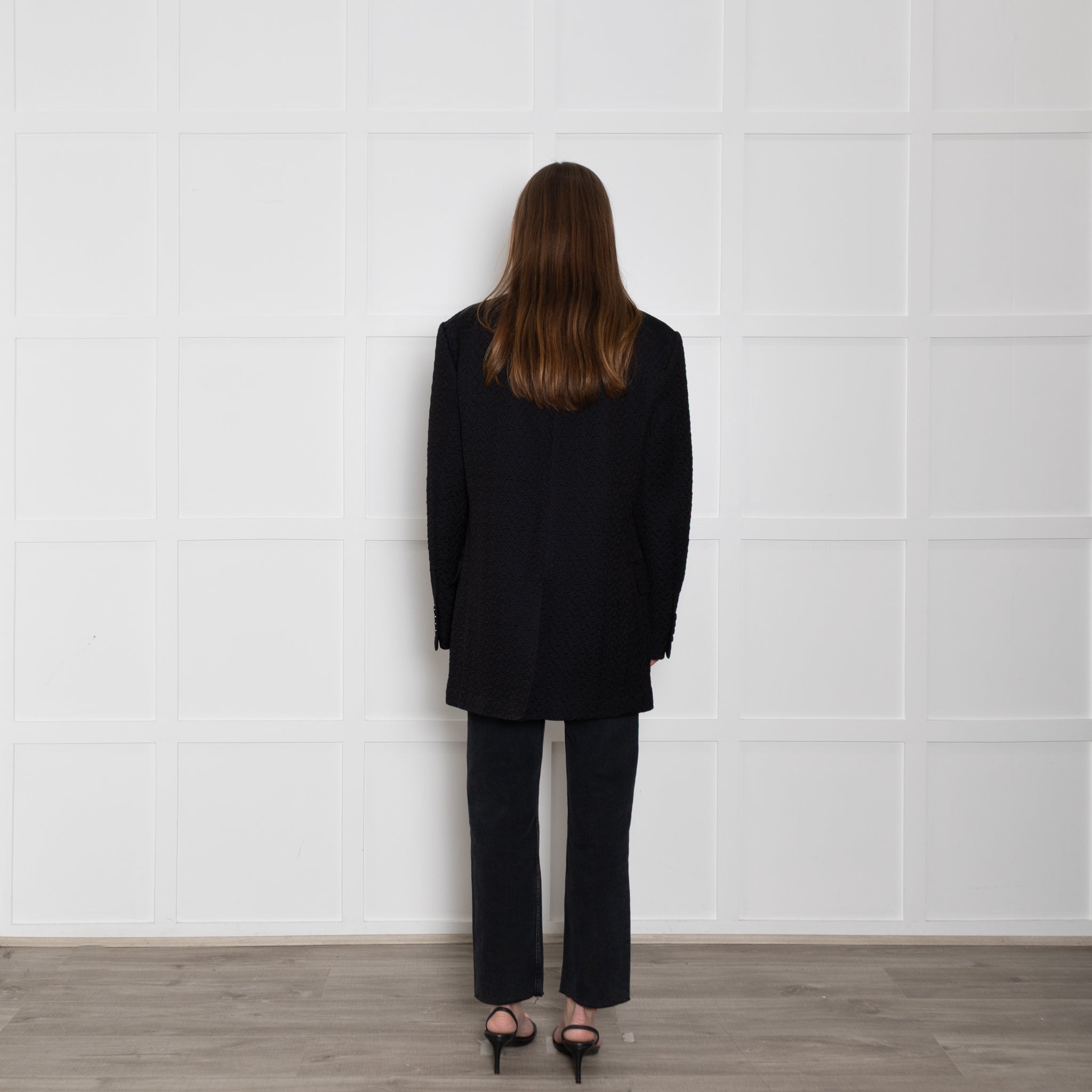 Dries Van Noten long-sleeve cotton navy blazer, featuring a stunning black textured design on the exterior, with a lovely black interior lining and two large front flap pockets.