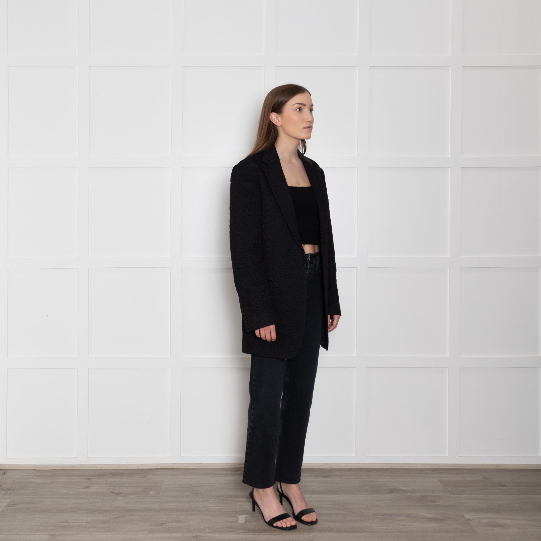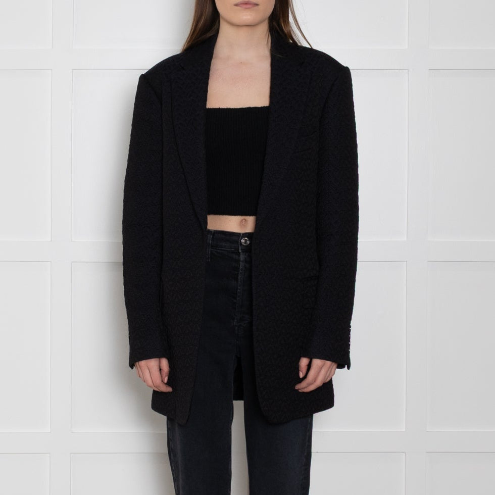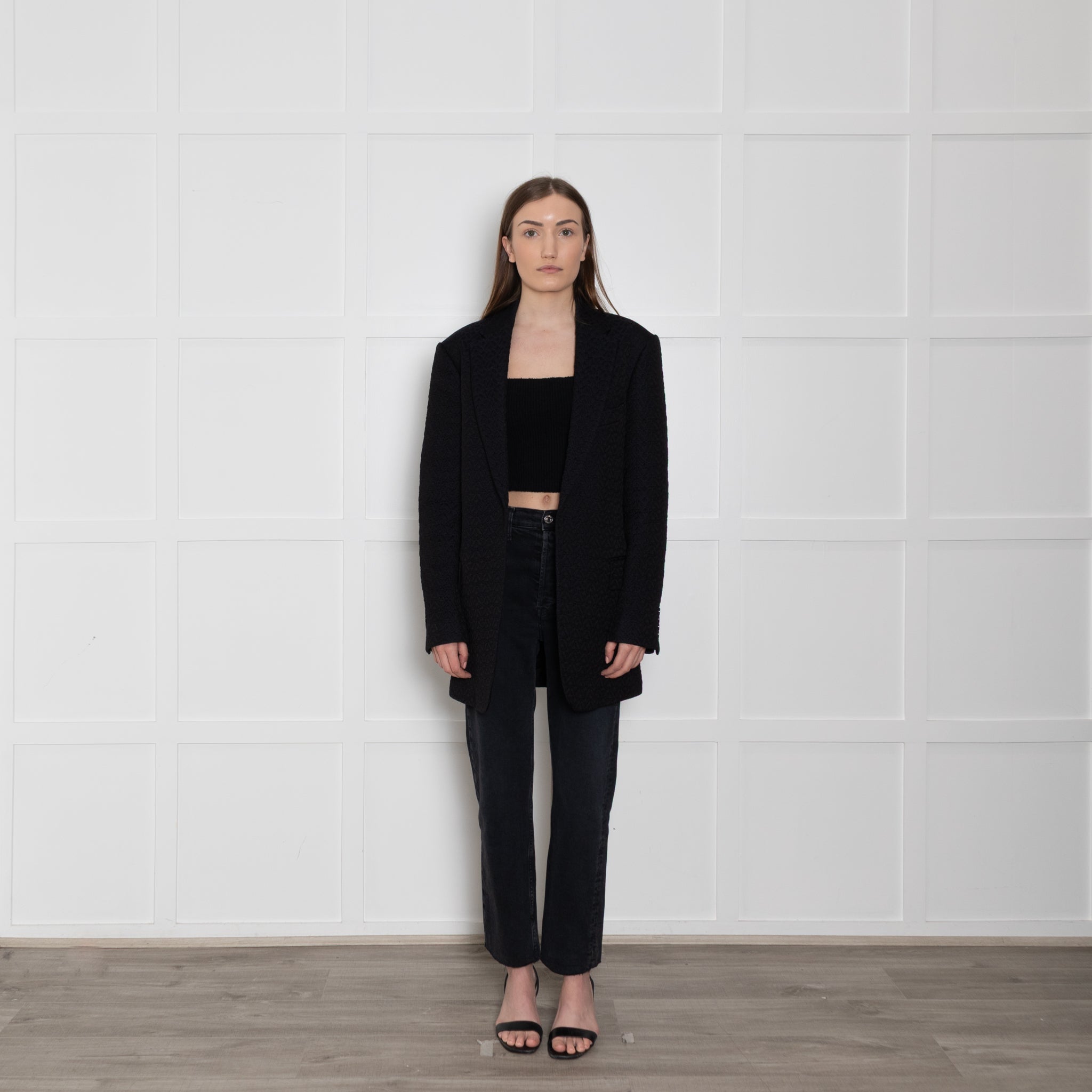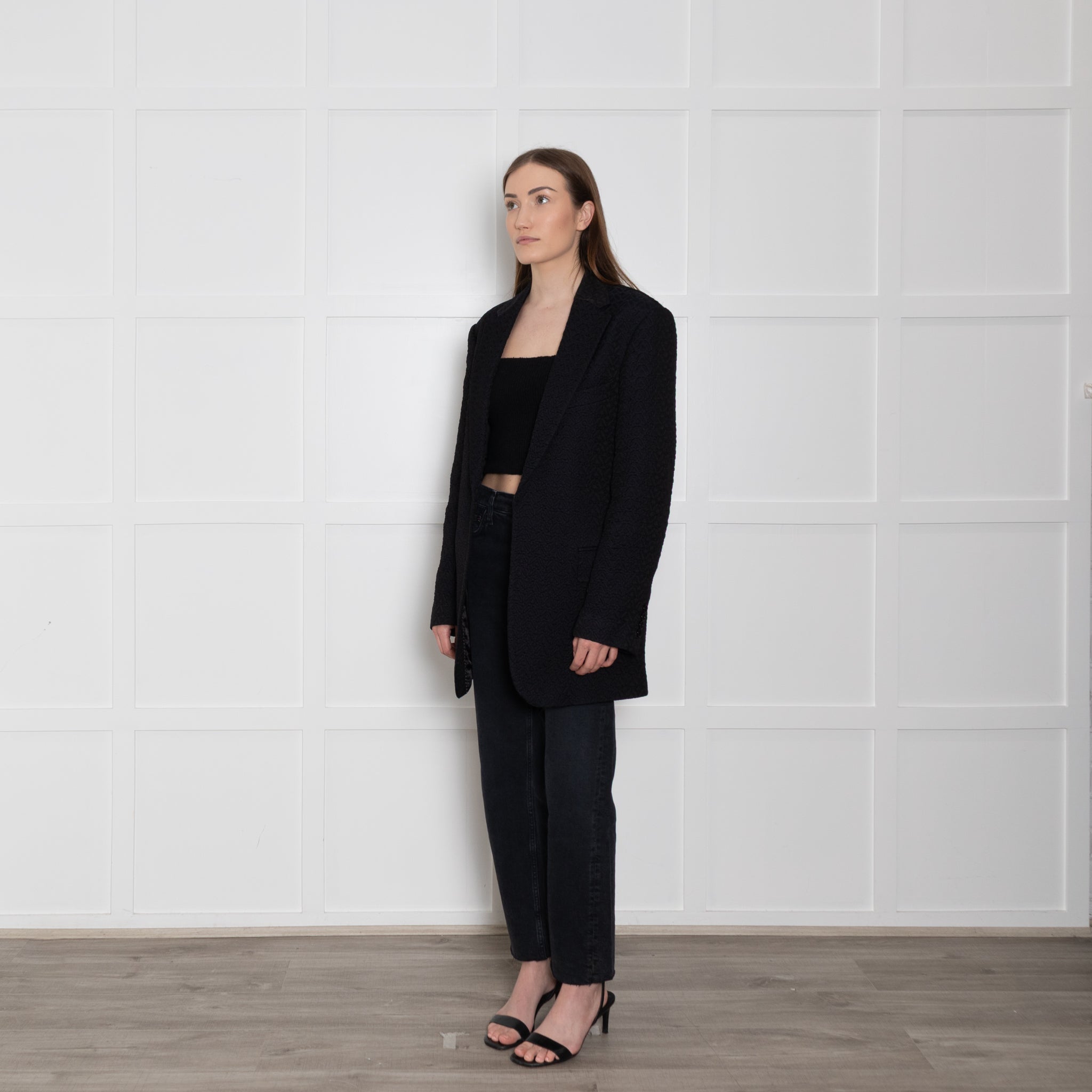Dries Van Noten long-sleeve cotton navy blazer, featuring a stunning black textured design on the exterior, with a lovely black interior lining and two large front flap pockets.