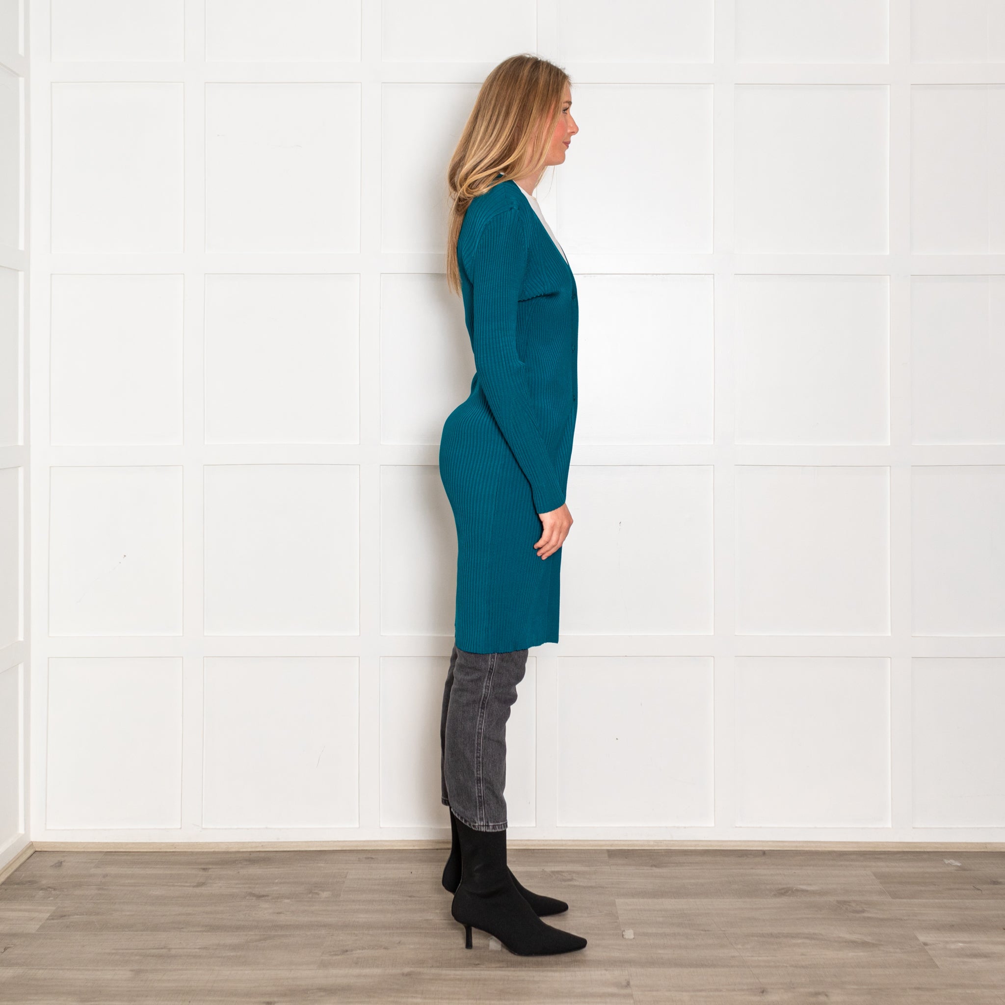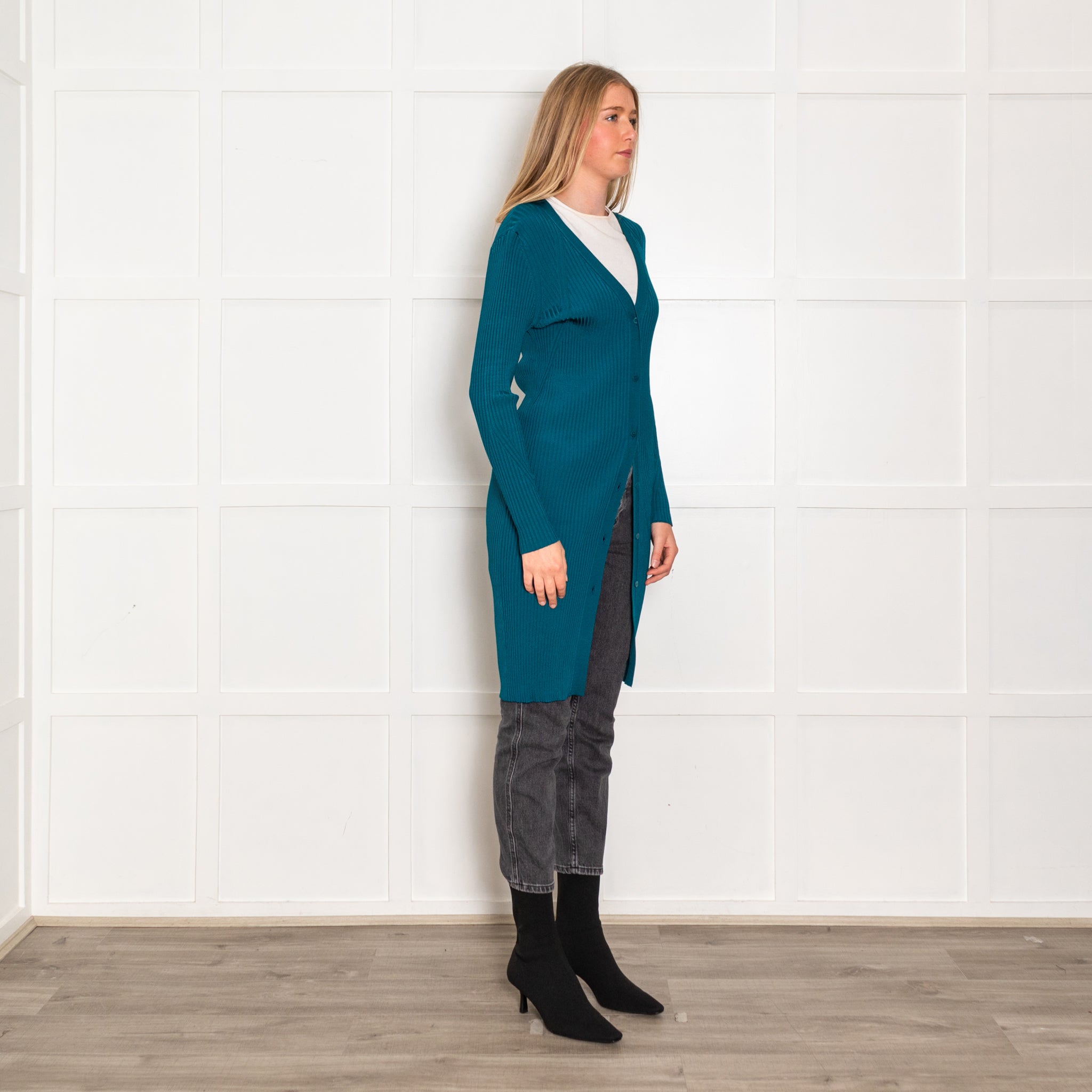 Diane Von Furstenberg long teal cardigan, featuring a button-up closure, a V-neckline and a stunning ribbed knitted design.