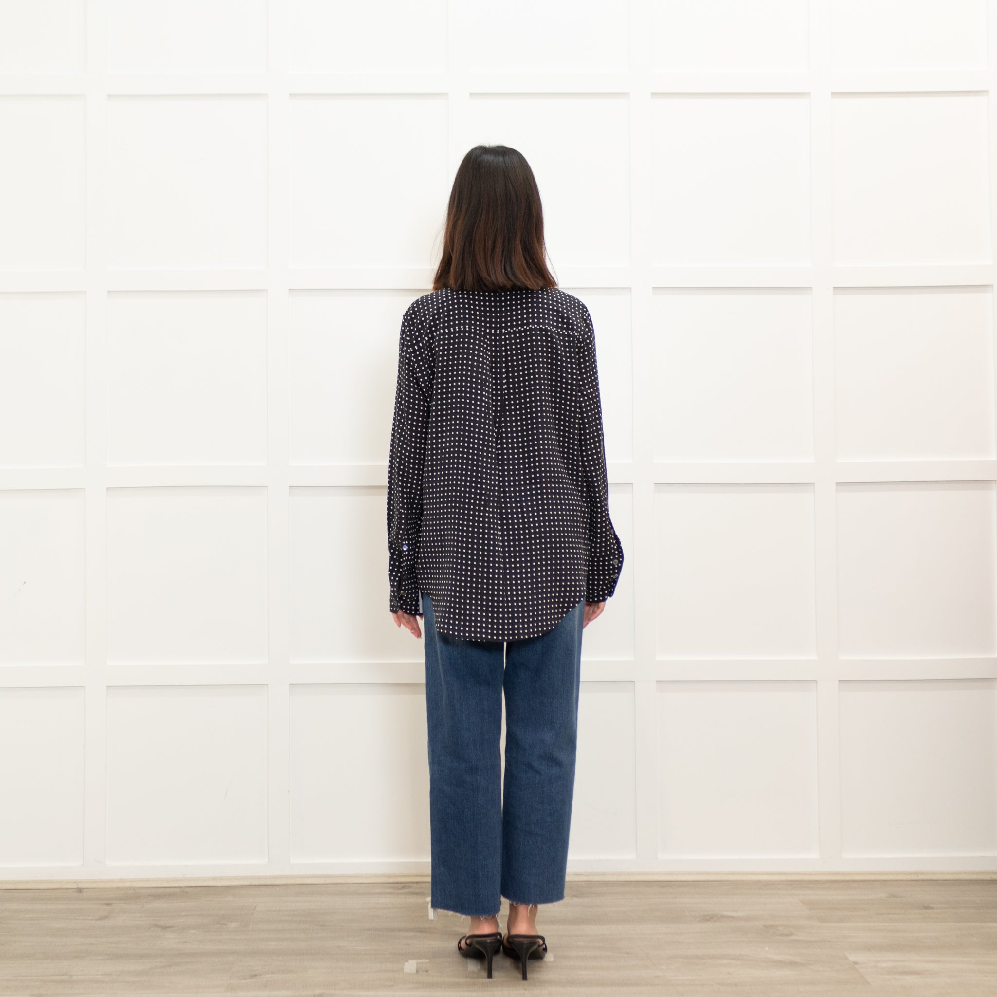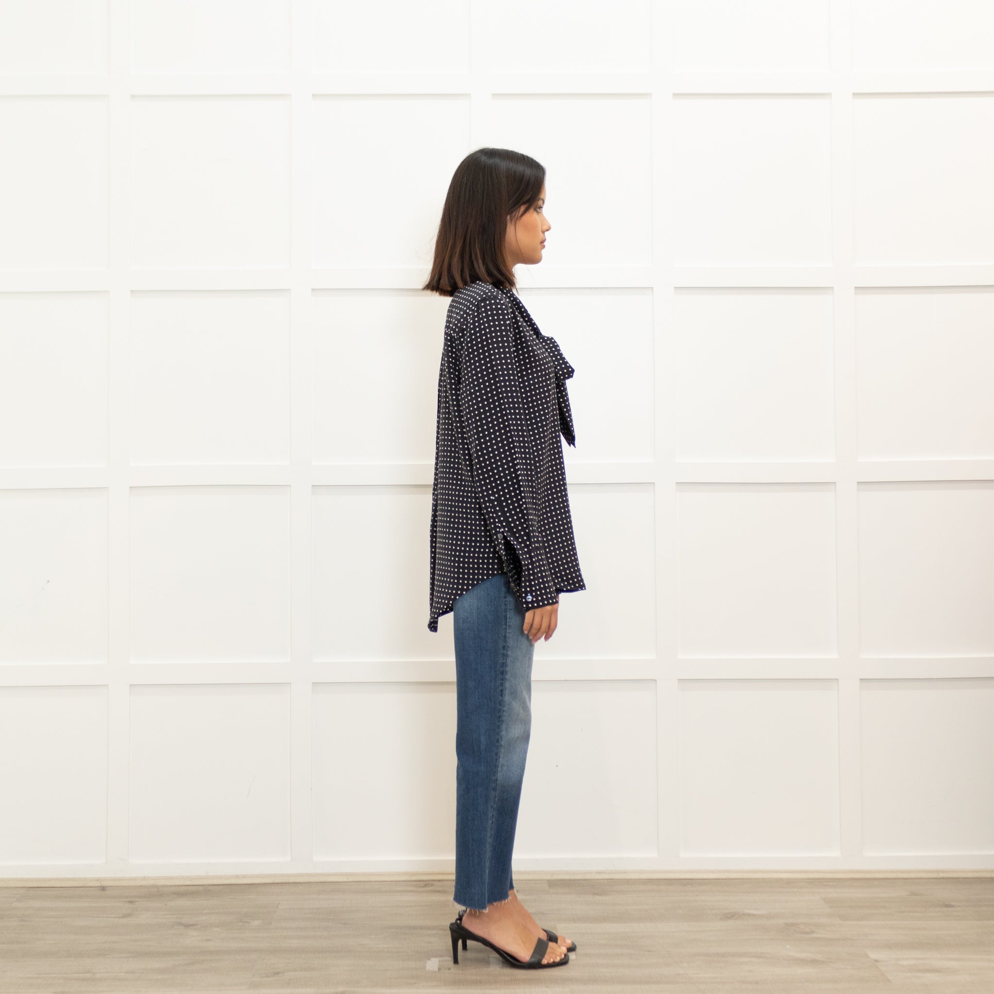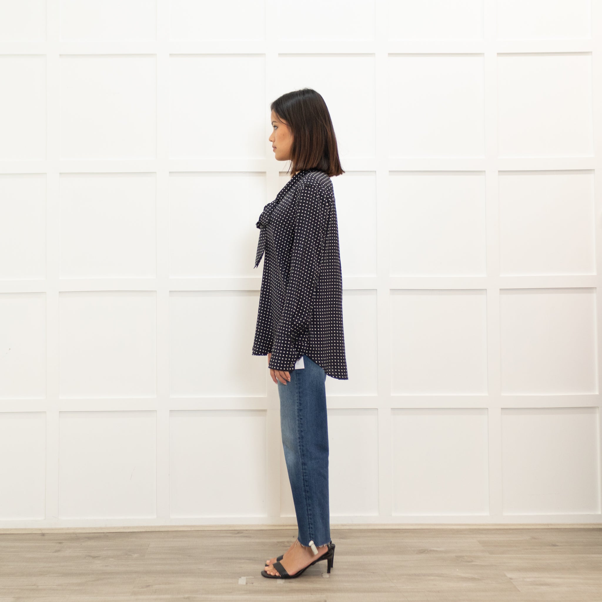 Equipment elegant long-sleeve black blouse, featuring a white polka dot design, a gorgeous neck tie, and a button-up front closure with a rounded neckline.