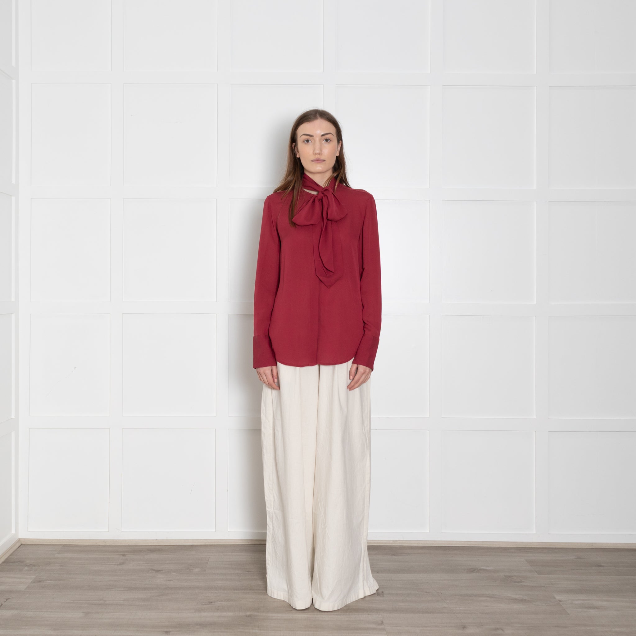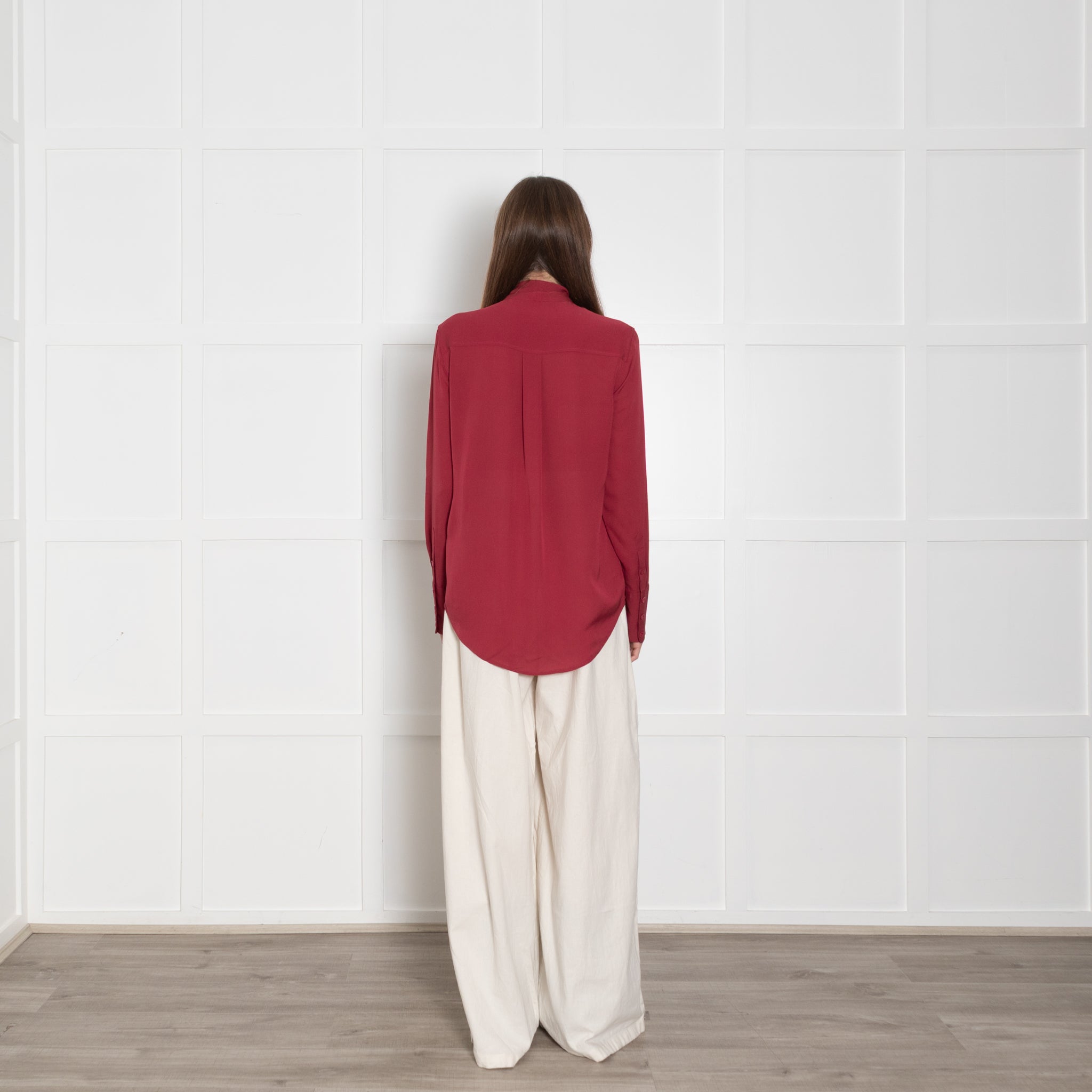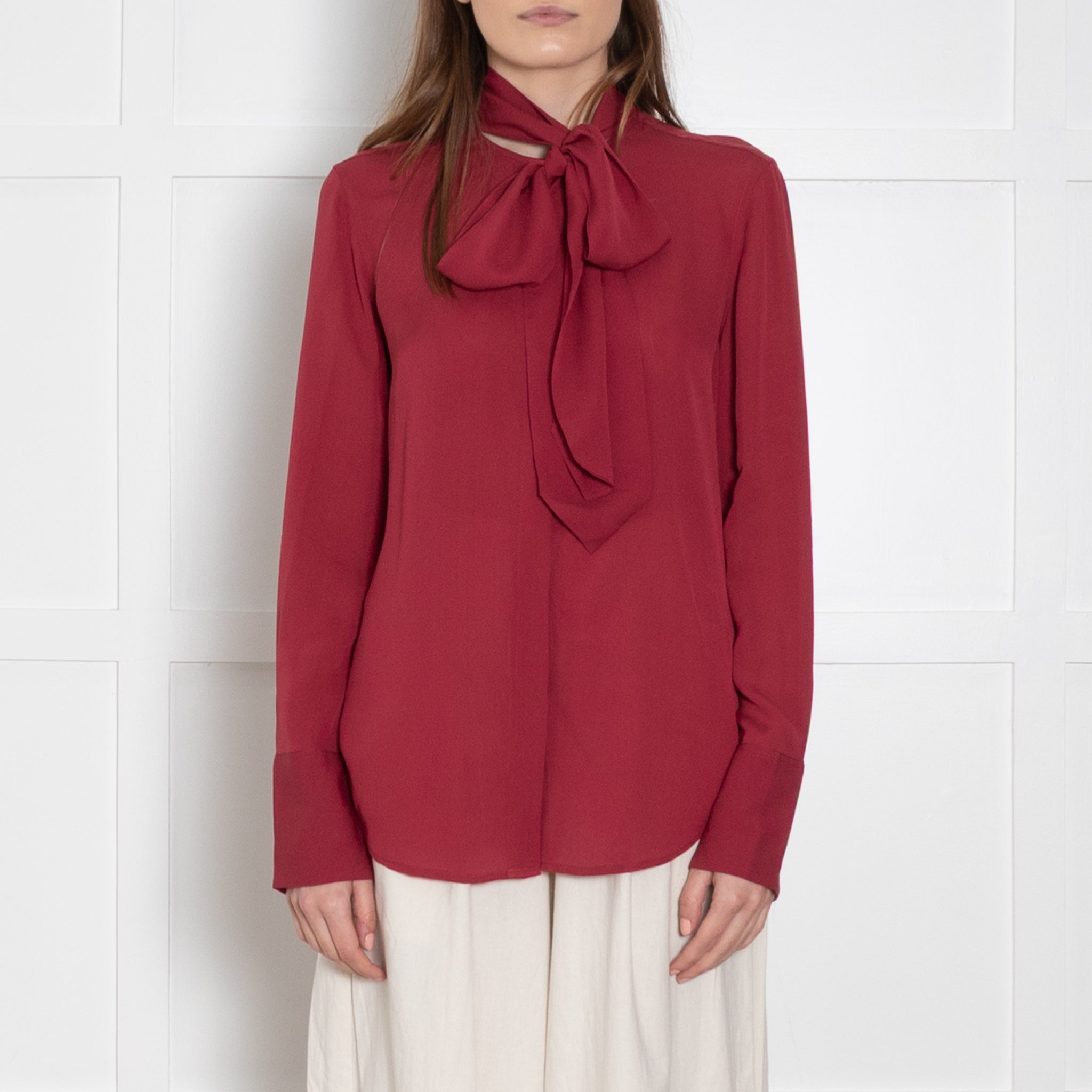 Equipment long-sleeve burgundy blouse, crafted with a soft silk fabric, featuring an elegant tie-neck design, and a button-up front closure.