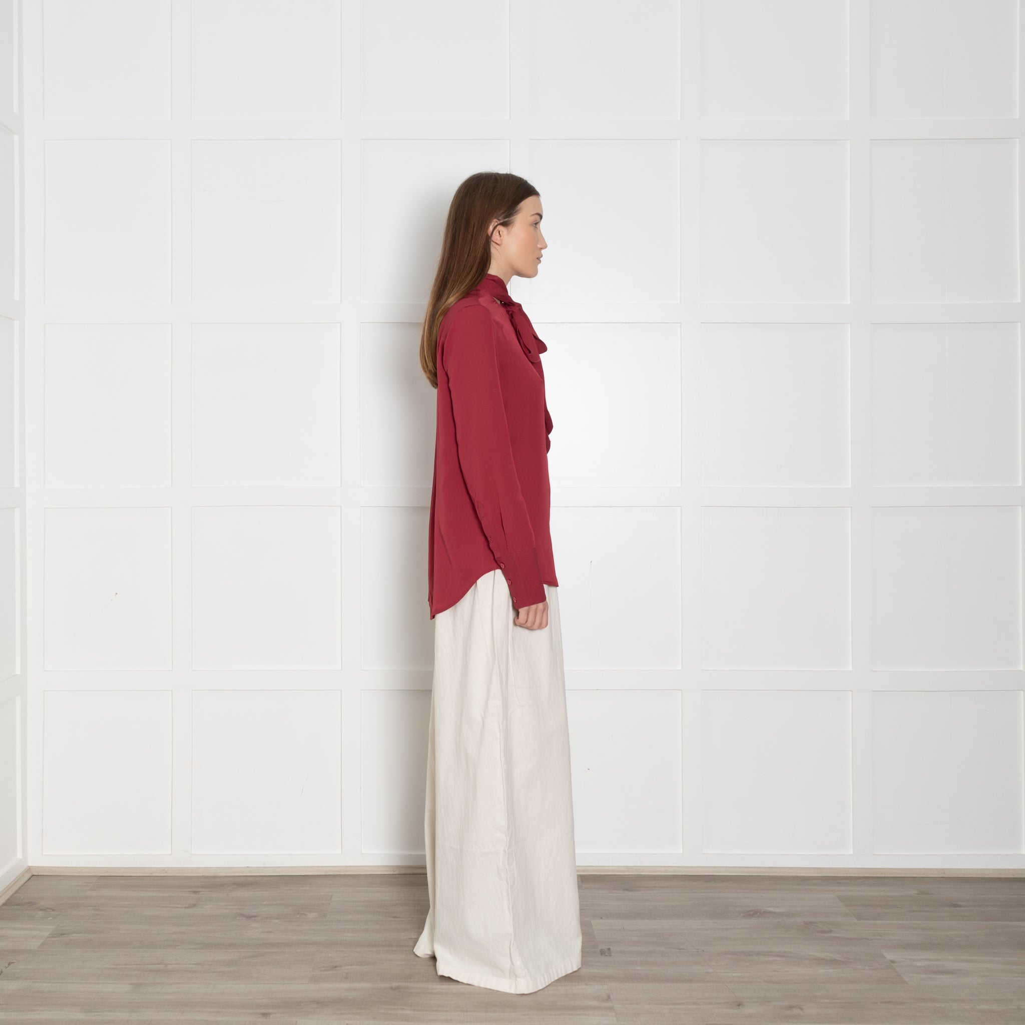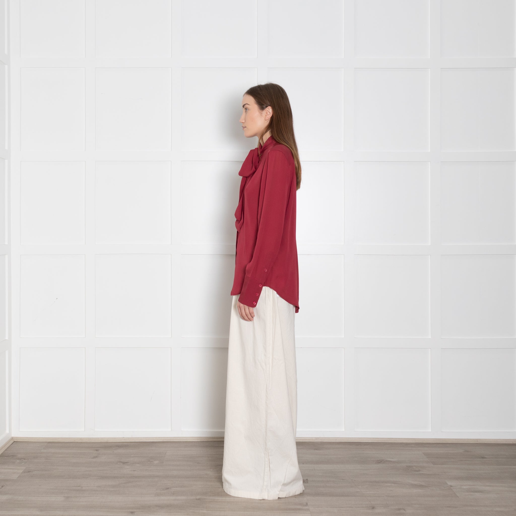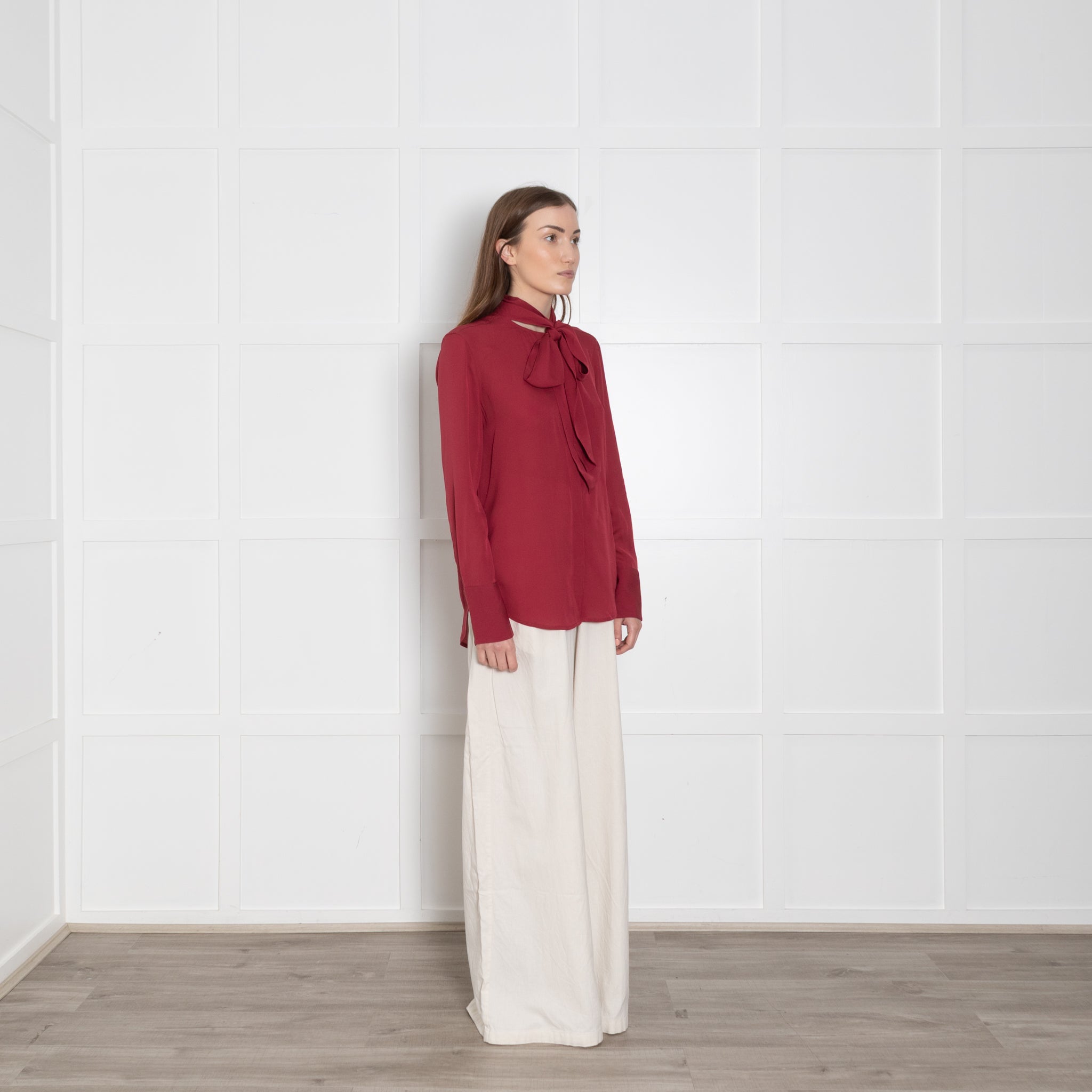 Equipment long-sleeve burgundy blouse, crafted with a soft silk fabric, featuring an elegant tie-neck design, and a button-up front closure.