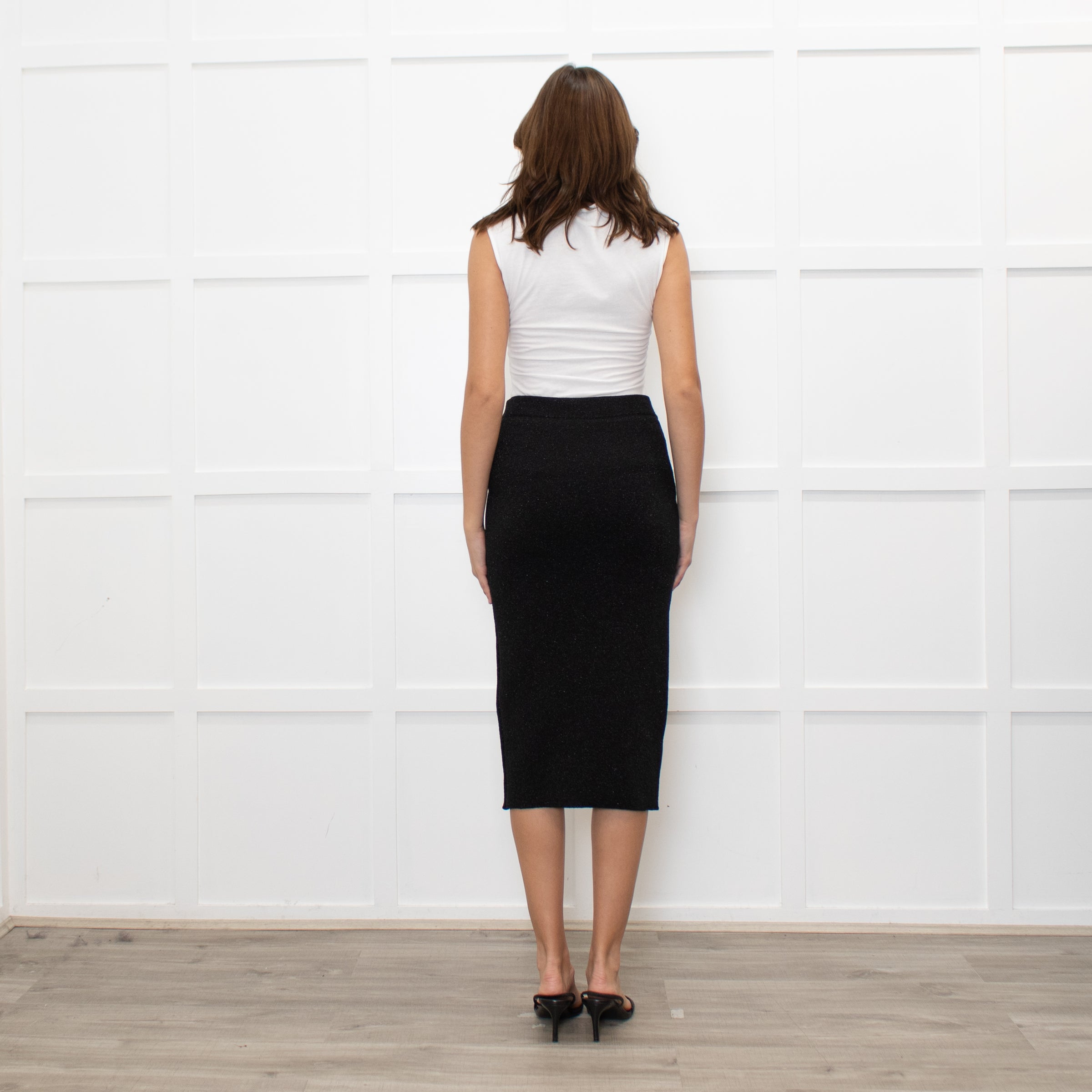 Essentiel Antwerp black metallic lurex knit skirt with an elasticated waistband and a full lining.
