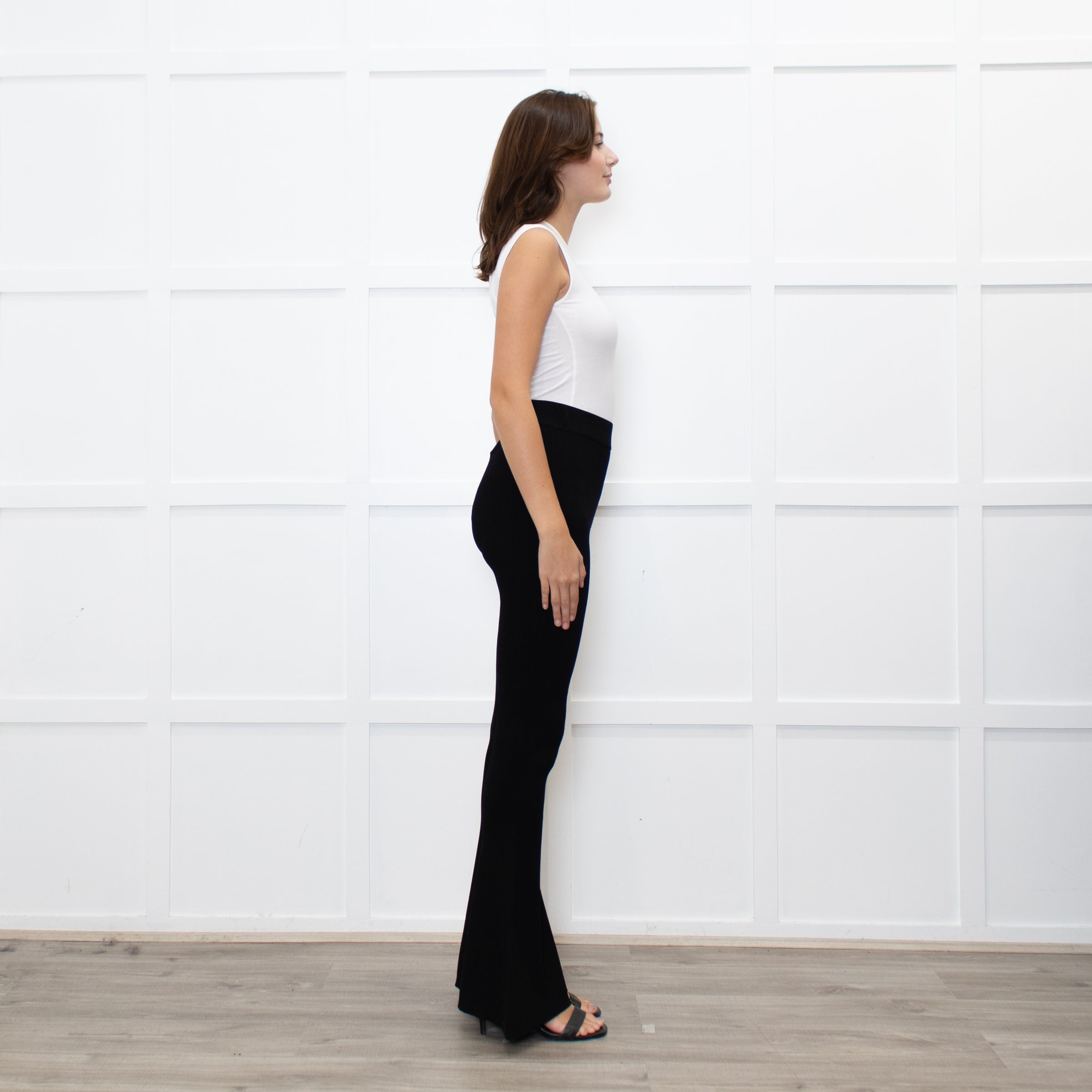 Essentiel Antwerp black ribbed knit flared leggings with an elasticated waist and a bootcut fit.