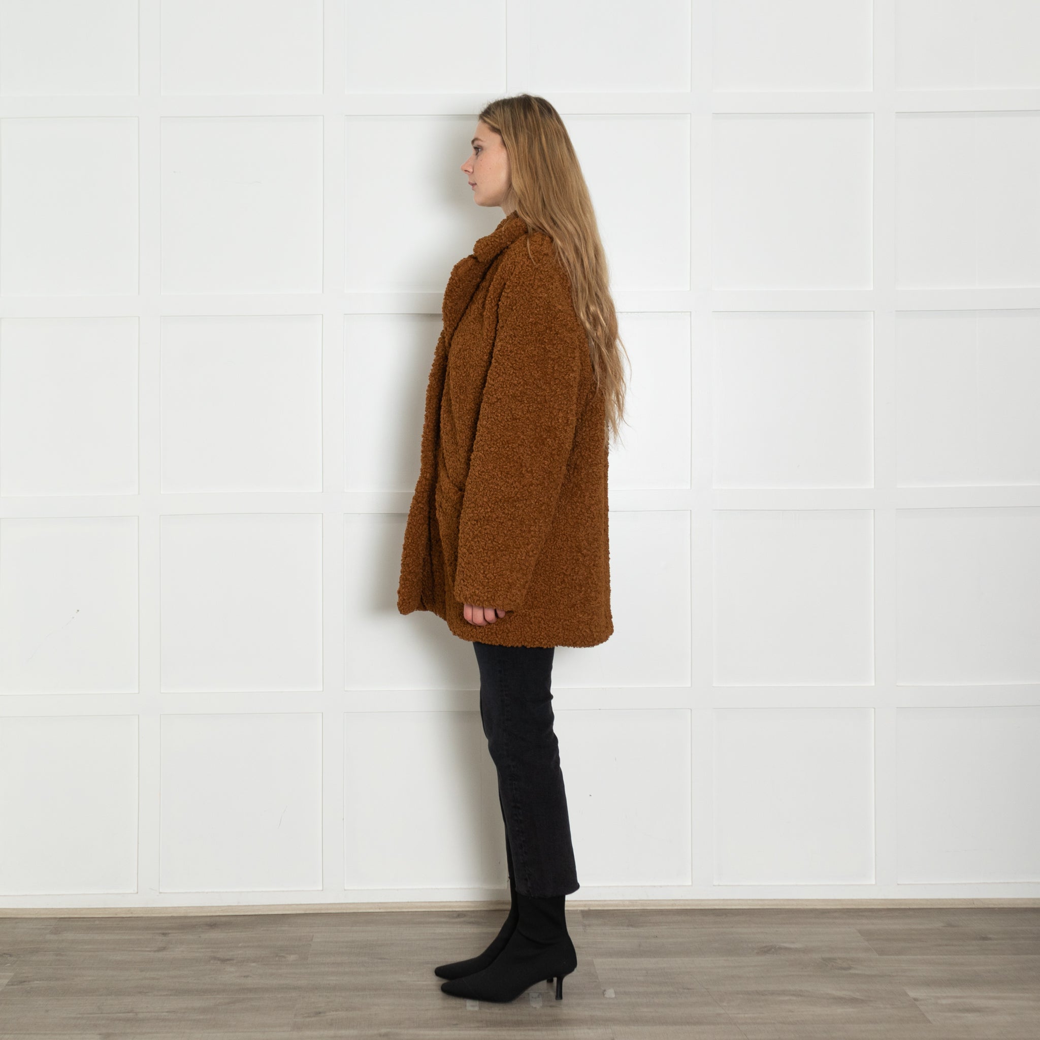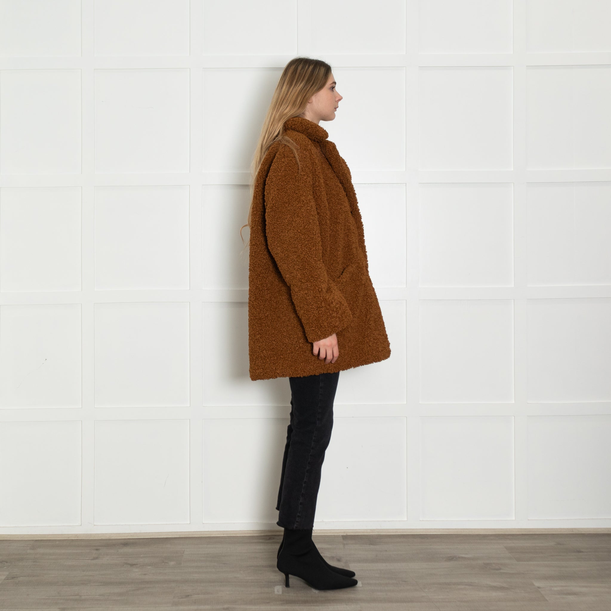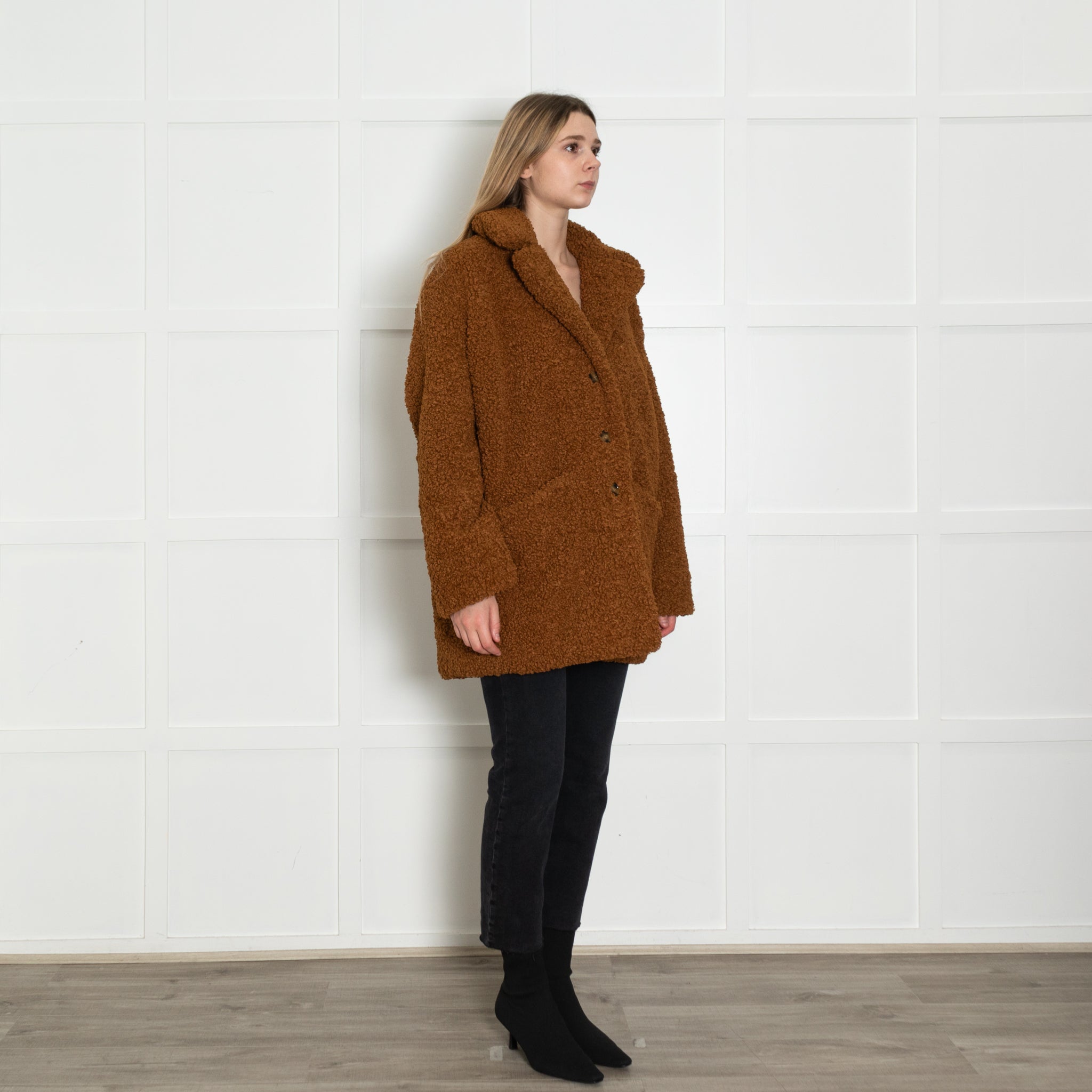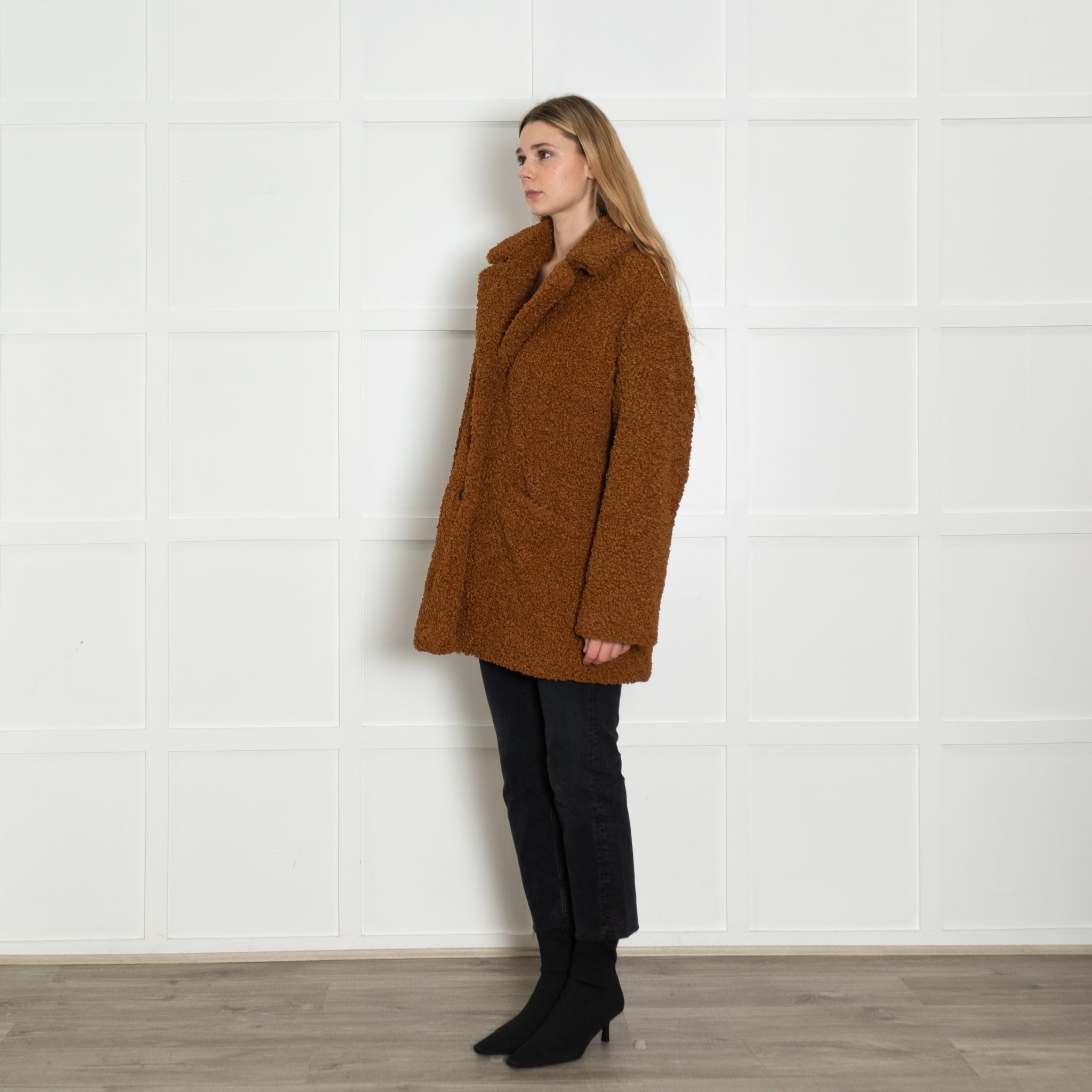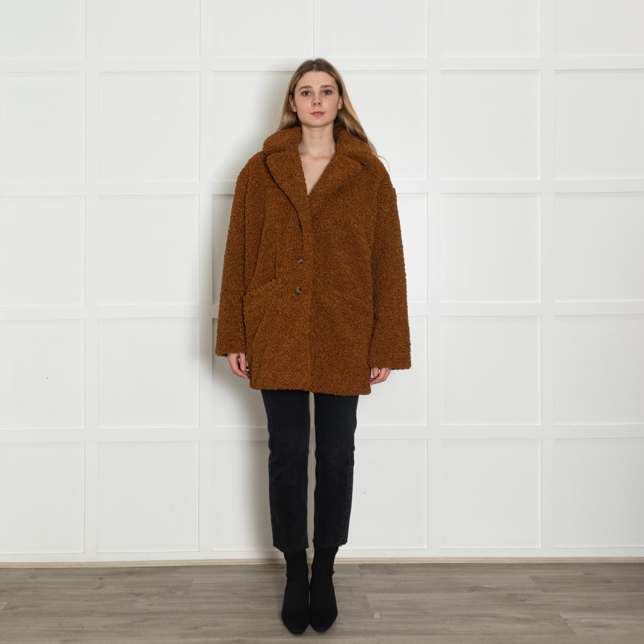Essentiel Antwerp long-sleeve, long tan brown coat, featuring a stunning teddy style design, with a large collar, a brown button-up front, as well as two front pockets.