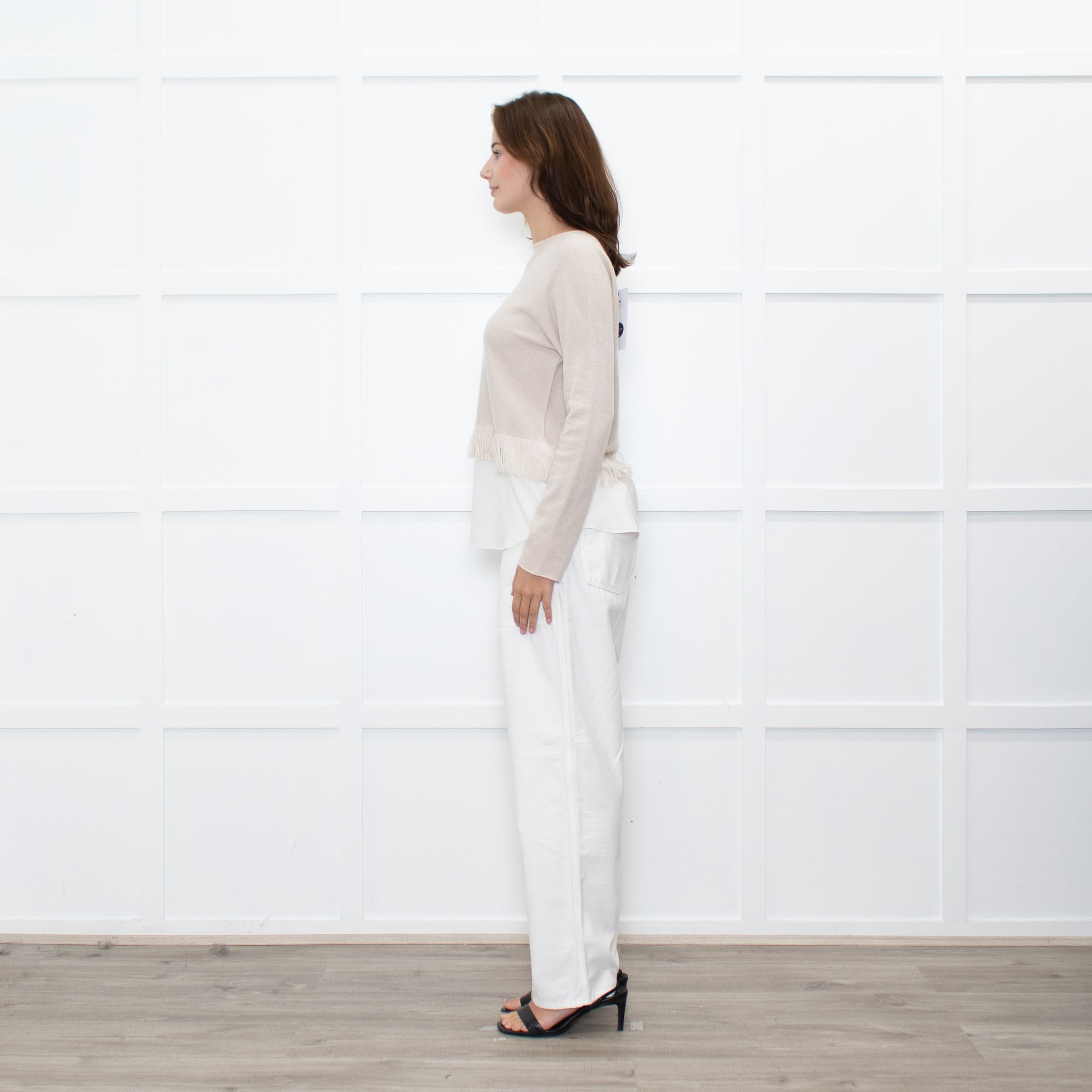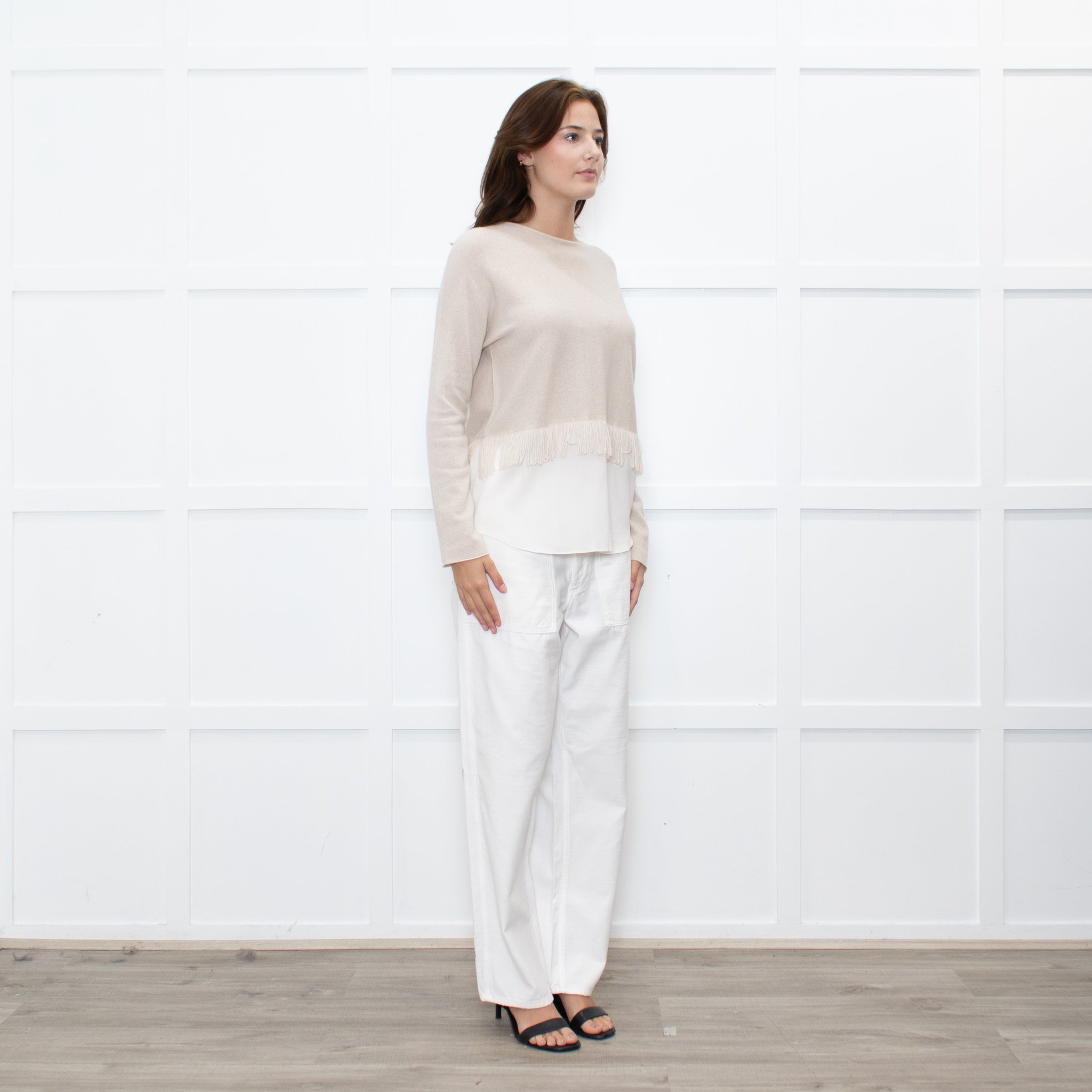 Fabiana Filippi beige long-sleeved sweater crafted from a silk and elastane blend. Designed with a relaxed fit, subtle fringe detailing at the waist, and a classic crew neckline.