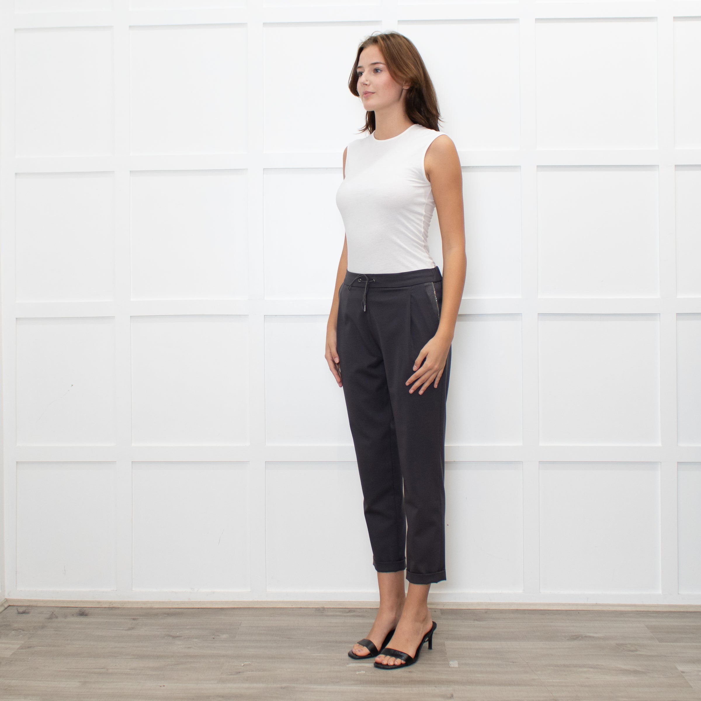 Fabiana Filippi grey wool draw-string trousers with a contrast silver diamante side strip, slip pockets, and an elasticated waist band.