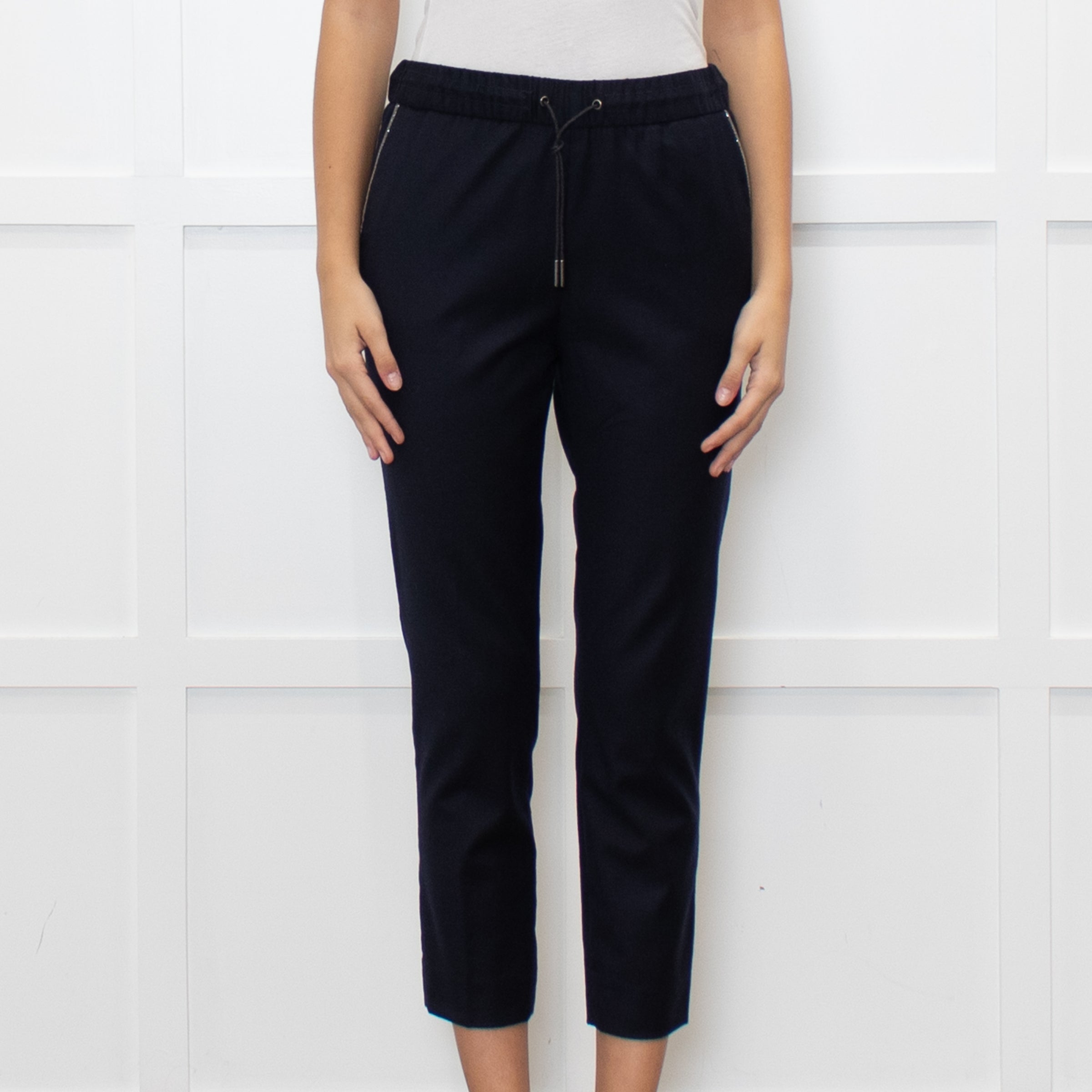 Fabiana Filippi navy wool draw-string trousers with a contrast silver diamante side strip, slip pockets, and an elasticated waist band.