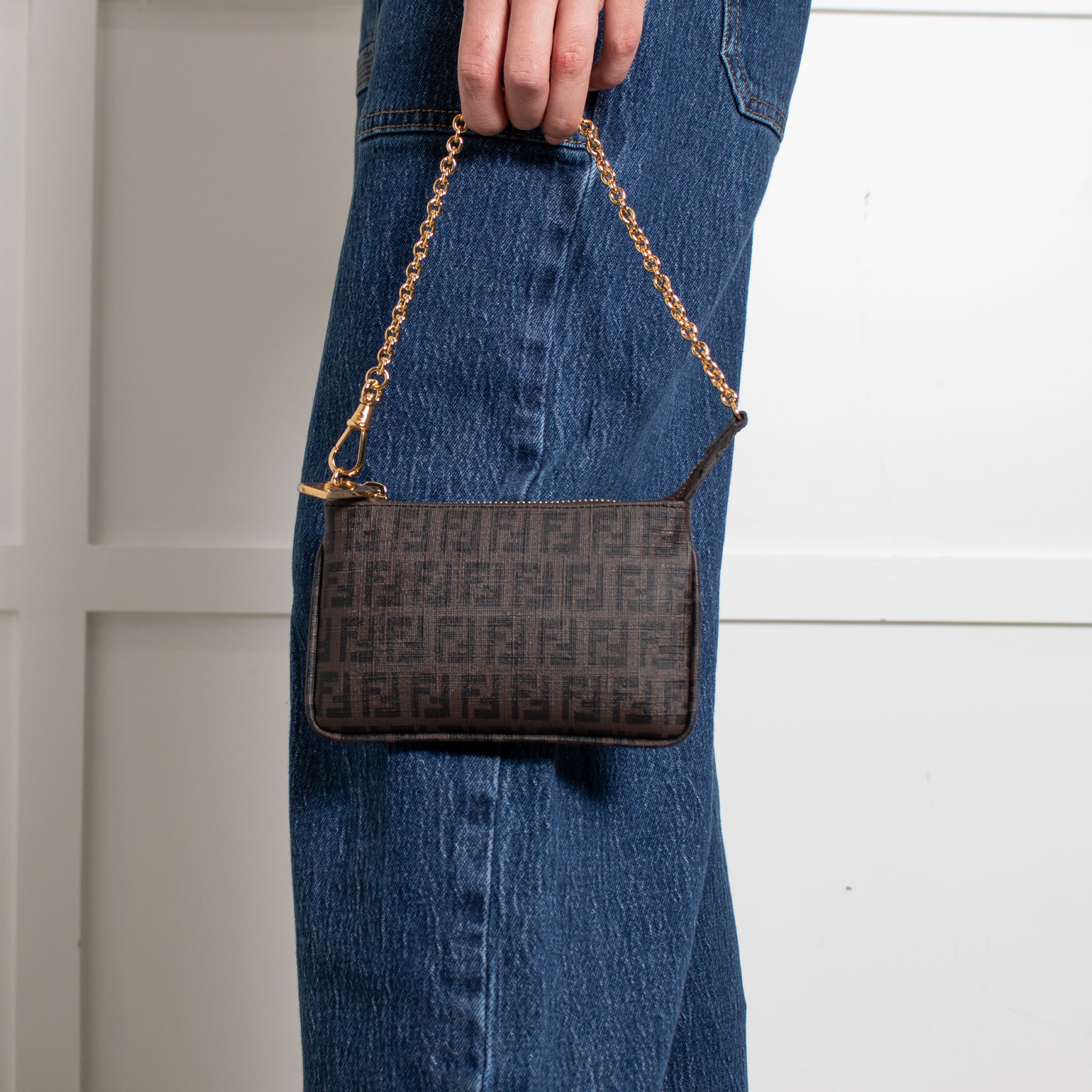 Fendi Zucchino Spalmati chain mini flat pochette with gold-tone hardware, a small chain strap, and top zip closure with logo embossed detailing. New with tags.
