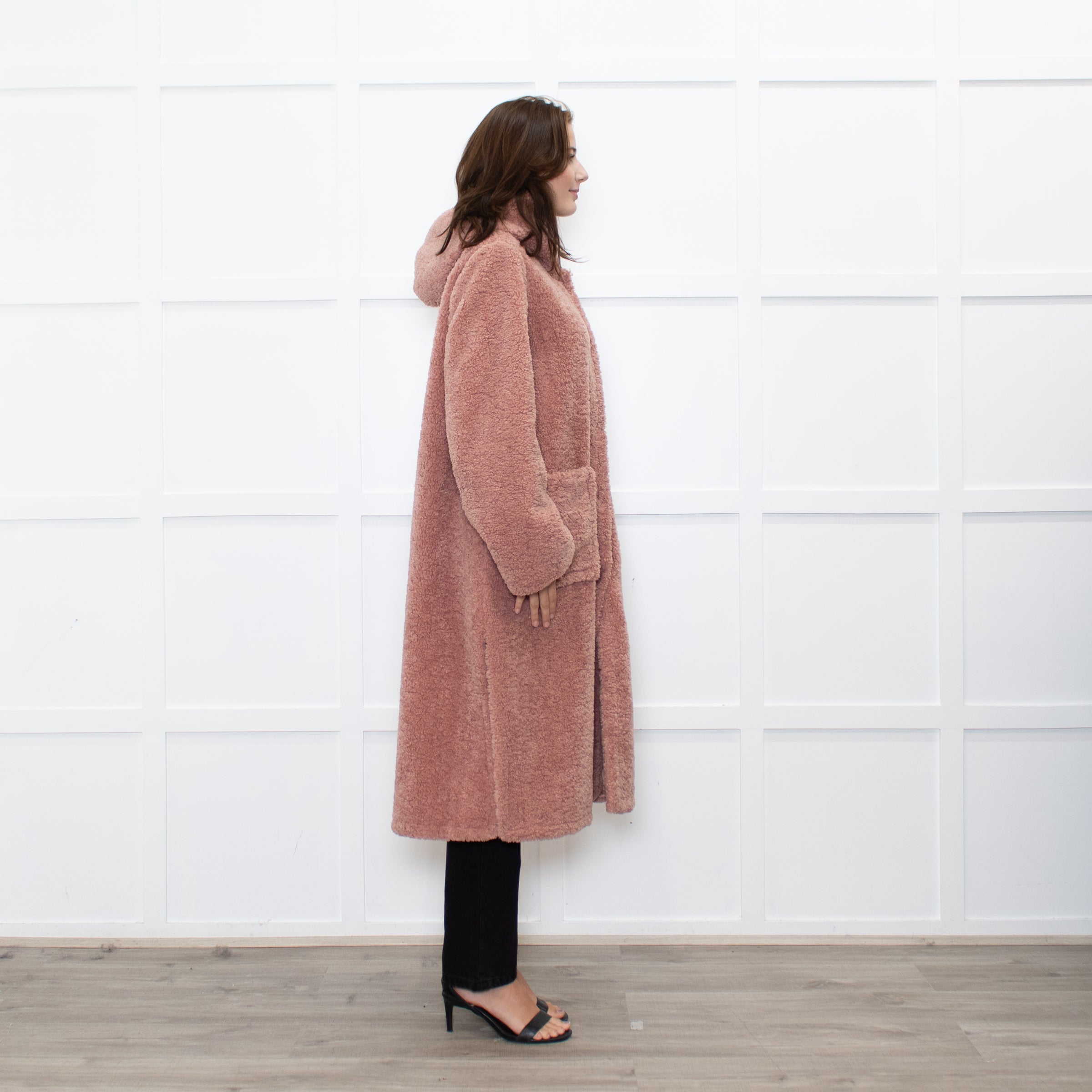 Forte Forte blush pink faux fur long teddy coat with a built-in hood, long sleeves, and patch pockets.