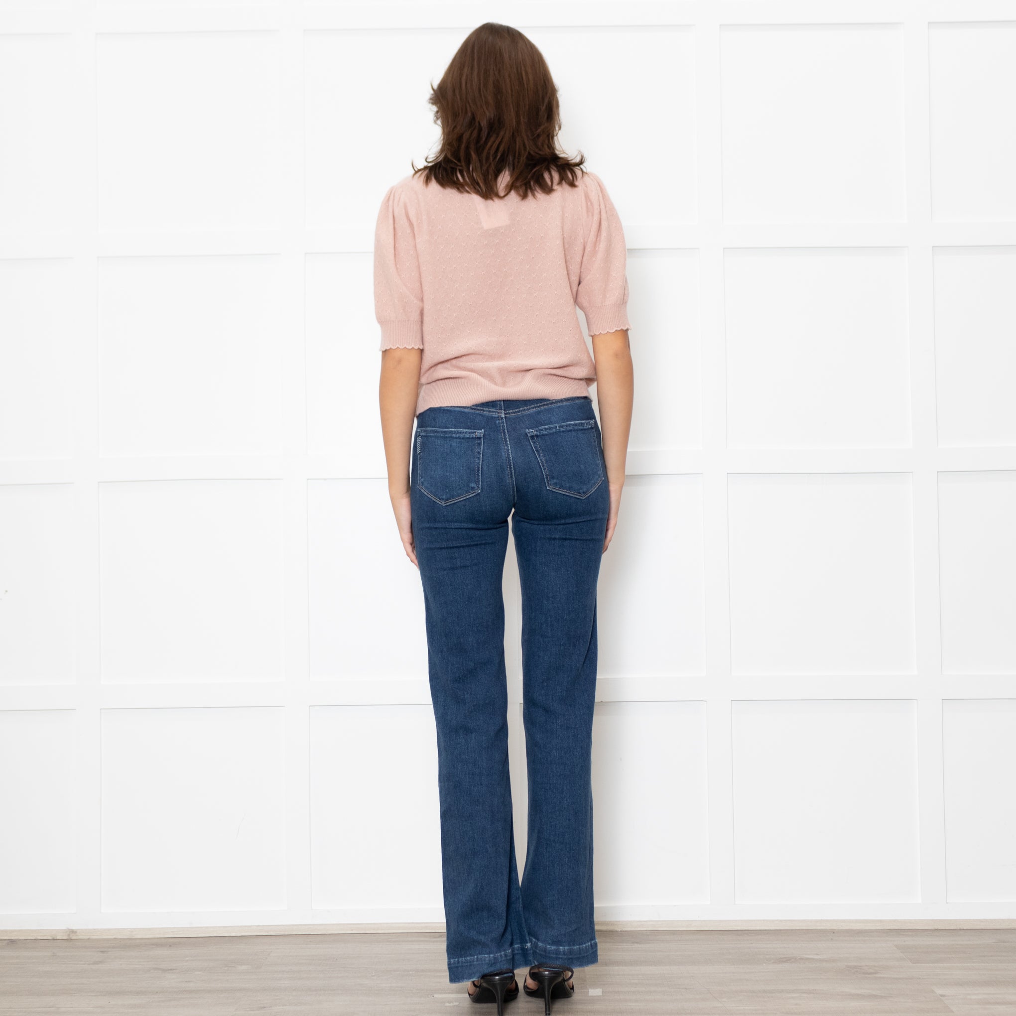 Frame pink cashmere short-sleeve jumper with a round neck. Stitch detailing pattern.
