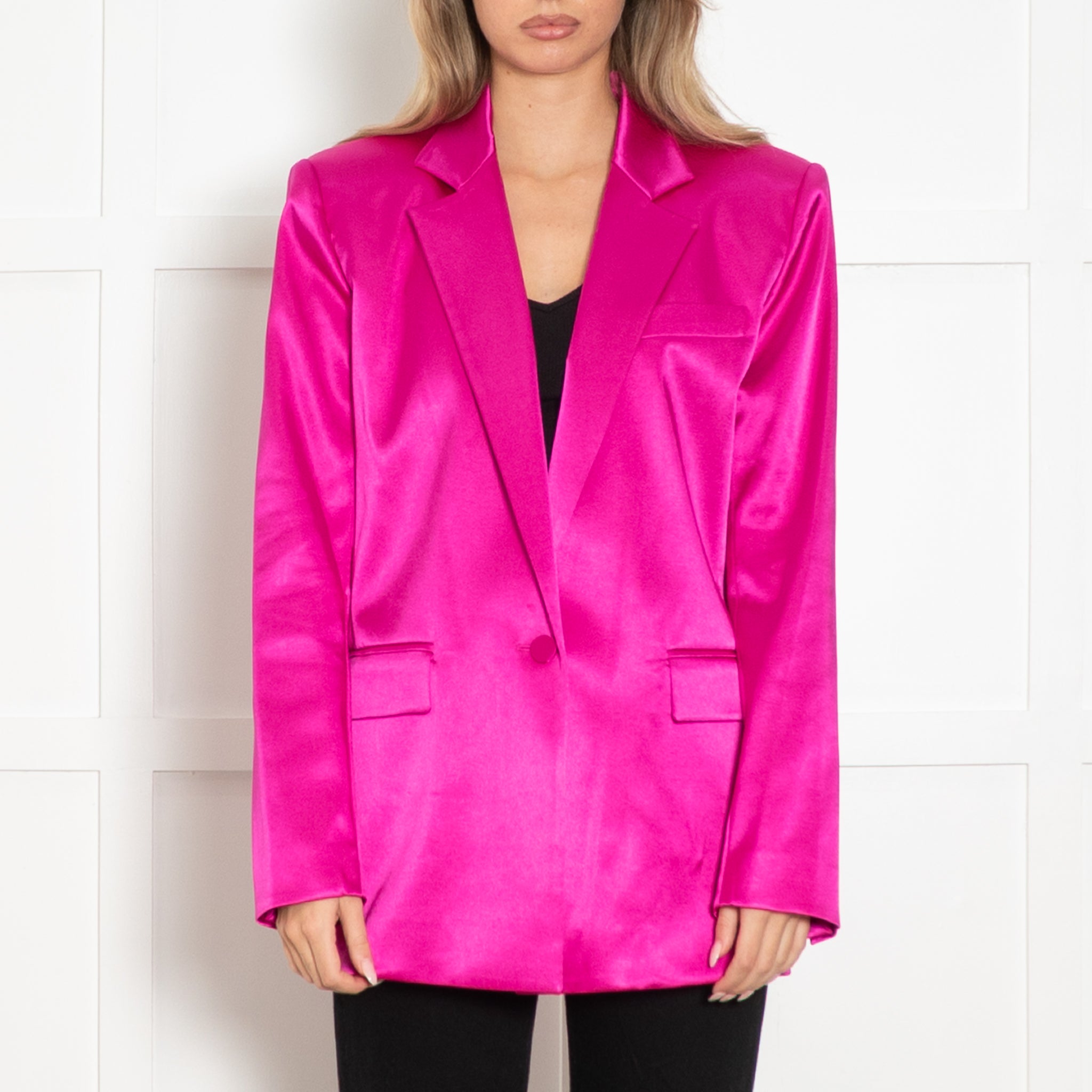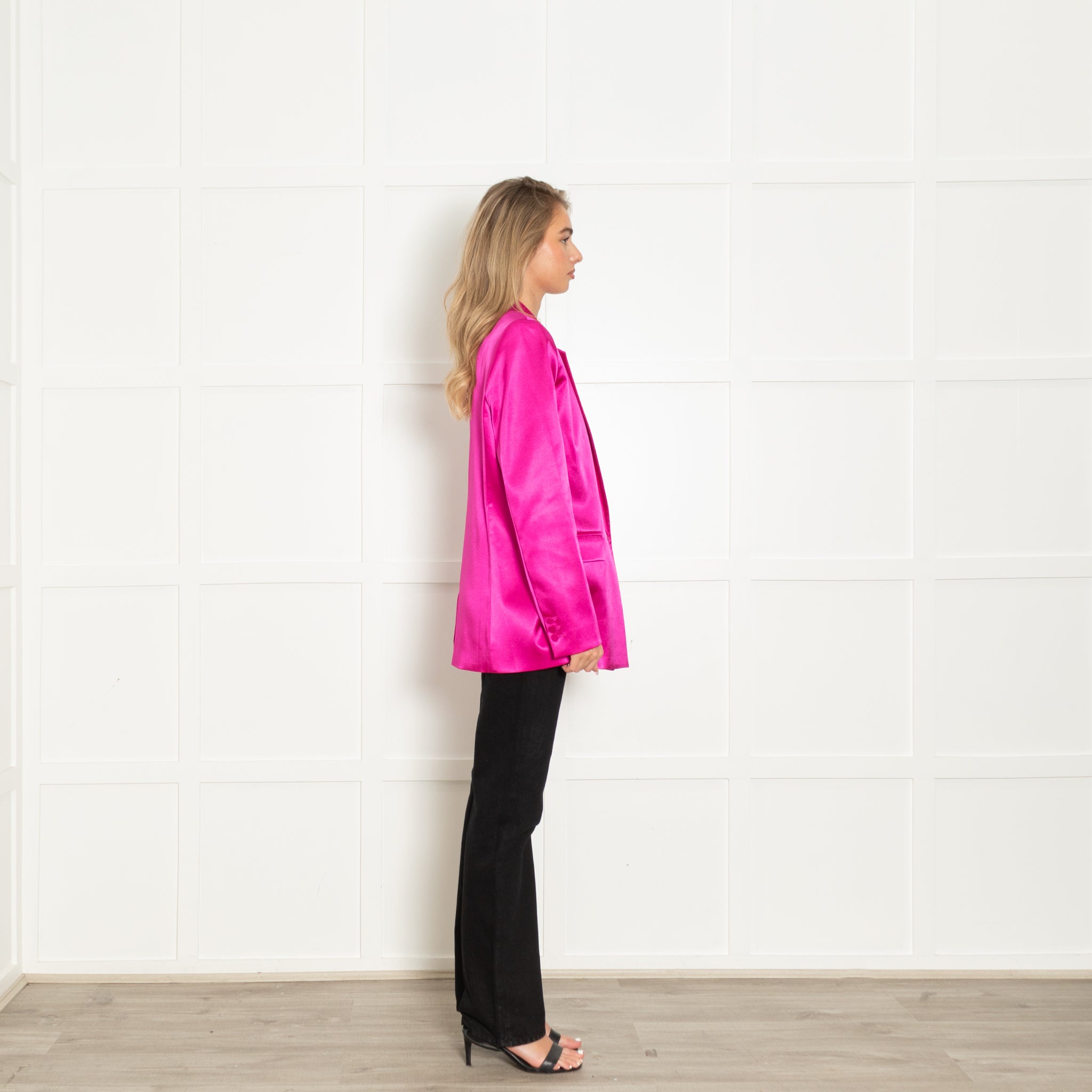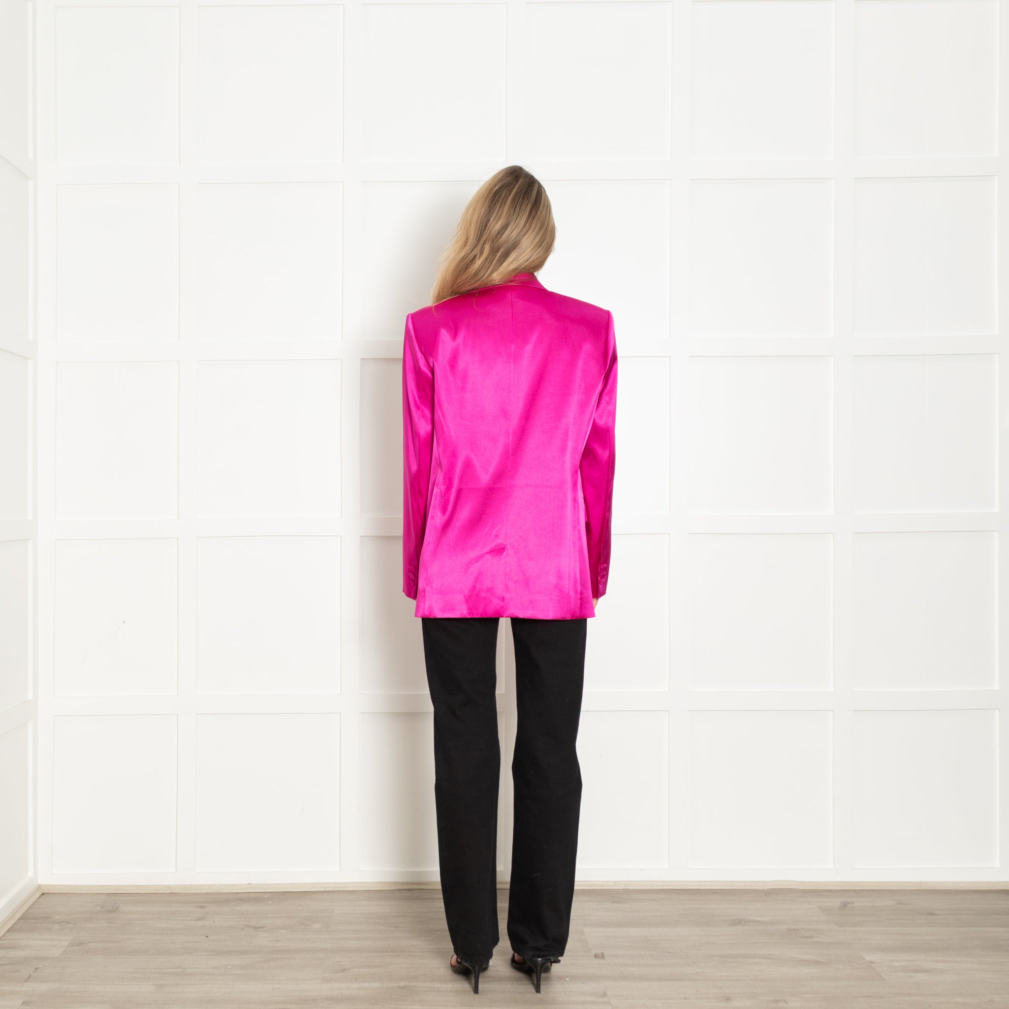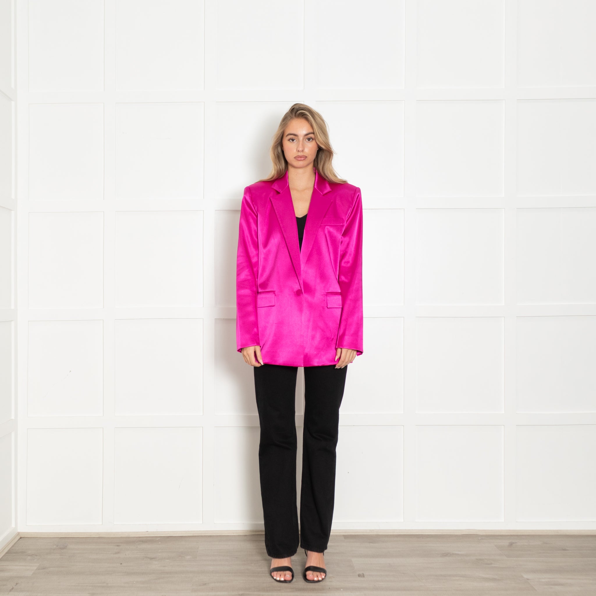 Frame bright pink satin blazer. Made from lustrous satin, this single-breasted design has an oversized cut, notched lapels, and flap pockets. Brand new with tags.