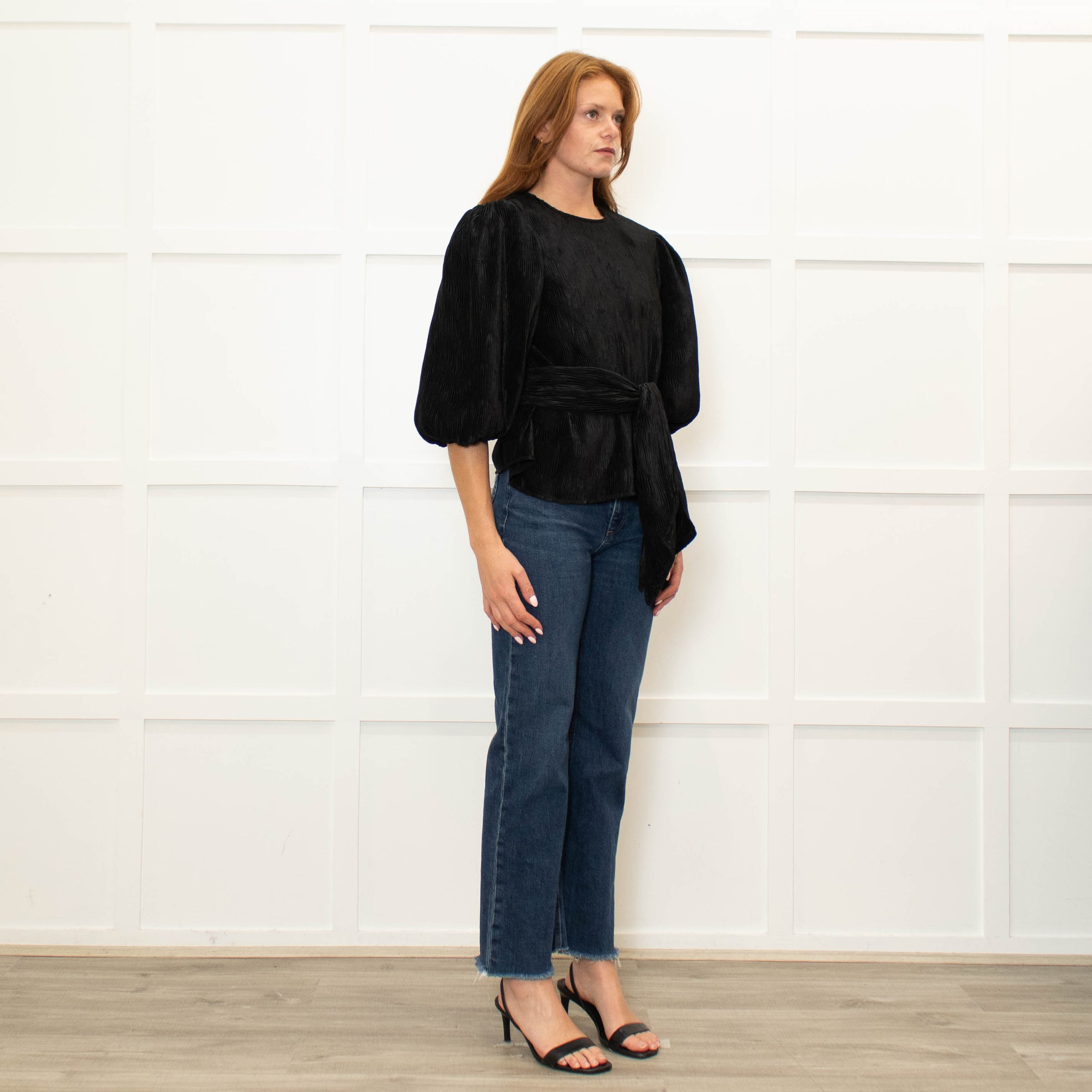 Ganni black pleated puff sleeve top with a matching hand-tied belt. Finished with a rounded neckline and a rear zip fastener.
