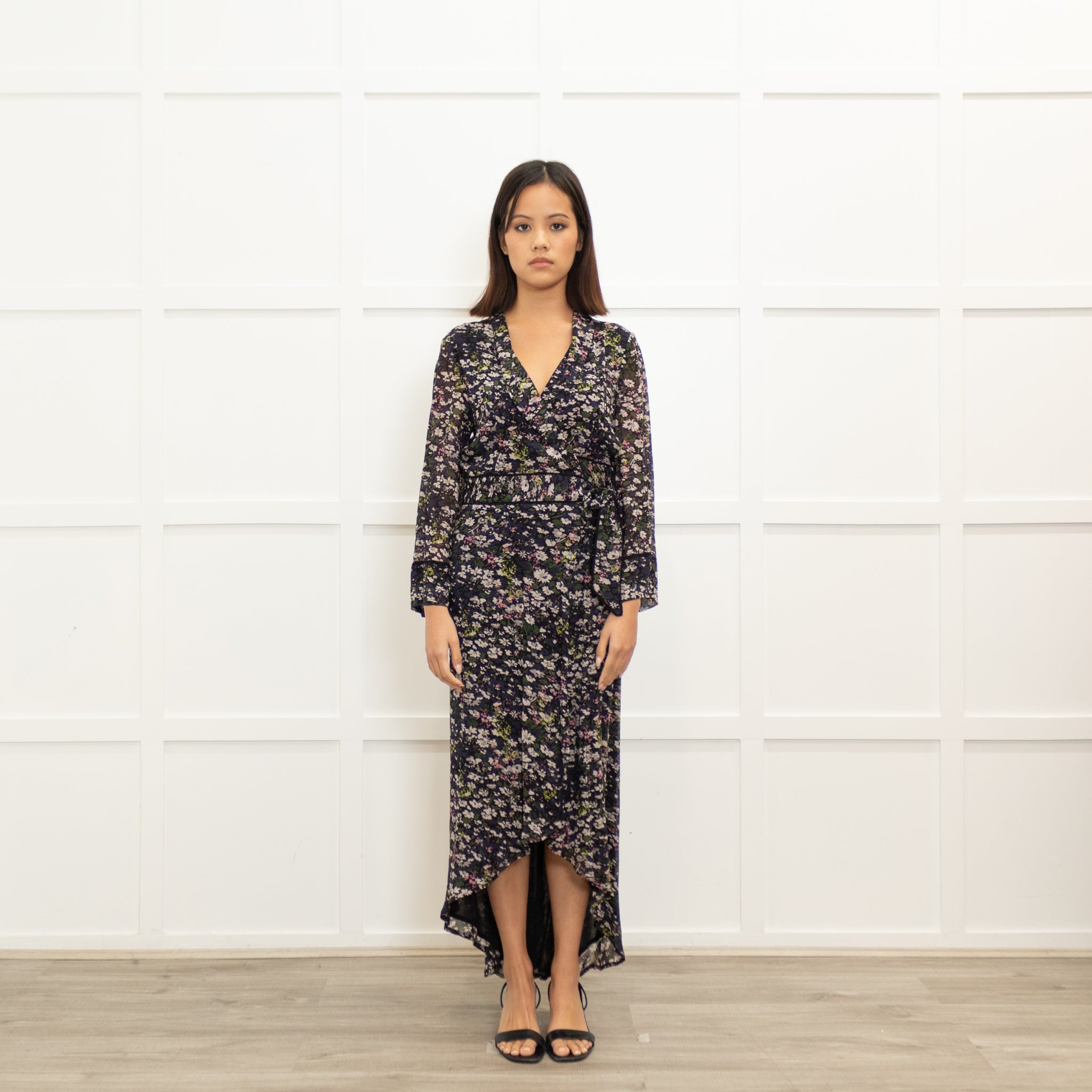 Ganni blue wrap dress with small floral print, a matching waist belt and V-shaped neckline. New with tags, RRP £210.