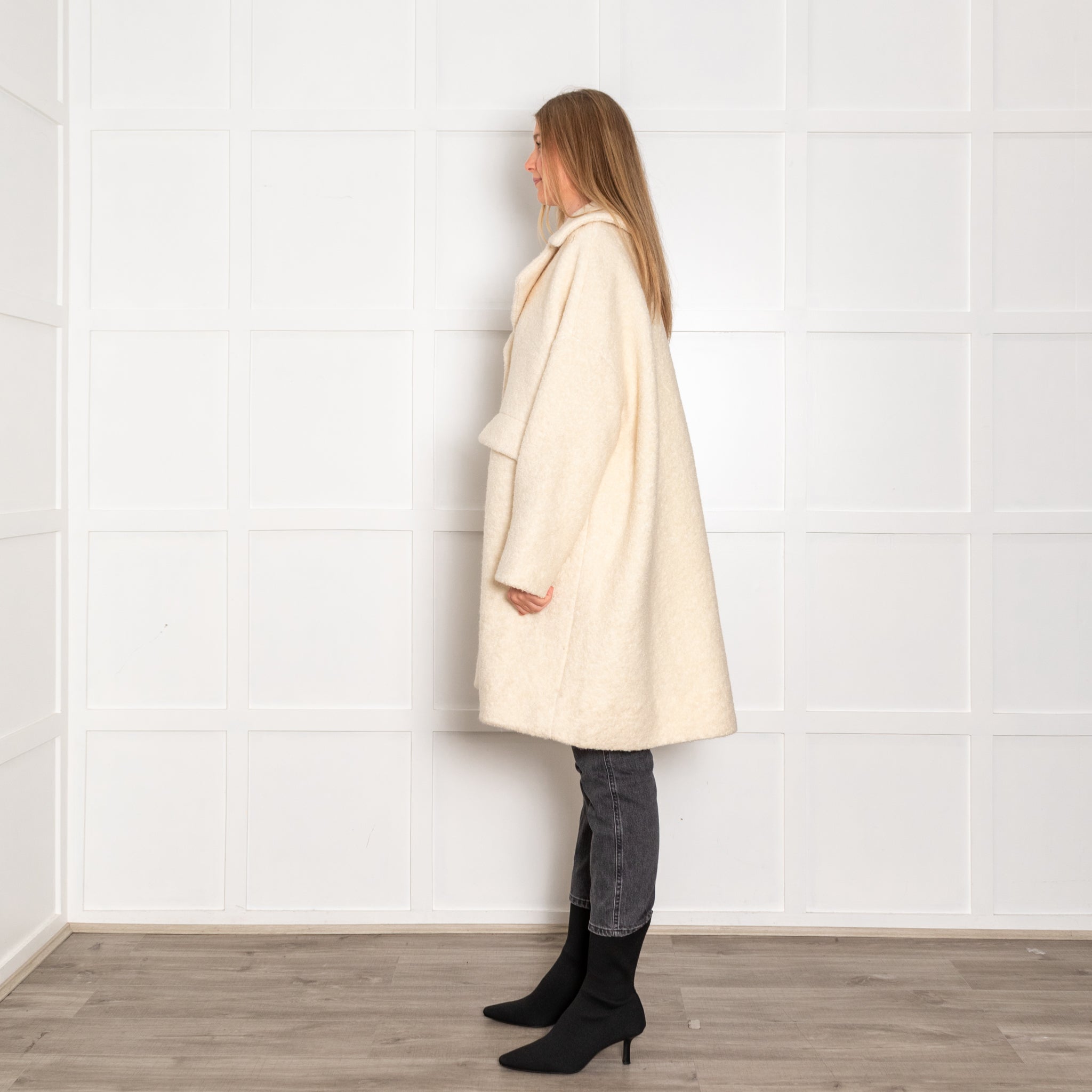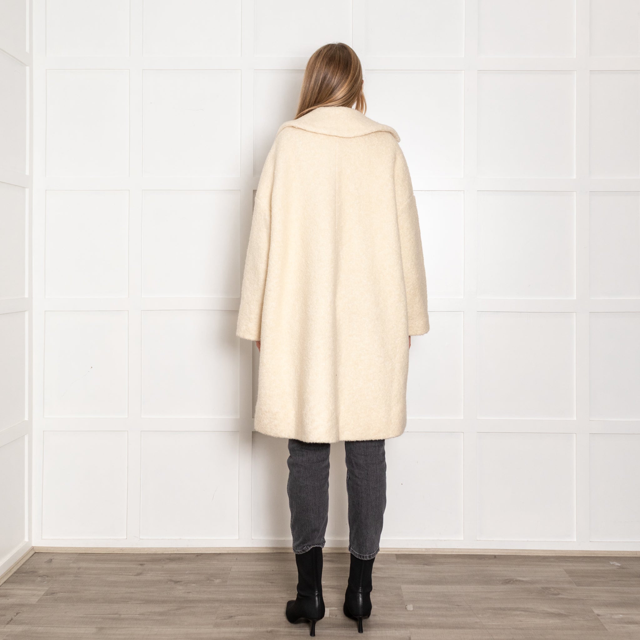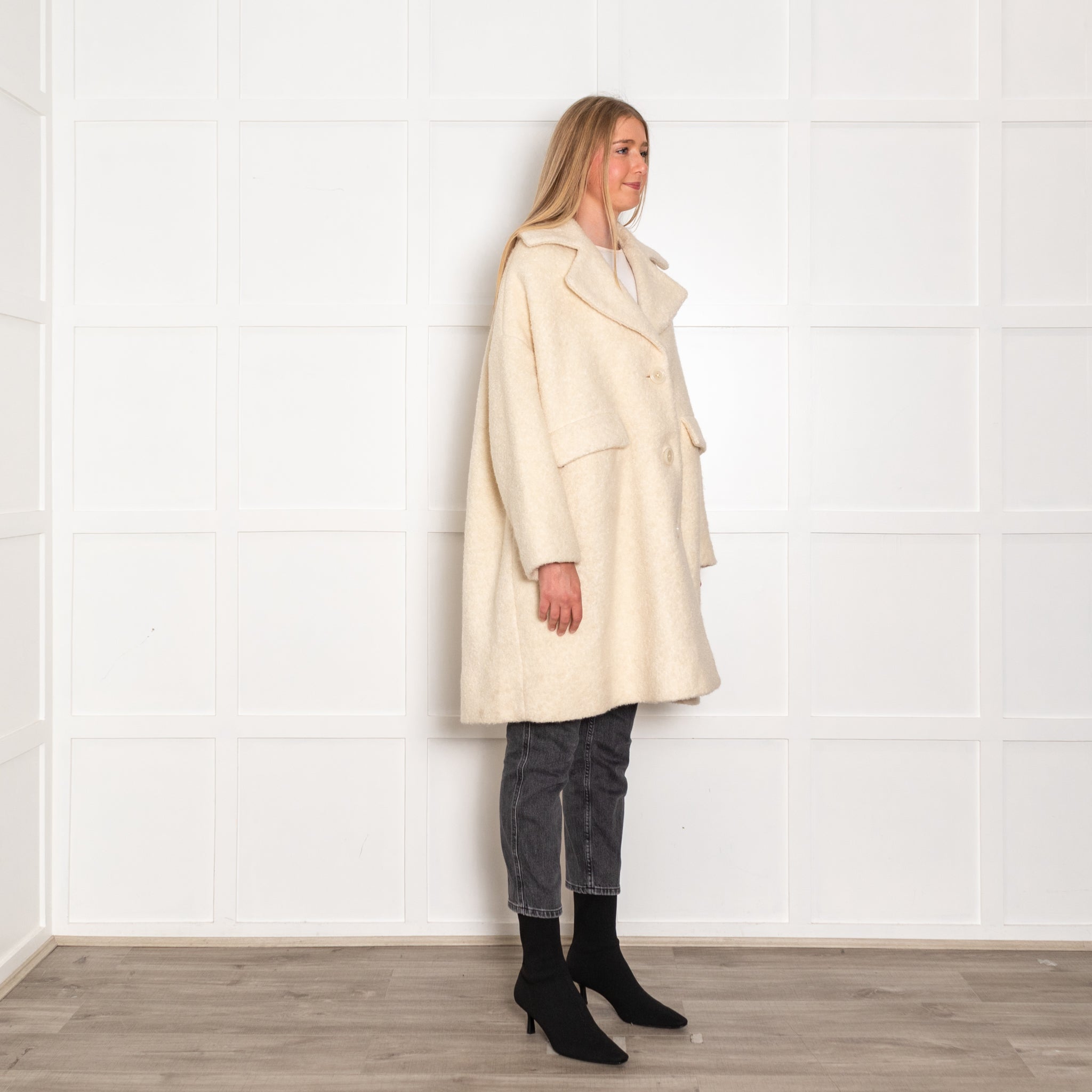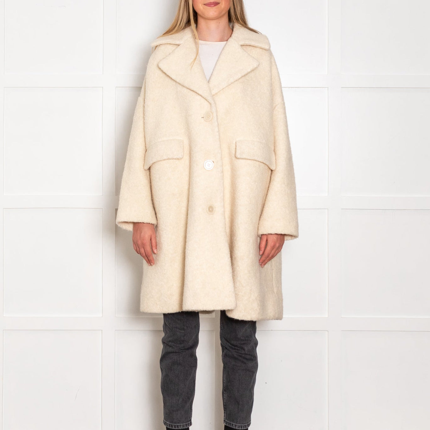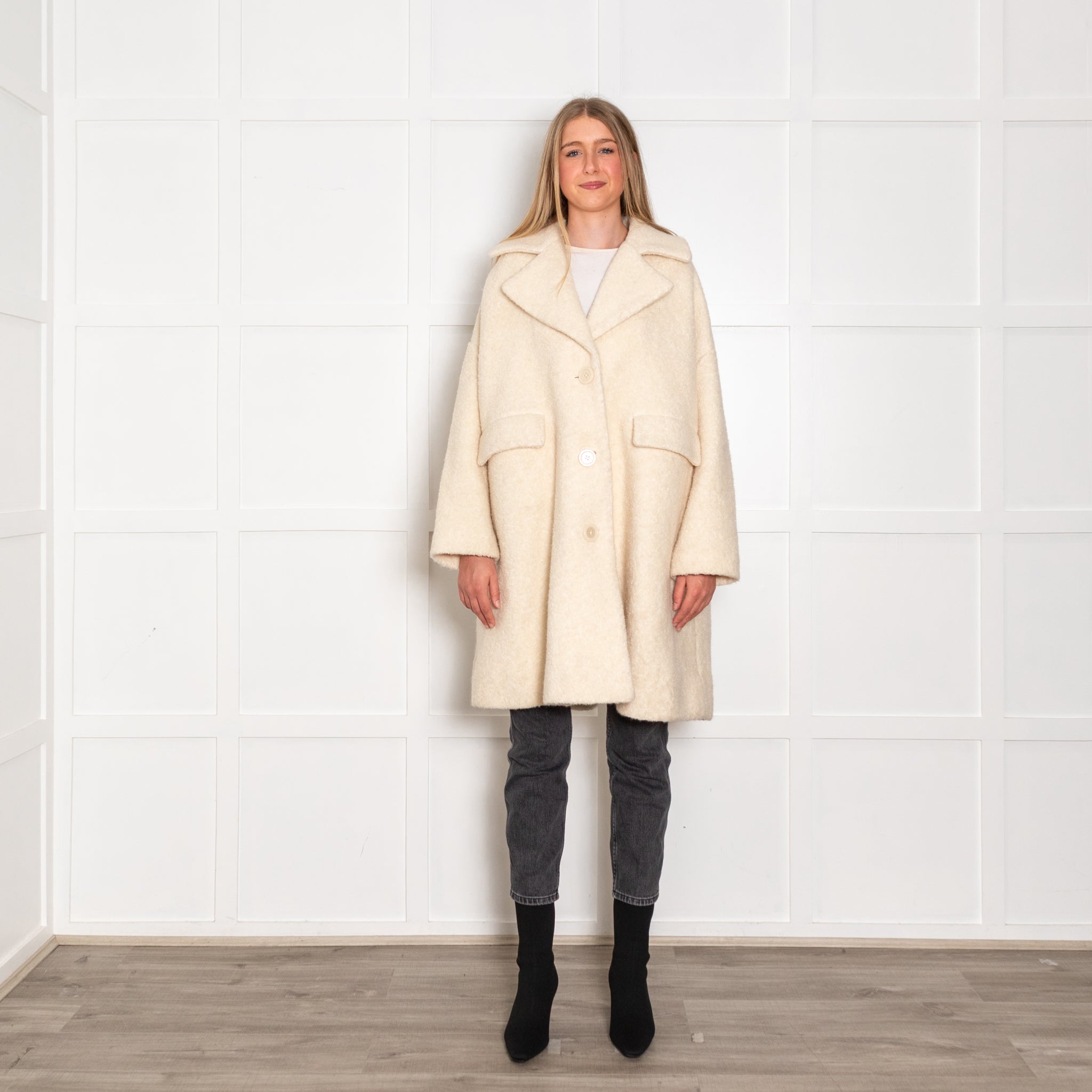 Ganni stunning butter-cream boucle oversized coat, featuring a three-button closure, two large front spacious pockets and a classic oversized collar.