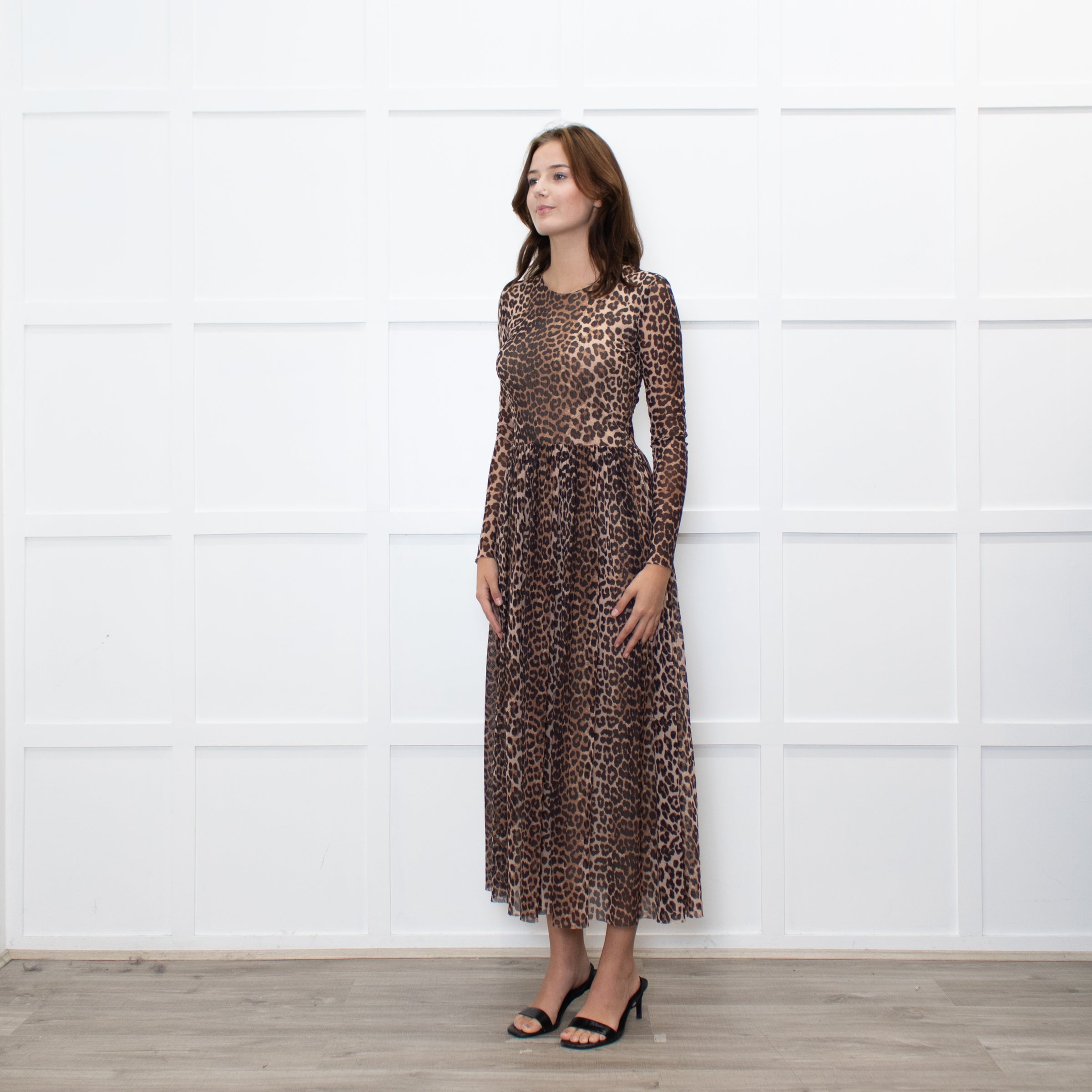 Ganni leopard mesh maxi dress with a pleated skirt and rounded neckline.