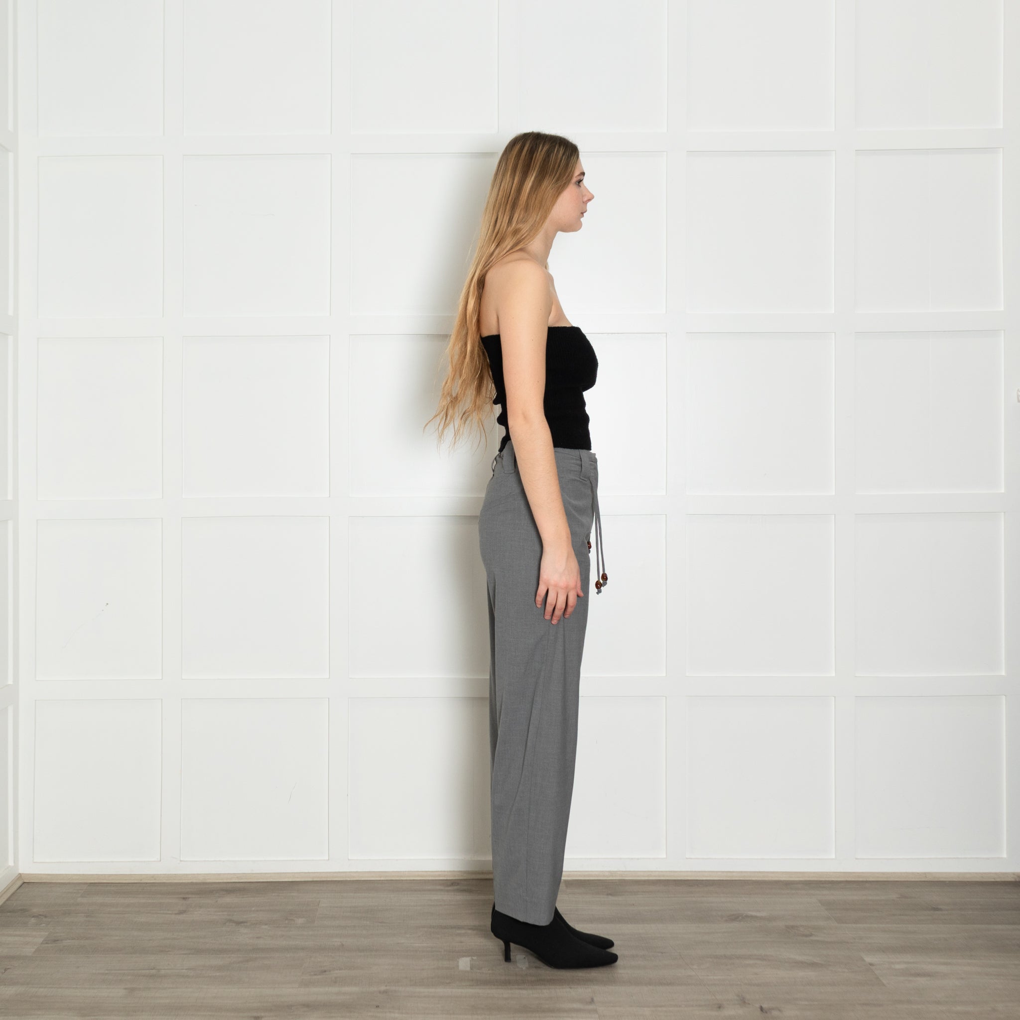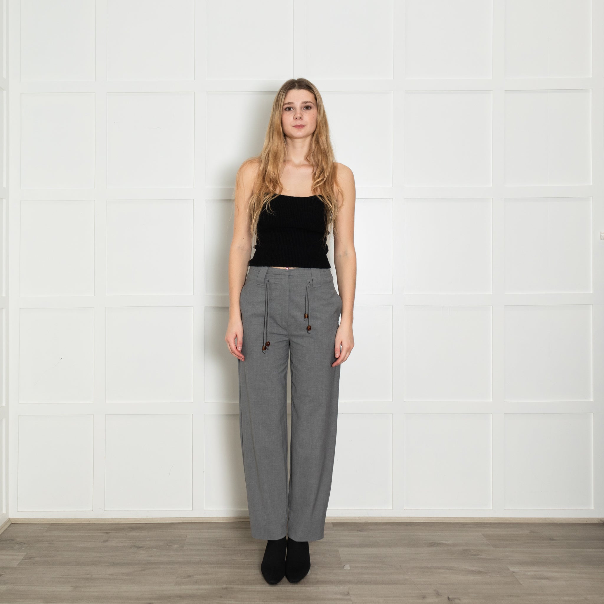 Ganni pale grey smart tailored trousers, crafted with fine woolen fabric, featuring a draw-string front design with attached brown beads, a zip-up closure, two front pockets, and one singular black pocket.