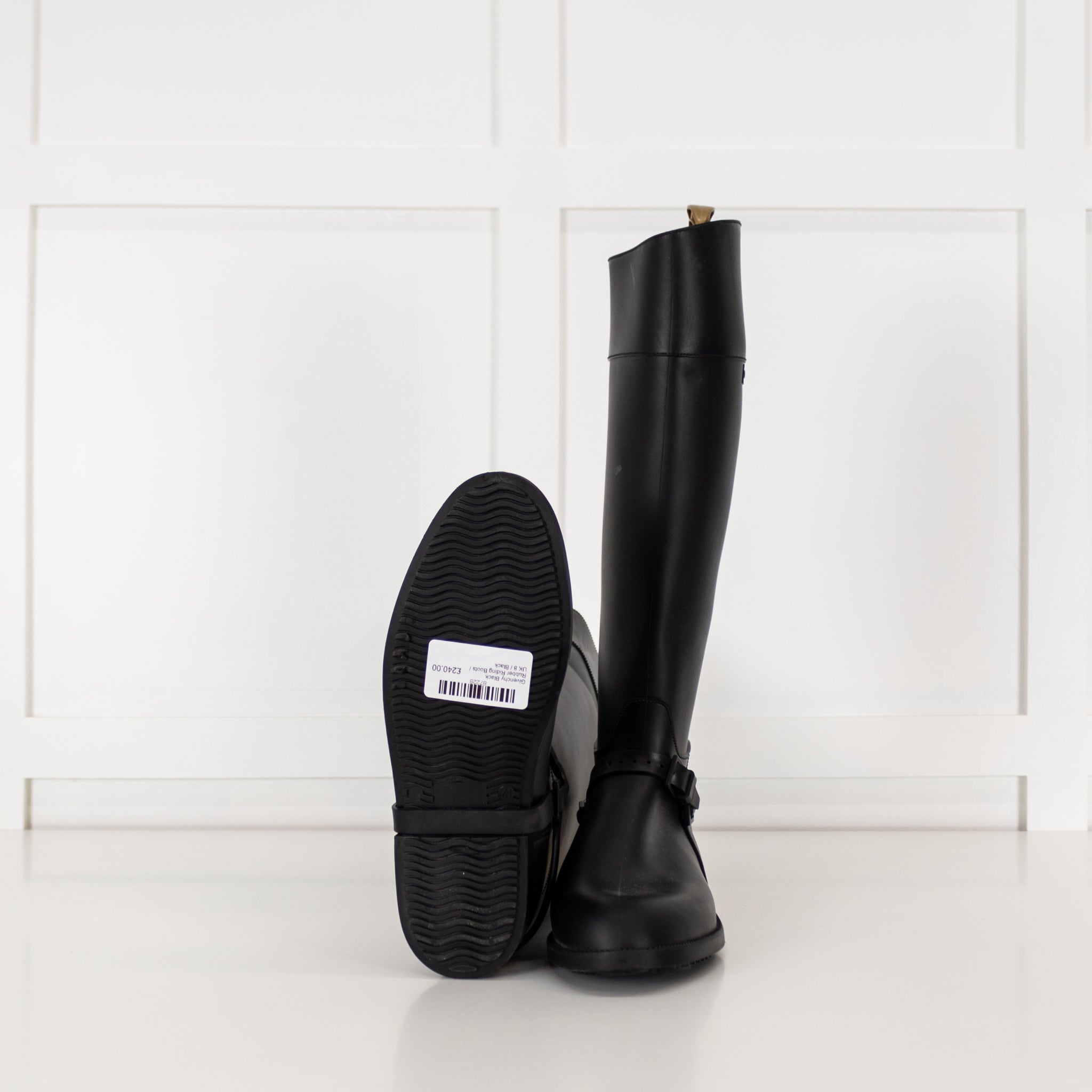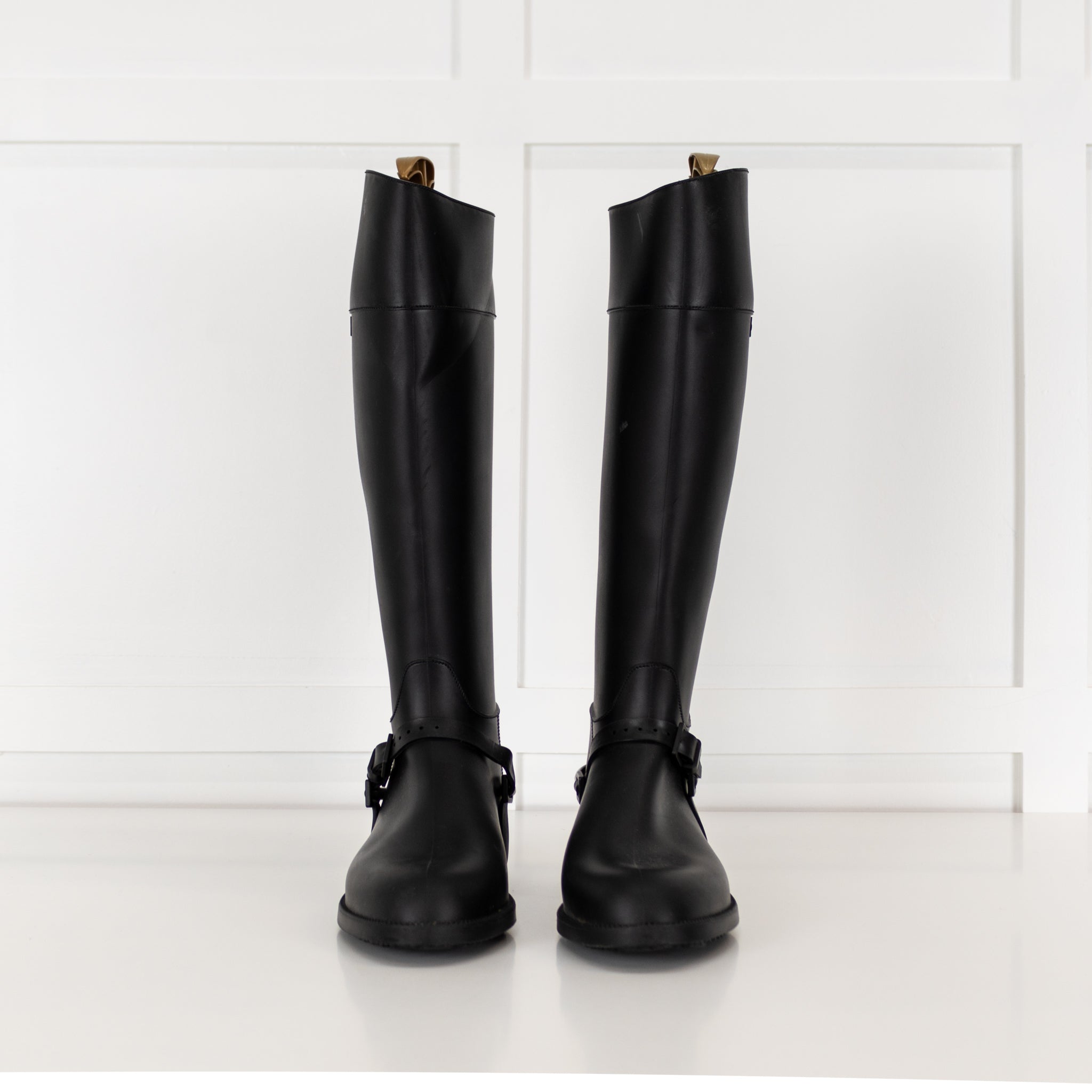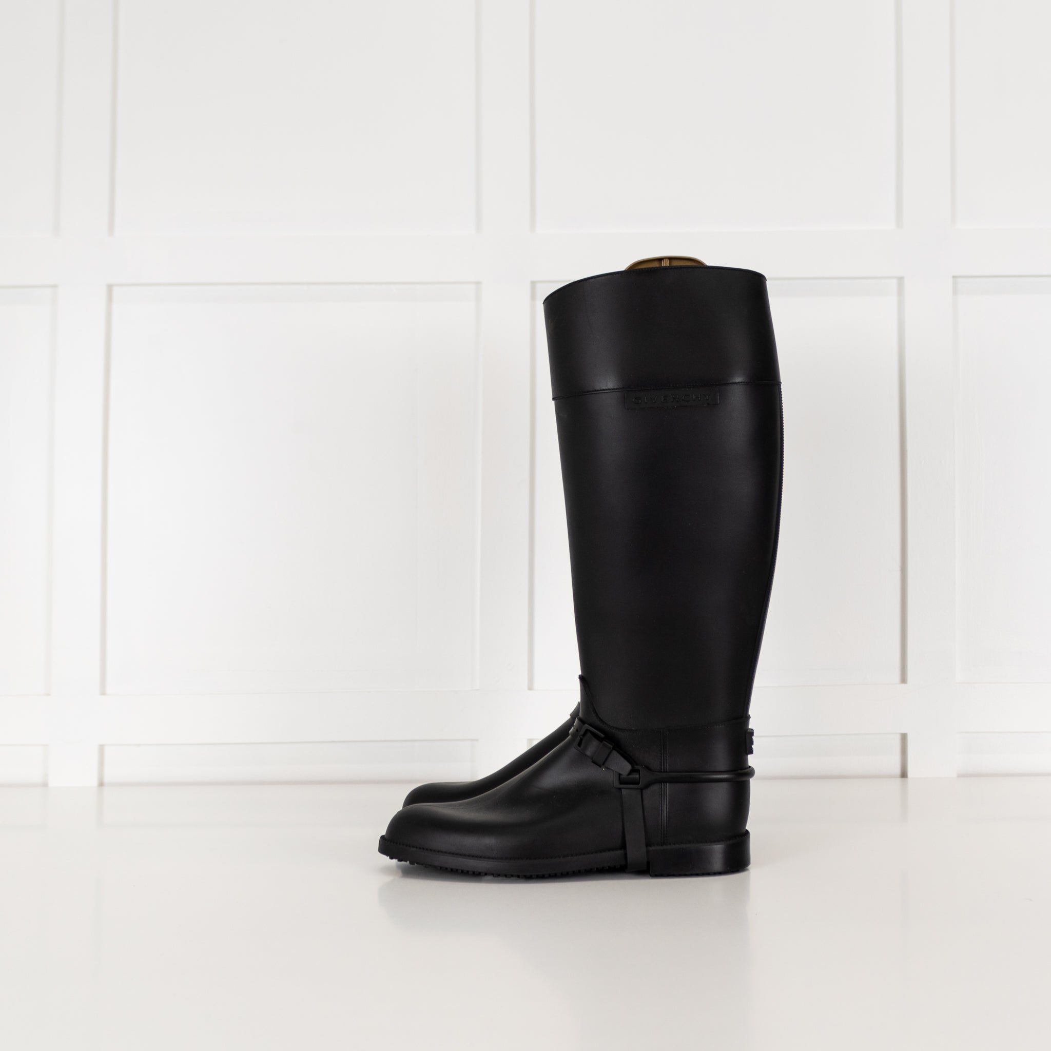Givenchy stunning black rubber riding boots, featuring intricate embroidered hemlines, and the iconic Givenchy logo on the side of the boot.