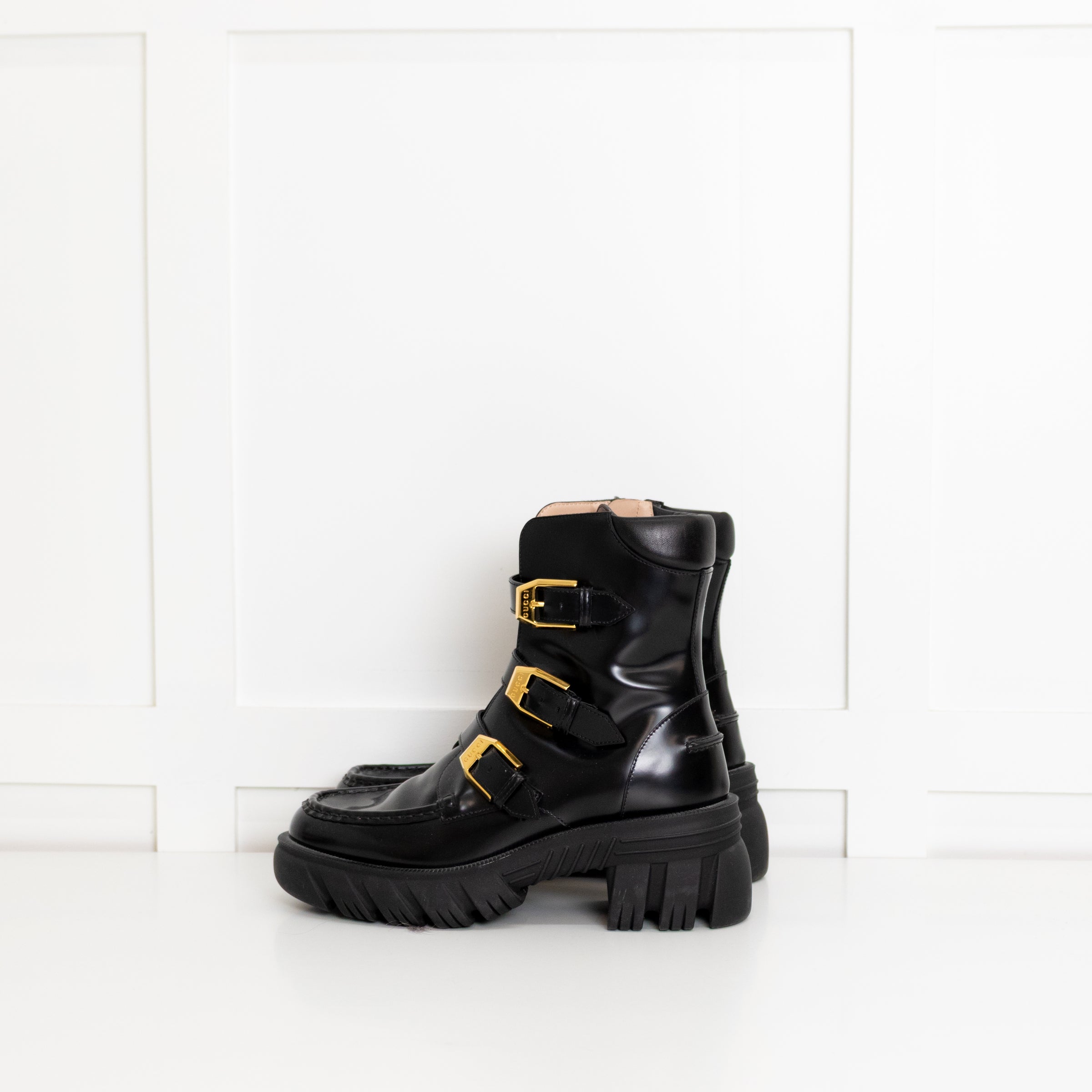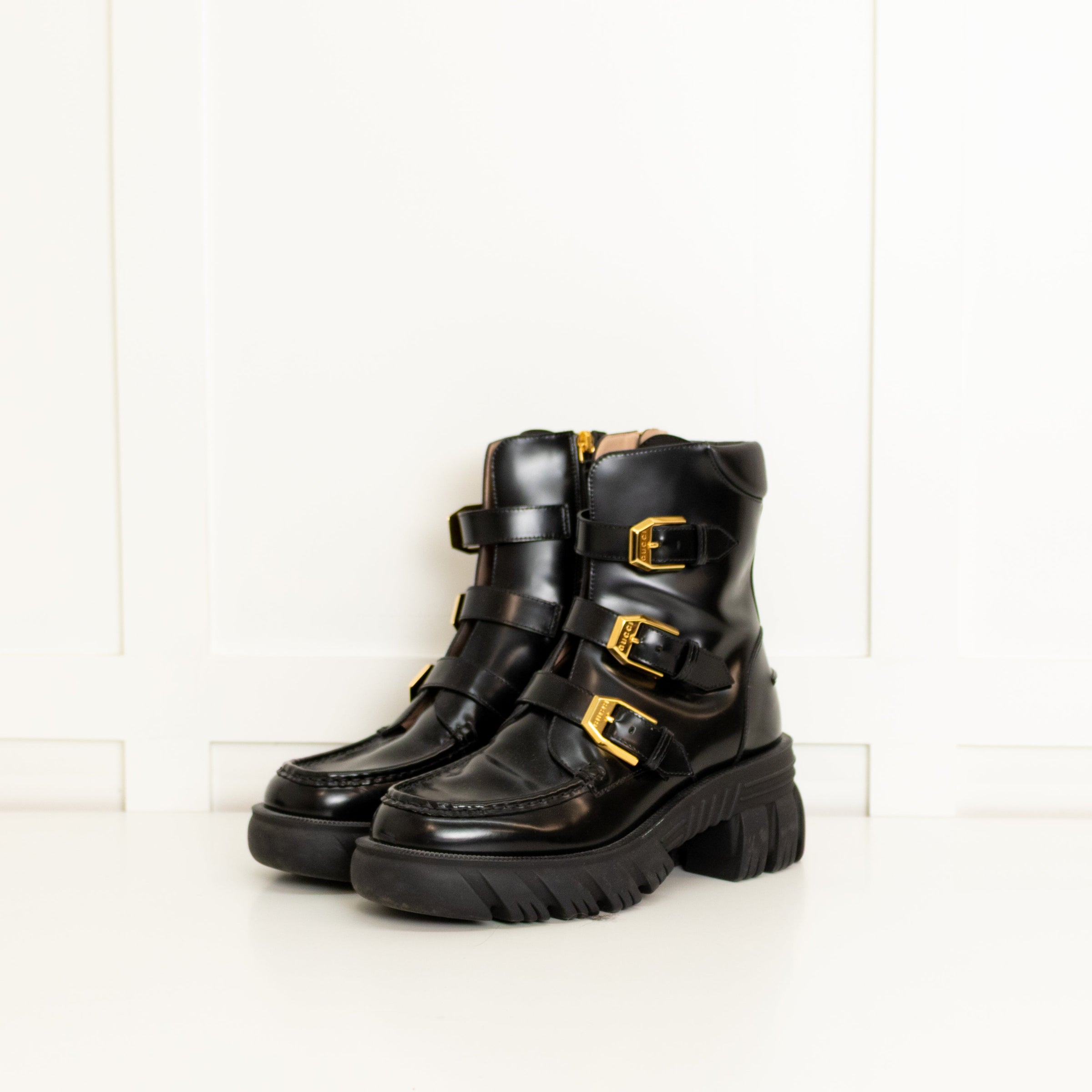 Gucci black smooth leather ankle combat boots with gold buckled straps across the front, a rounded toe, and a padded section at the back of the ankle. Finished with a chunky rubber sole.