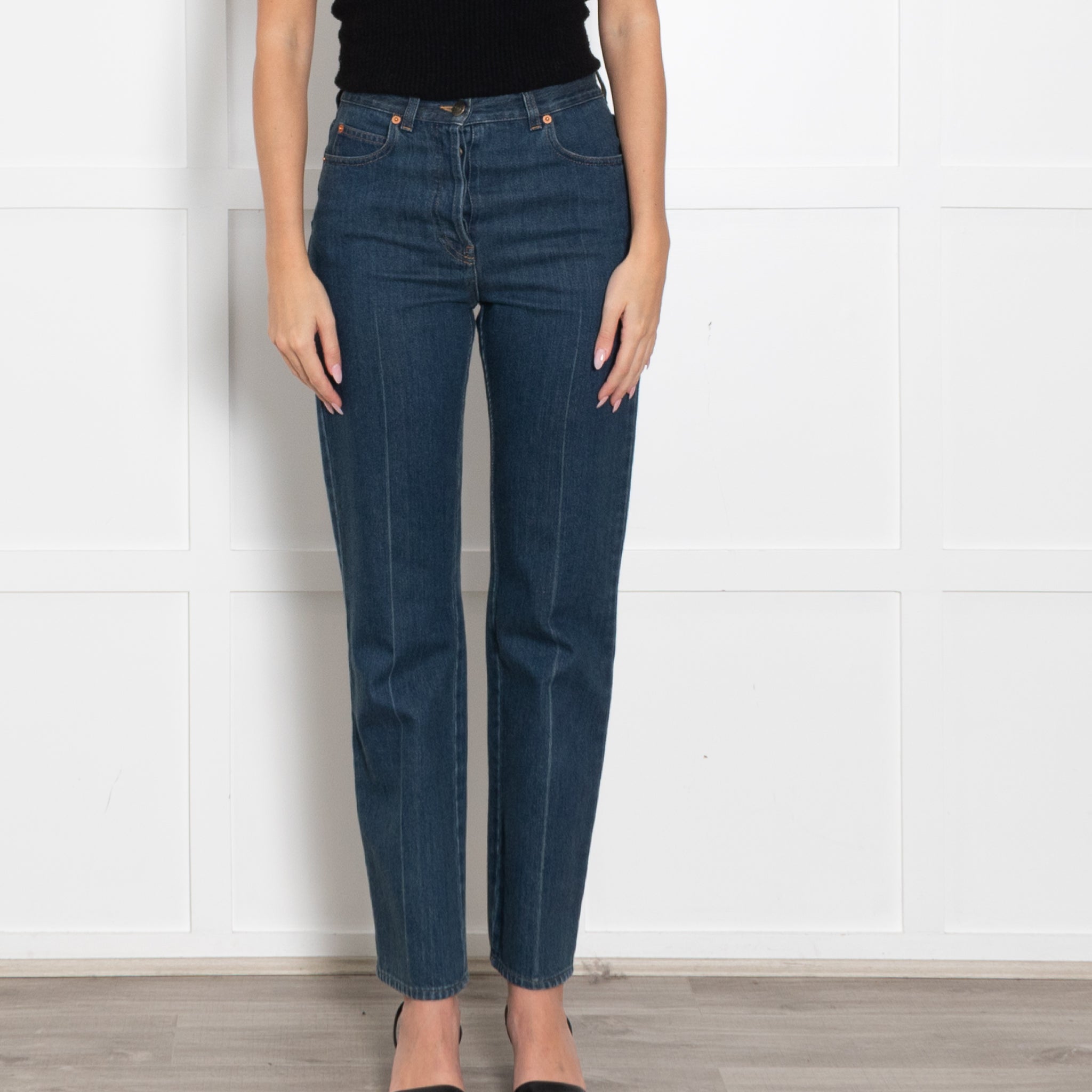 Gucci blue denim jeans. A straight leg fit with button-up fastening. A front-seam with horsebit detail to the back pockets.