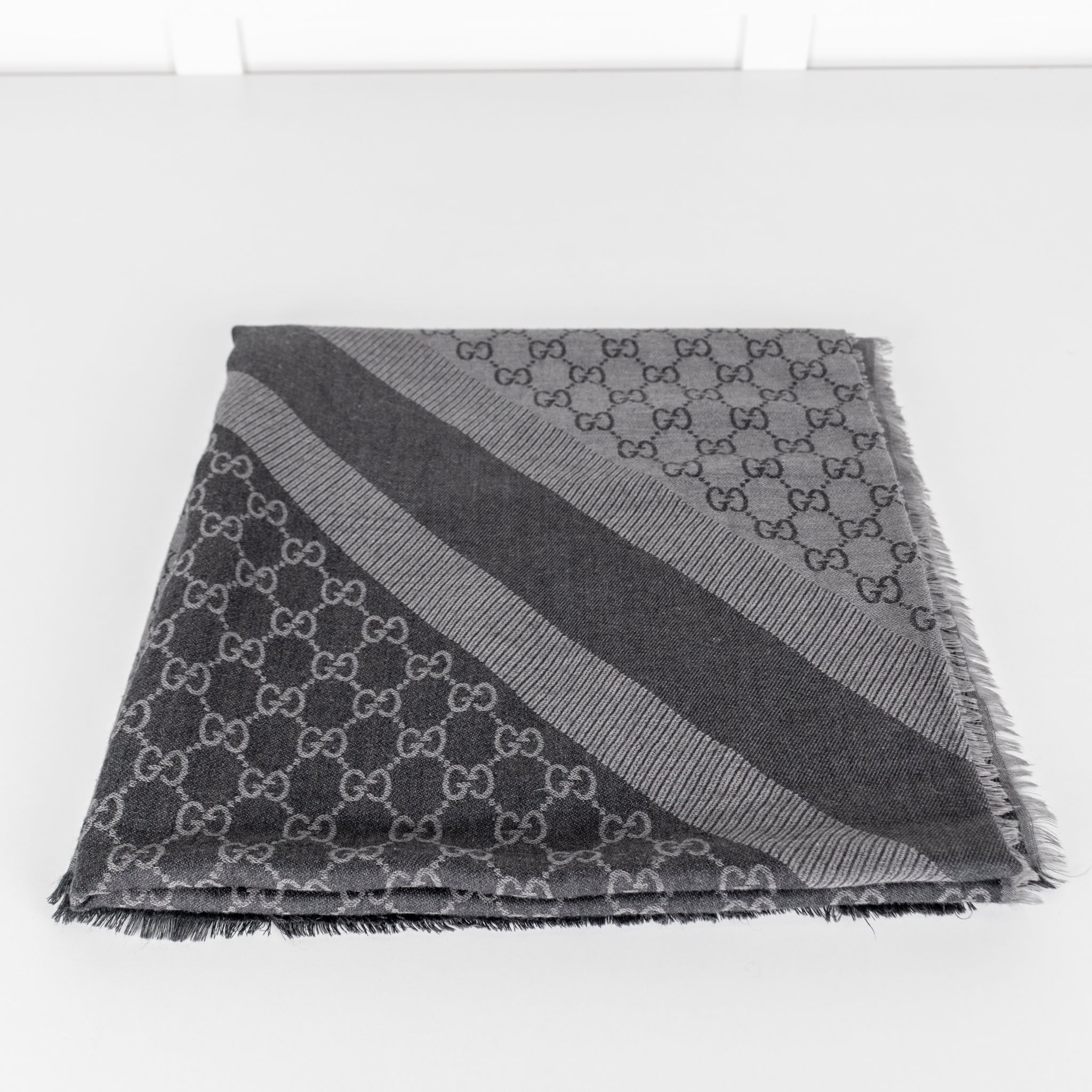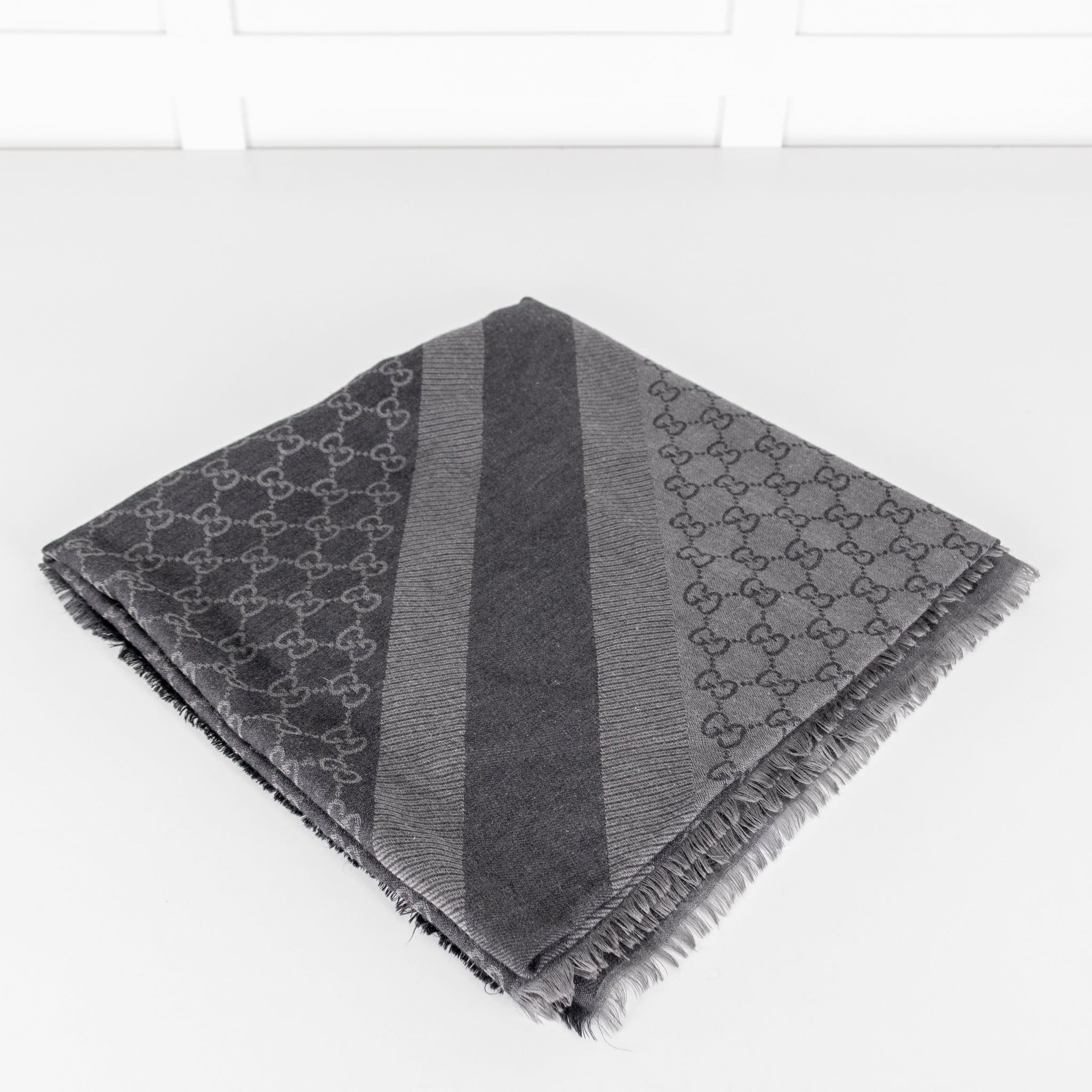 Gucci scarf, featuring a dark grey and square GG deisgn with raw hems.