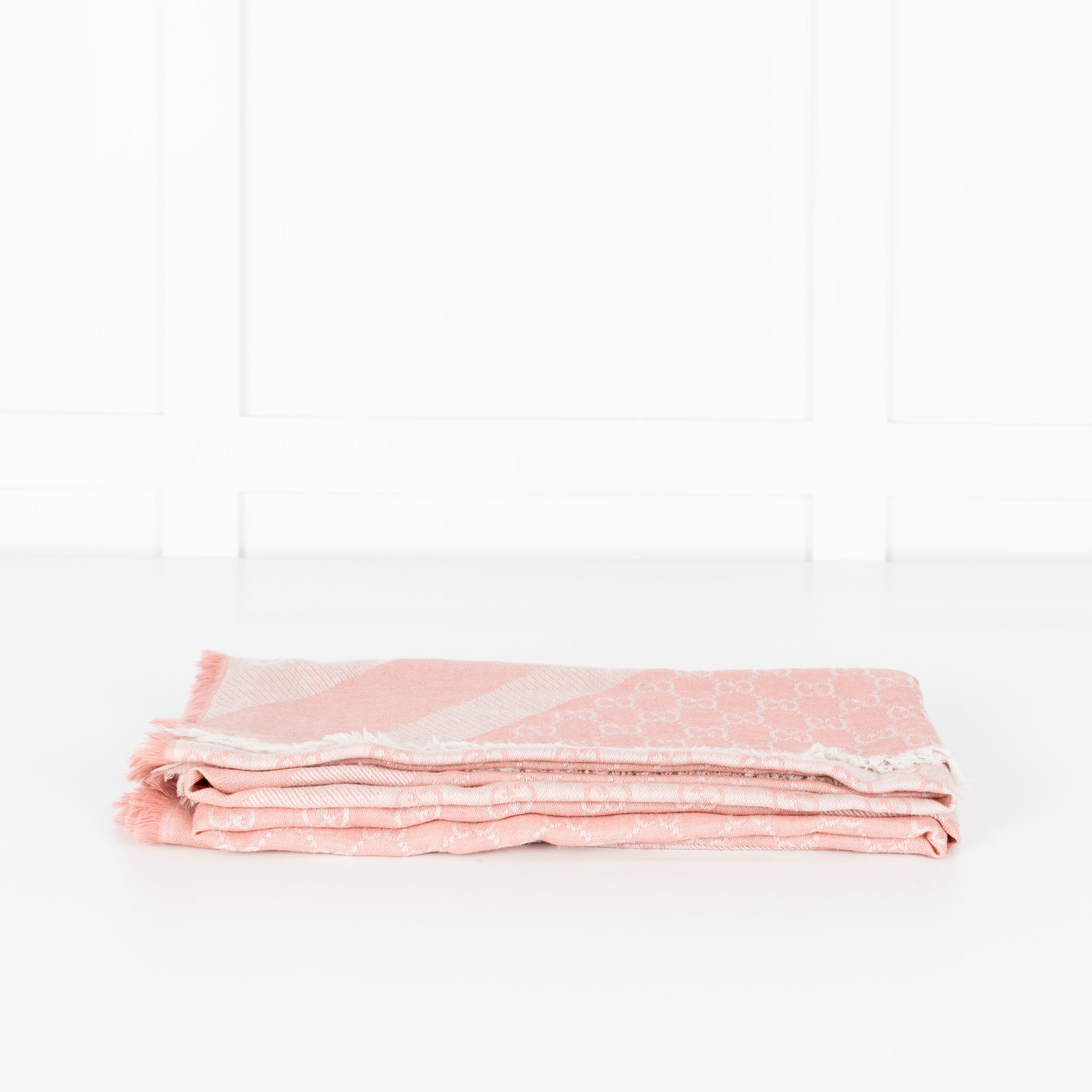 Gucci pale pink square 'GG' scarf with raw hems.