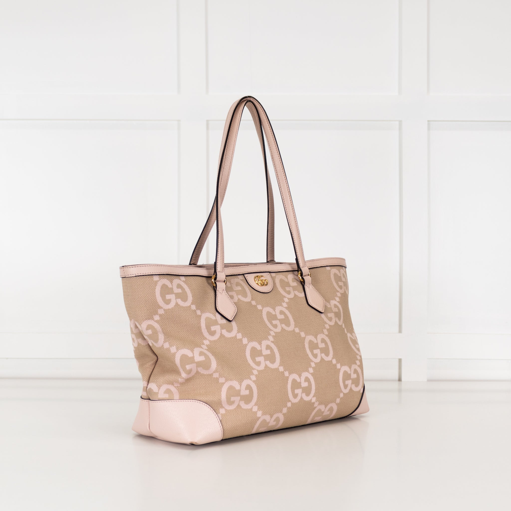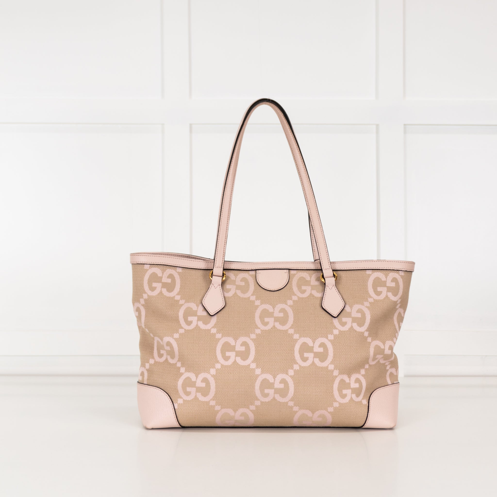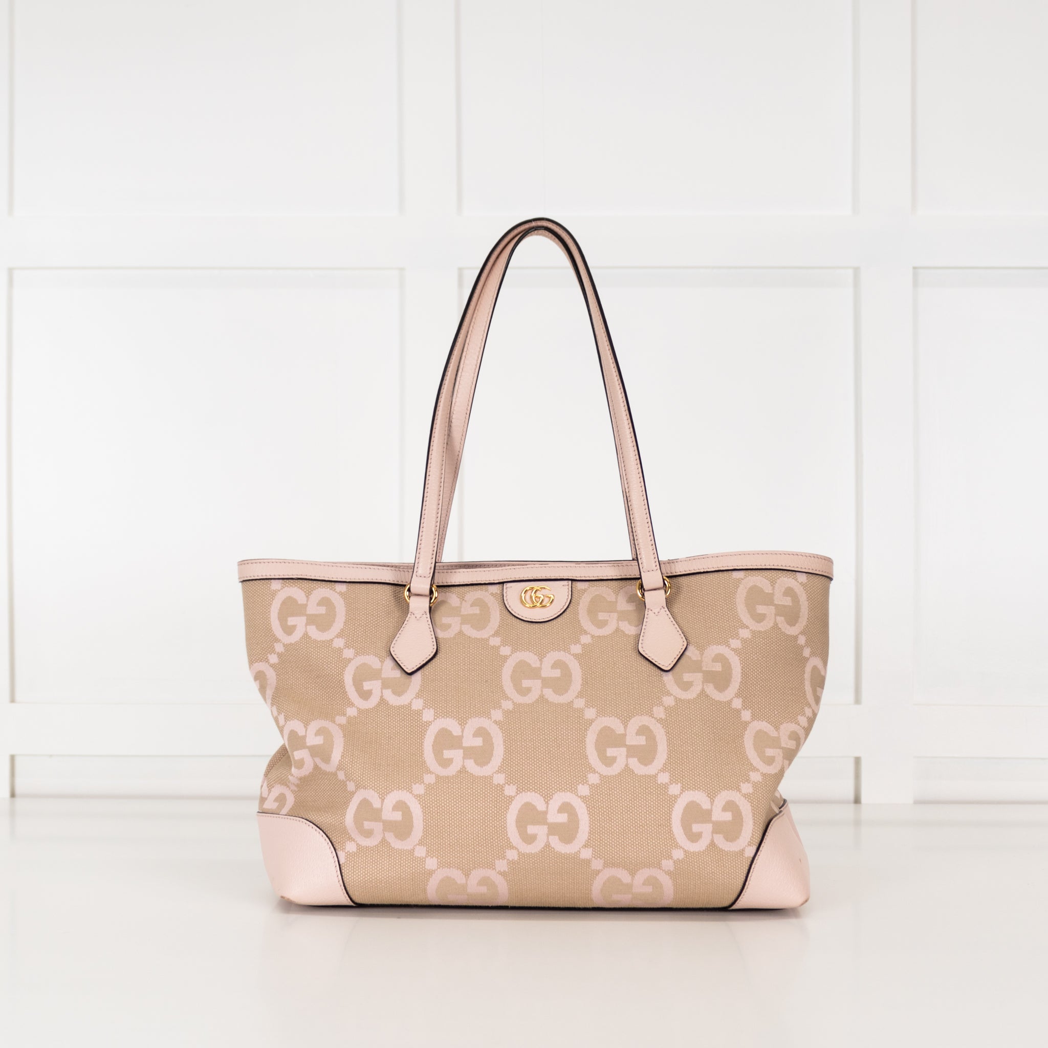 Gucci Ophida GG medium canvas tote, crafted from a pink and beige woven canvas body and a tonal leather trim. This bag features the GG motif in gold-tone hardware and has two leather top handles to be carried as a shoulder bag, a magnetic snap closure, and a canvas interior with one main compartment and one side zipped pocket.