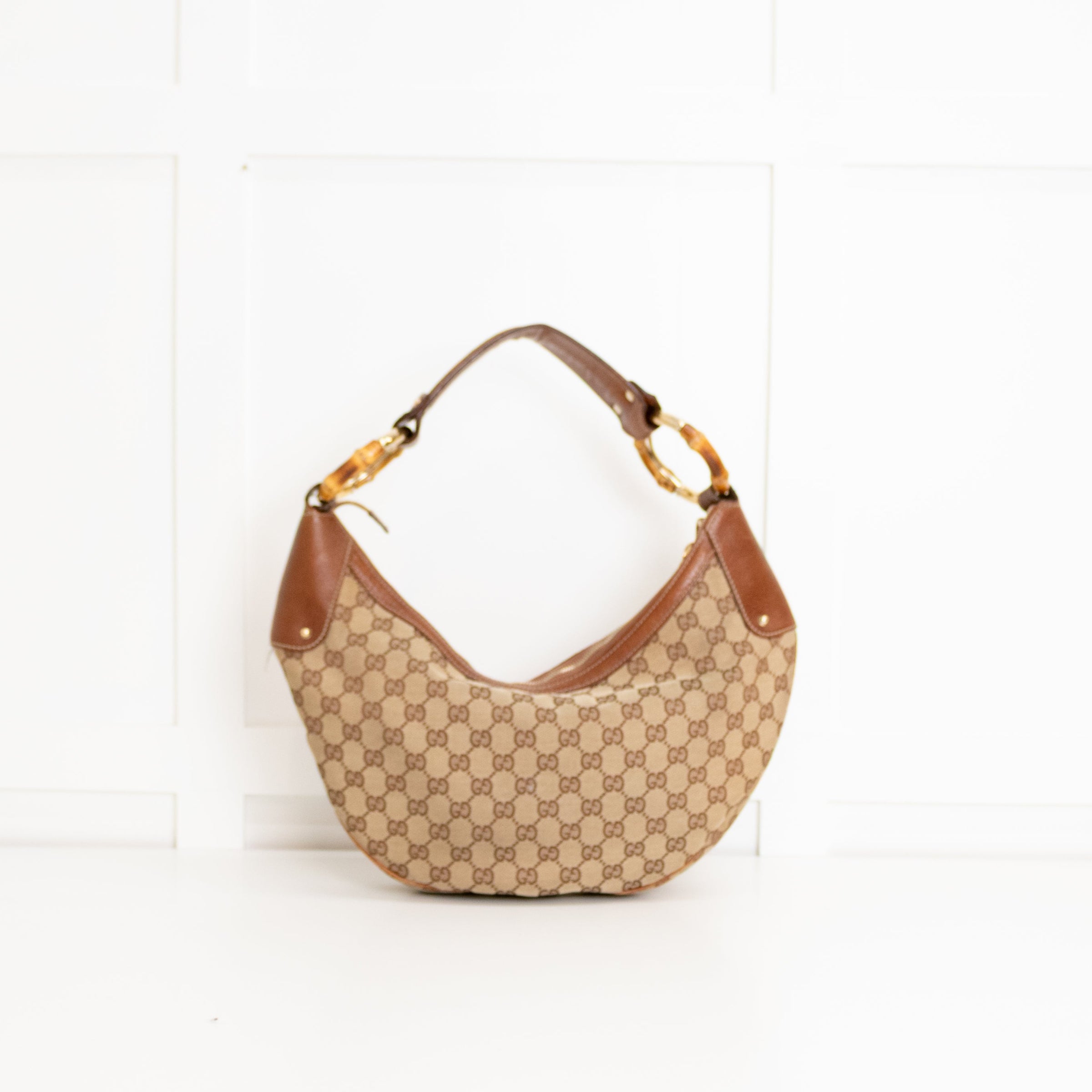 Gucci tan canvas monogram pattern half moon hobo bag with bamboo detailing, brown leather trims, a chunky shoulder strap, and a top zip fastener.