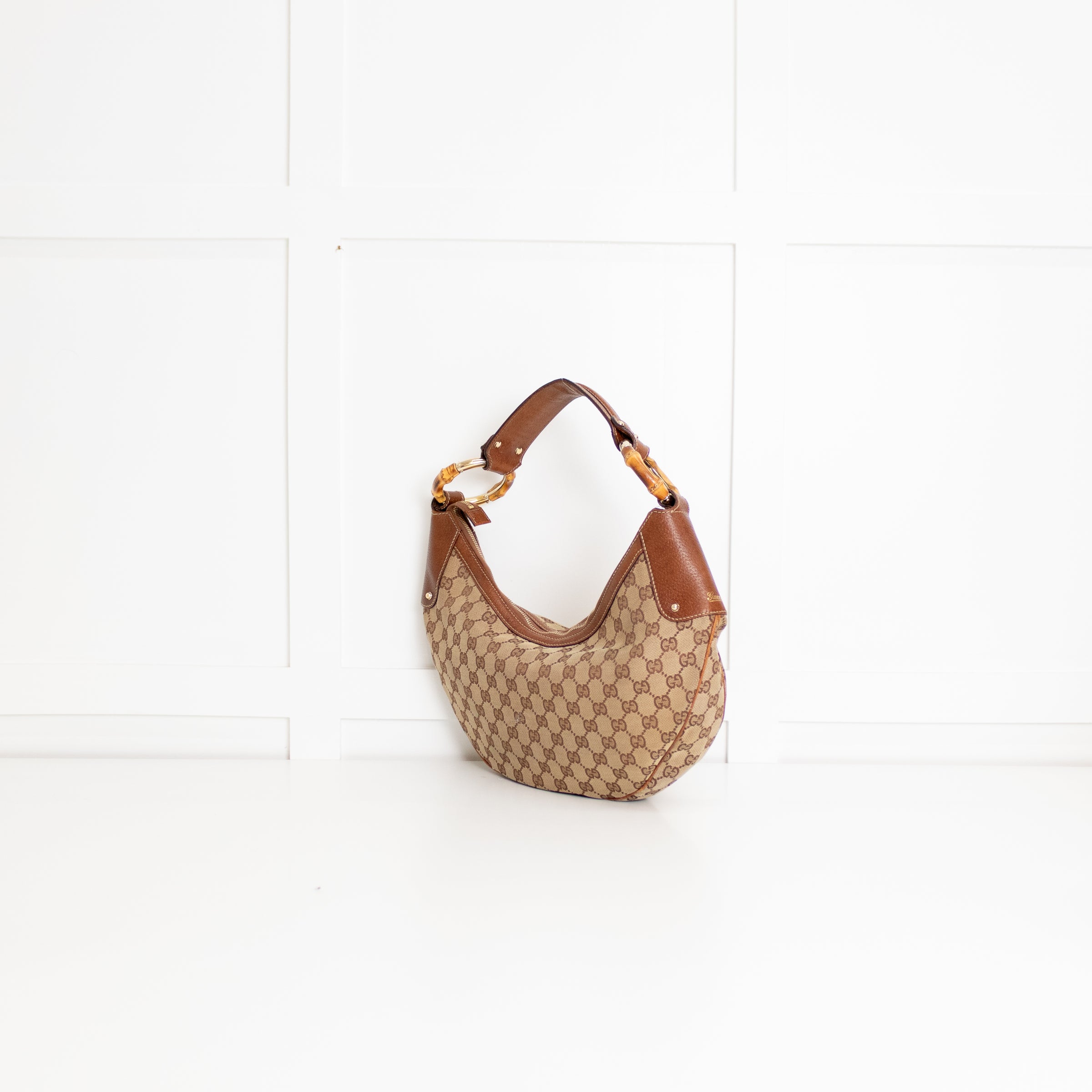 Gucci Tan Canvas Monogram Bamboo Half Moon Hobo Bag