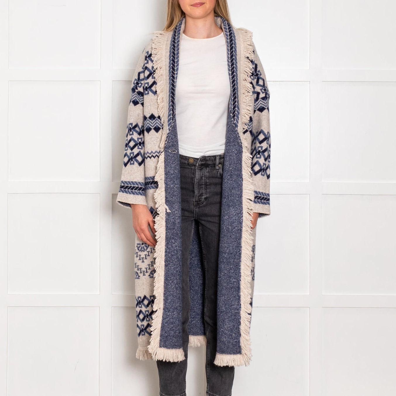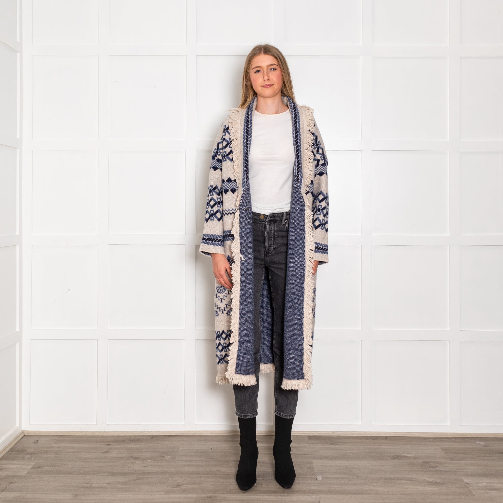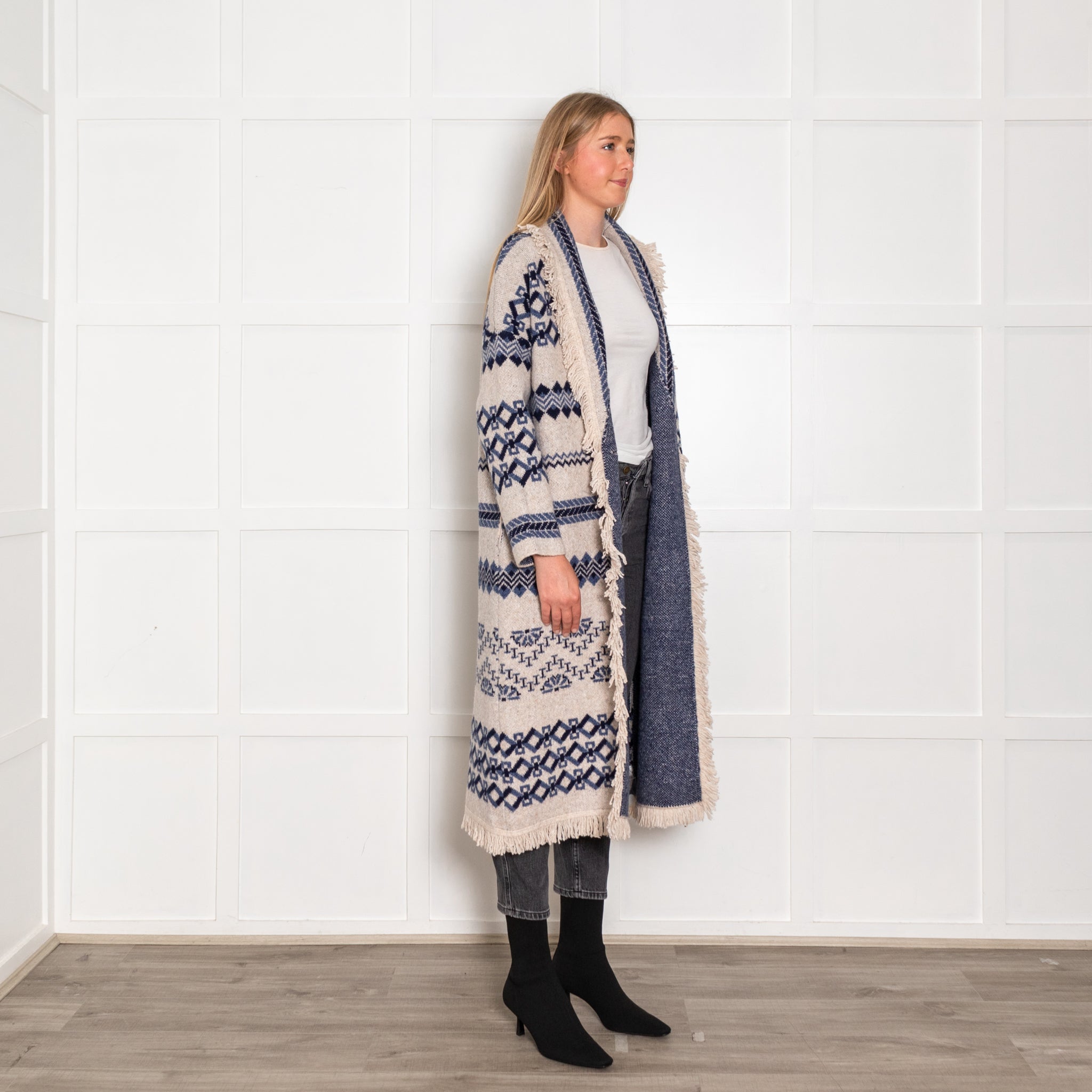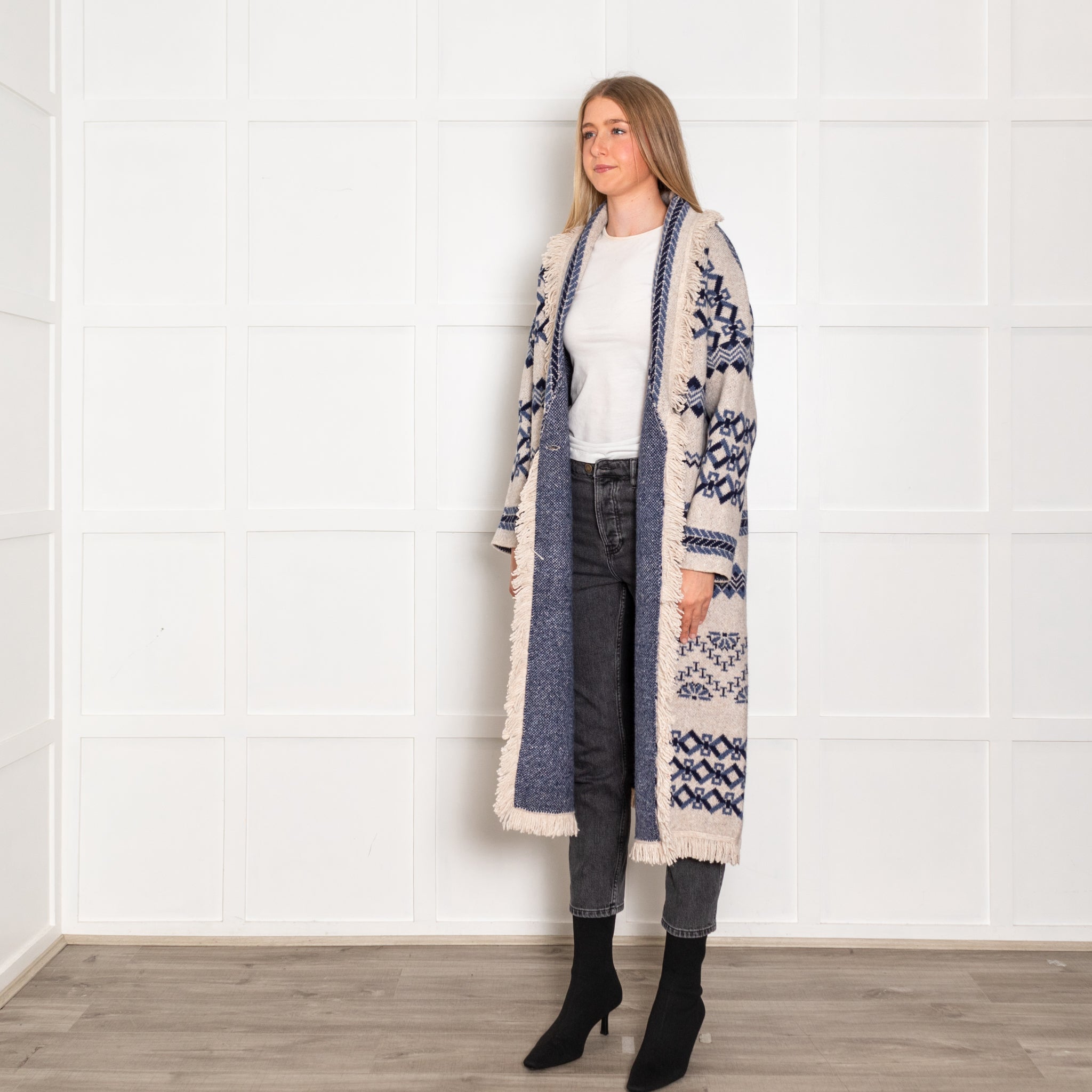 Hale Bob blue and white long-sleeve, long cardigan, featuring a fringed design with gorgeous patterned detailing and a single buttoned closure.