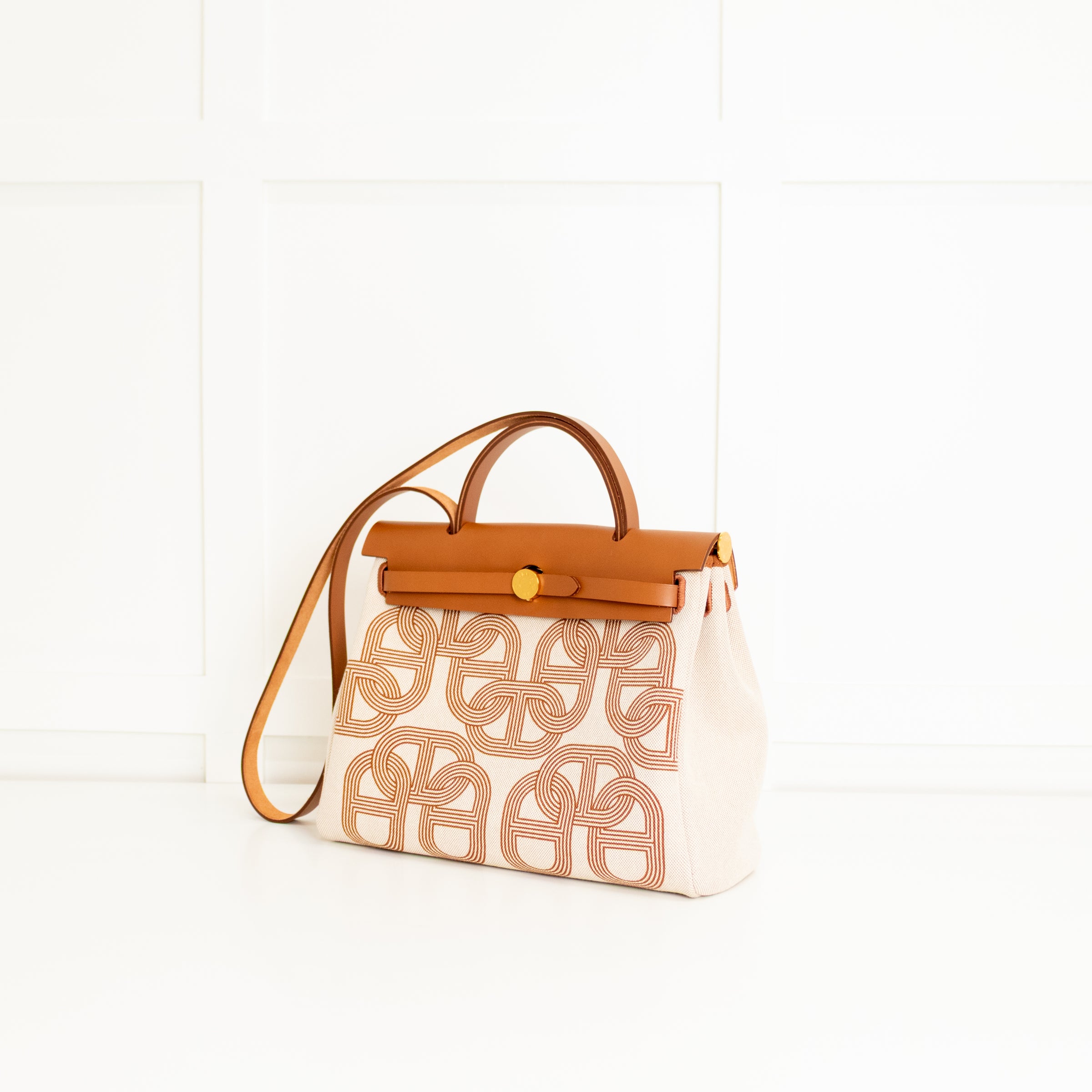 Hermes (2024) Ecru Chaine D'ancre Canvas Herbag Zip 31 Bag, with inspiration from the iconic Kelly bag, this modular handbag features a tough military canvas main body with a chain print pattern, and sturdy brown leather for the front flap, top handle, long strap, and Clou de Selle clasp with two leather straps threaded through the metal clasp. Finished with a rear zipped pocket, one main interior compartment, gold tone hardware, and an internal pouch pocket.