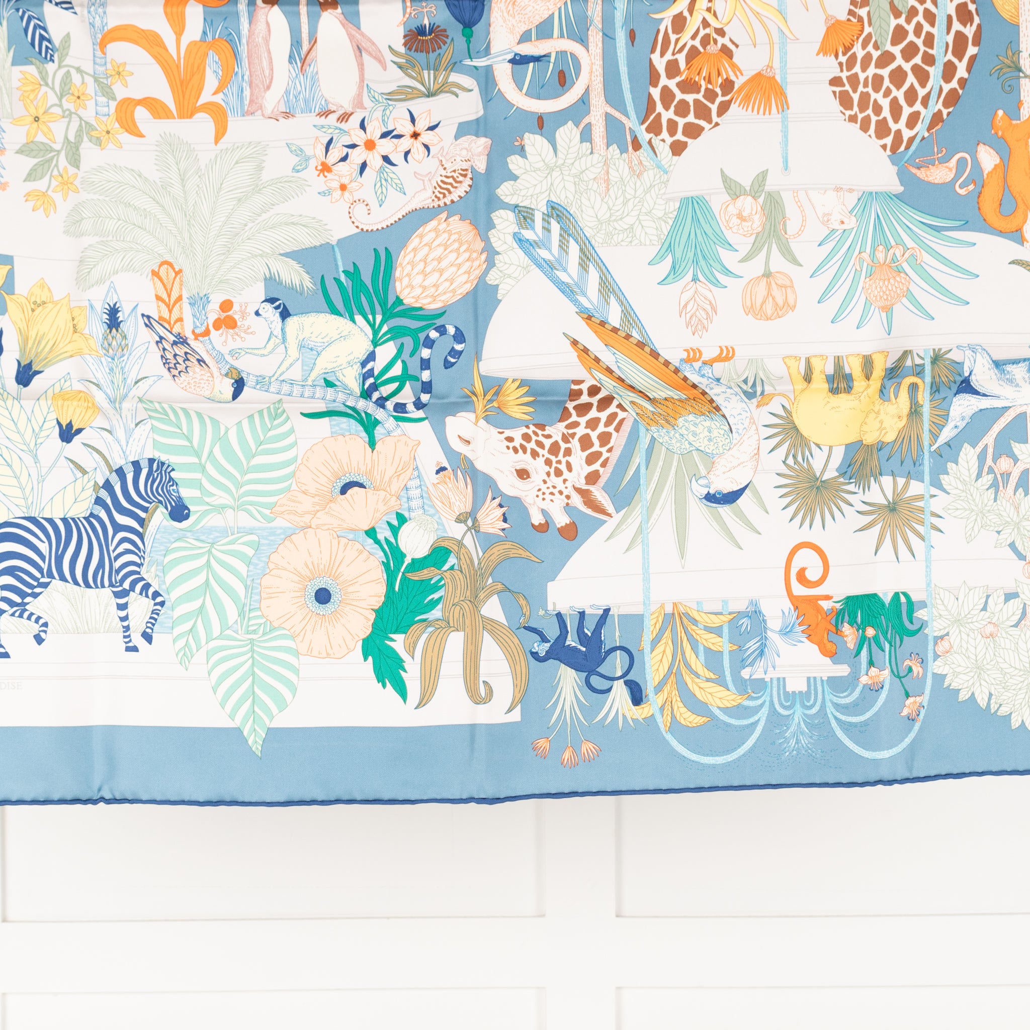 Hermes scarf, crafted with a beautiful silk fabric, featuring a blue multi-print precious paradise design.