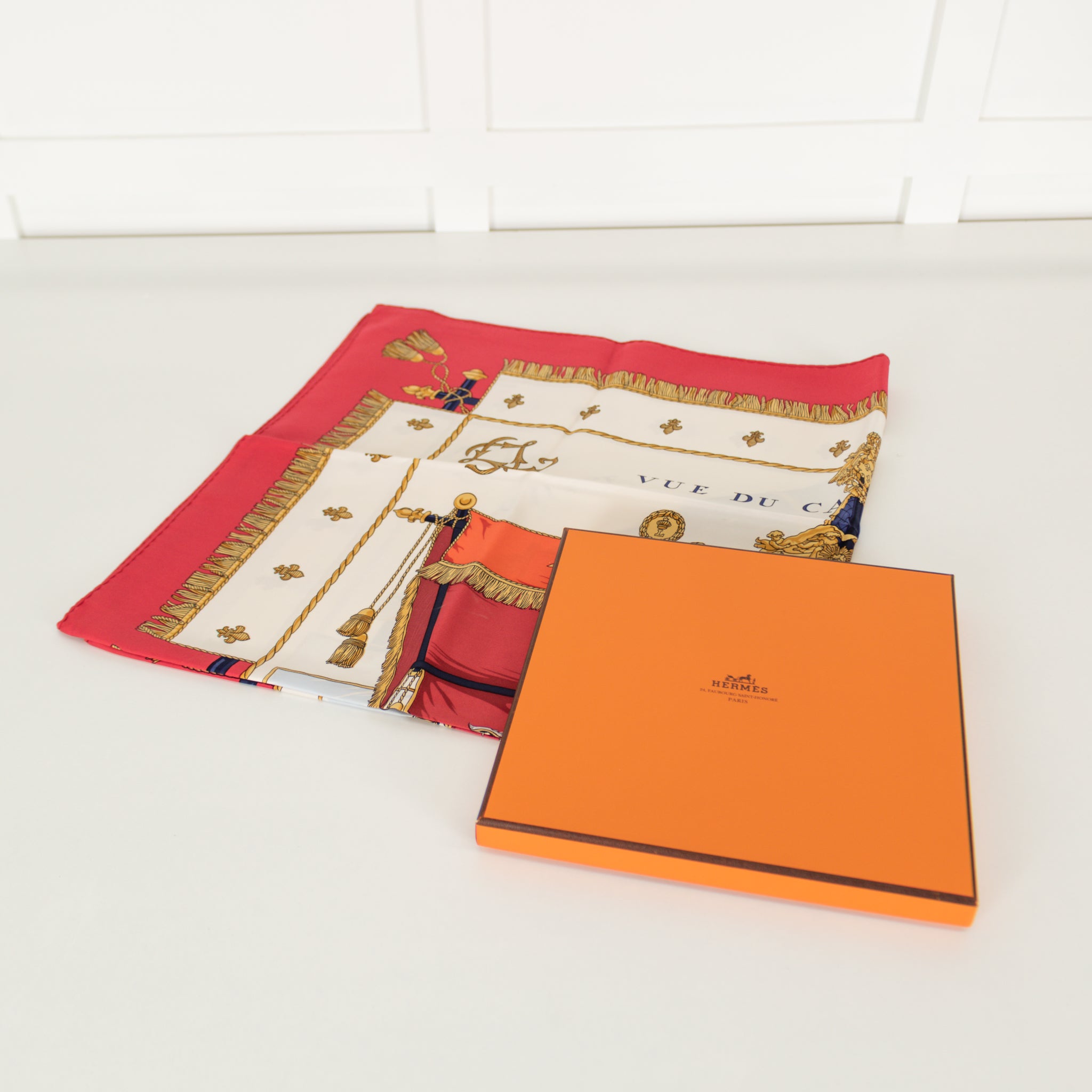 Hermes Vue Du Carrosse De La Galere La Reale red, cream, gold and blue stunning silk scarf with gorgeous intricate detailing.