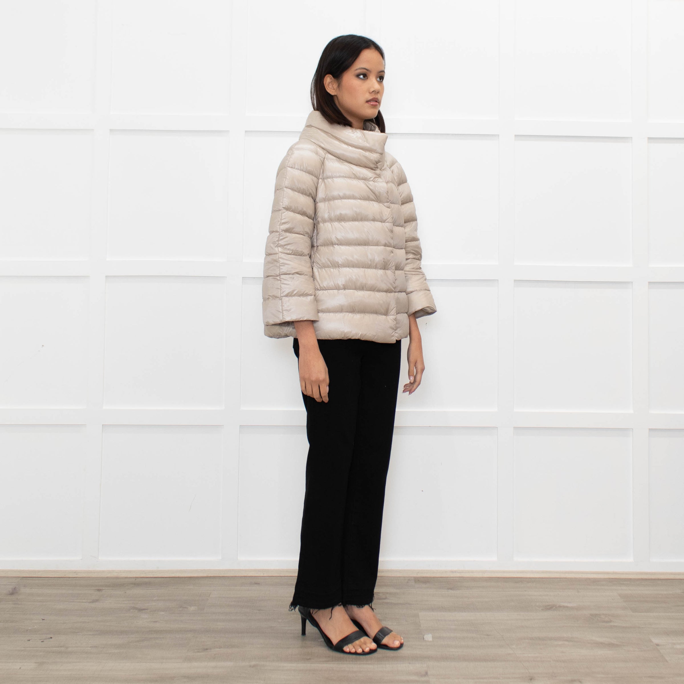 Herno light beige puffer jacket with front popper closure and two side slip pockets. New with tags, RRP £475.