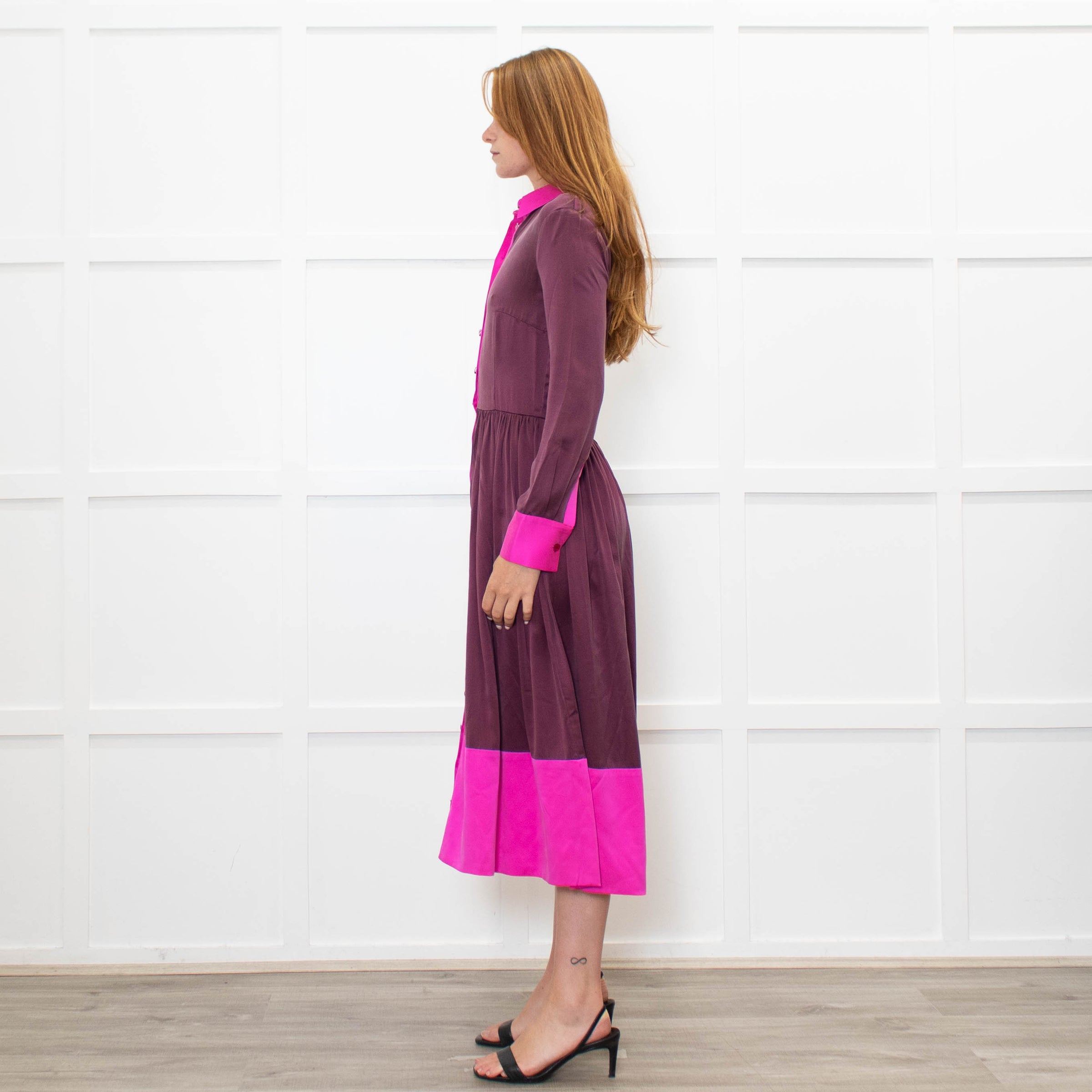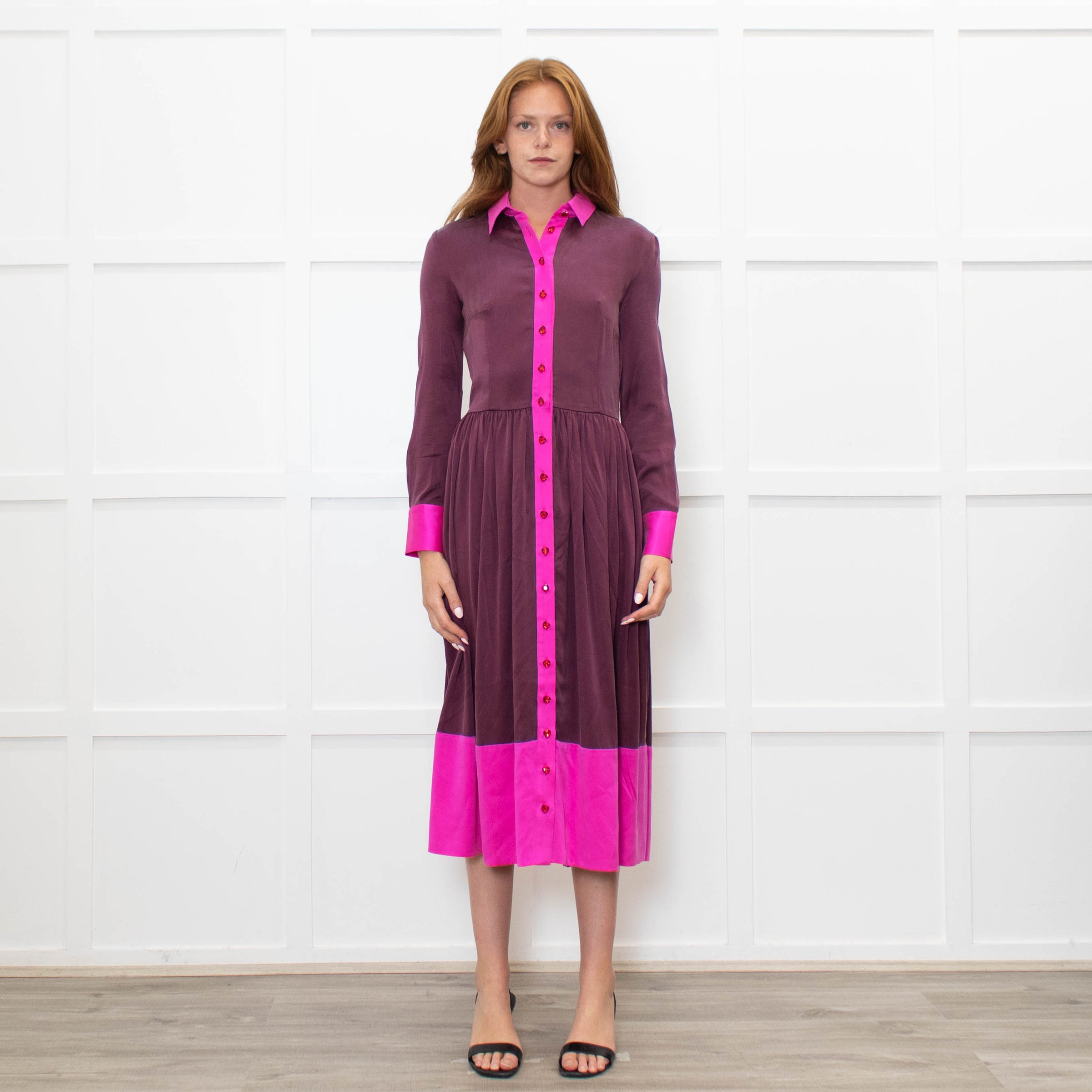 House of Holland pink and burgundy silk dress with a pleated skirt, pointed collar, and red jewel heart buttons. New with tags.