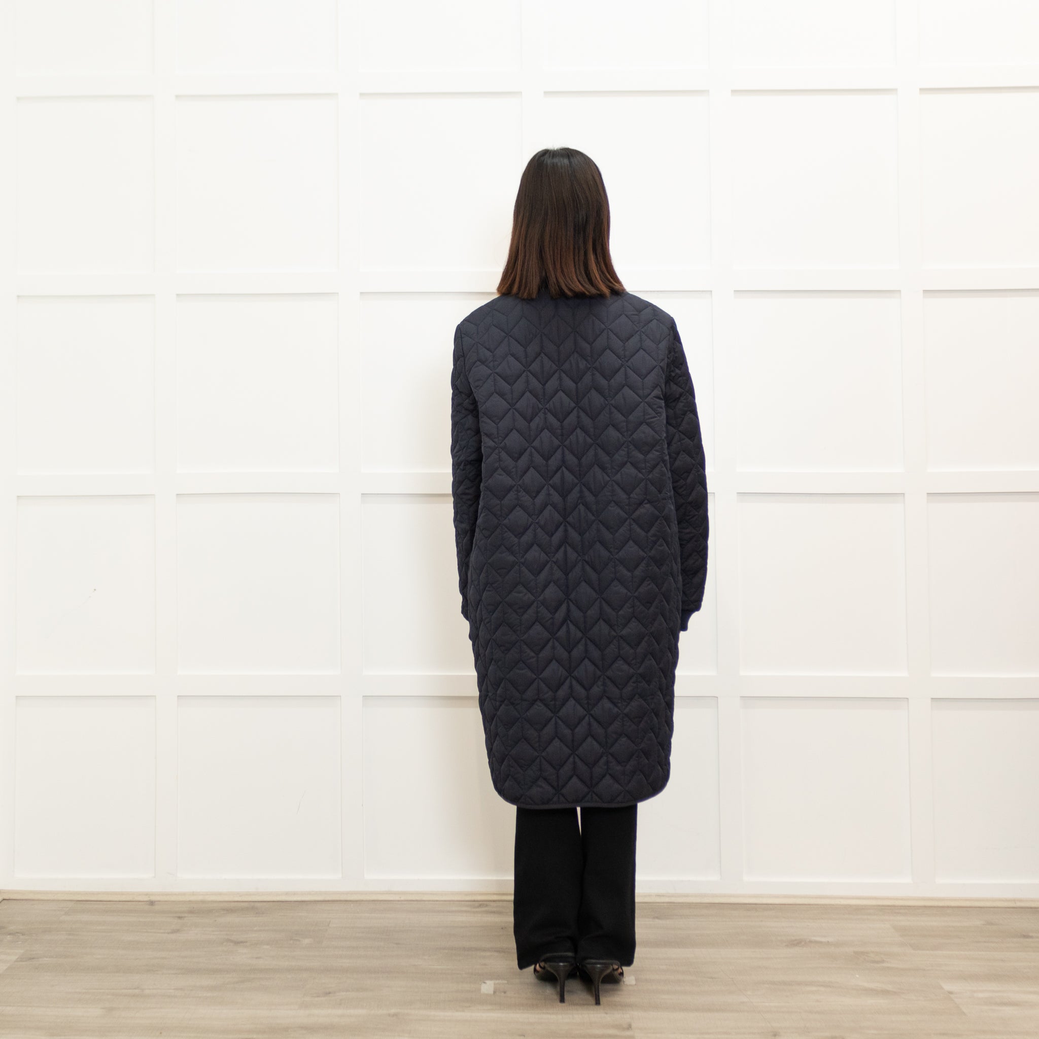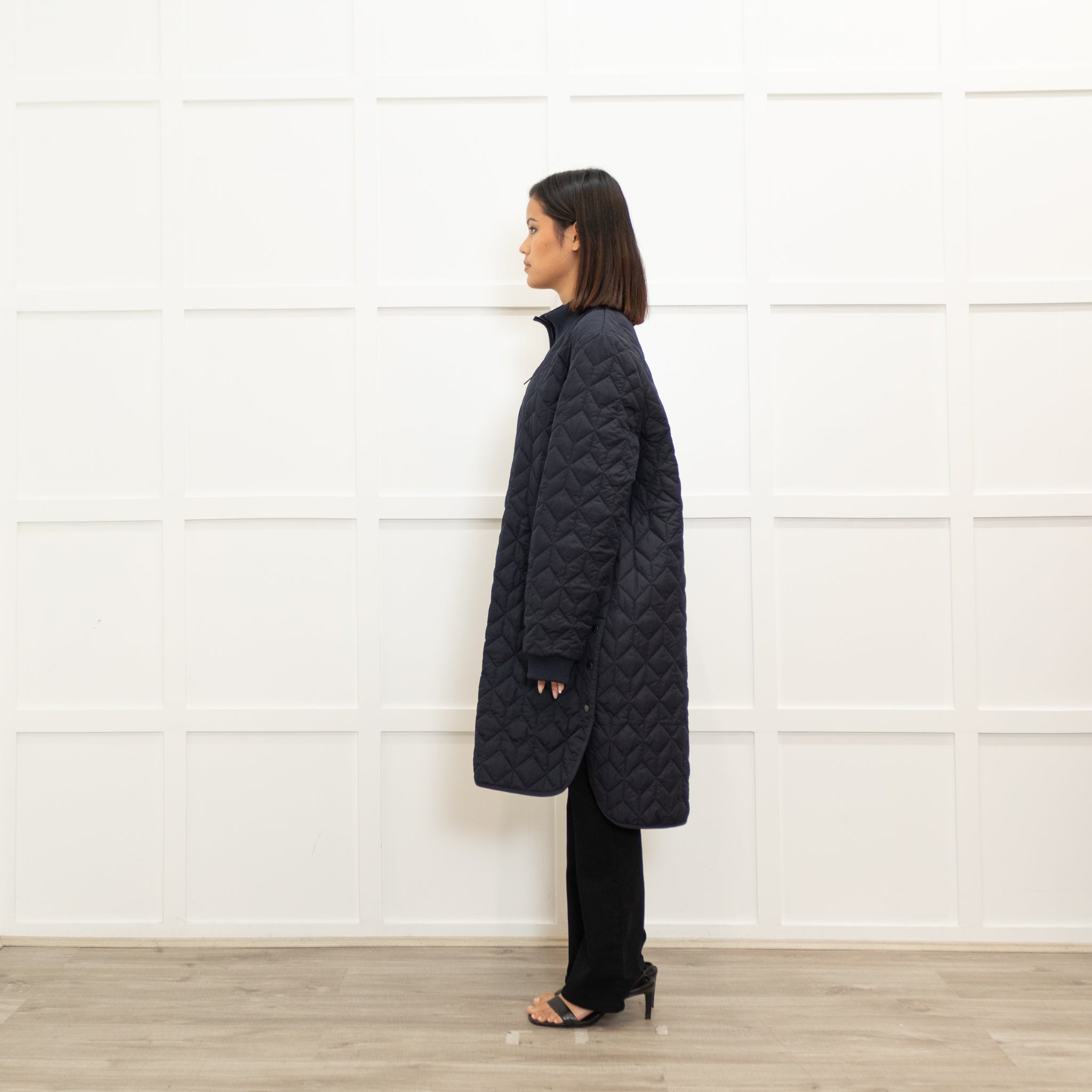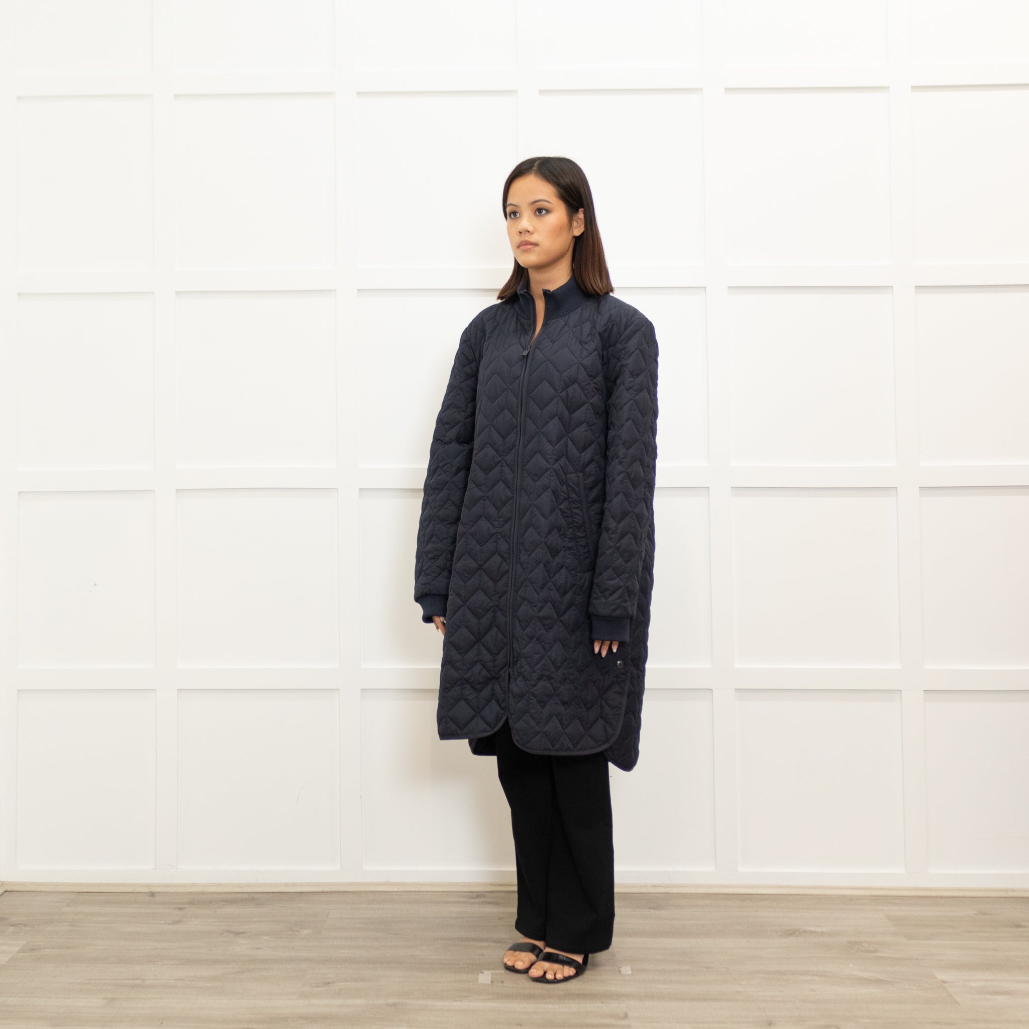 Ilse Jacobsen long-sleeve navy quilted coat, featuring two front pockets, a zip-up front closure and a rounded ribbed neckline.