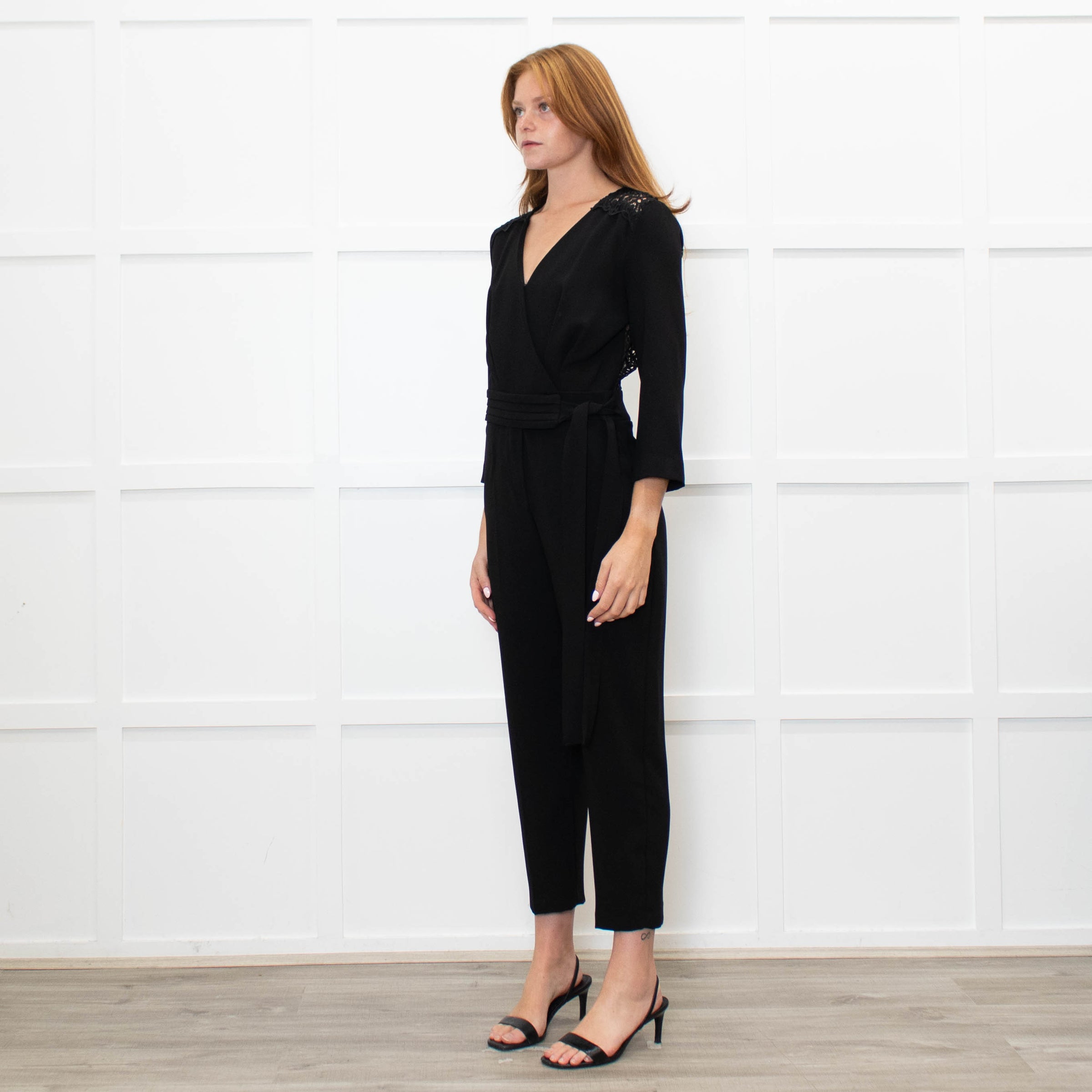 IPEKYOL black jumpsuit with lace back, a V-shaped neckline and tie waist.