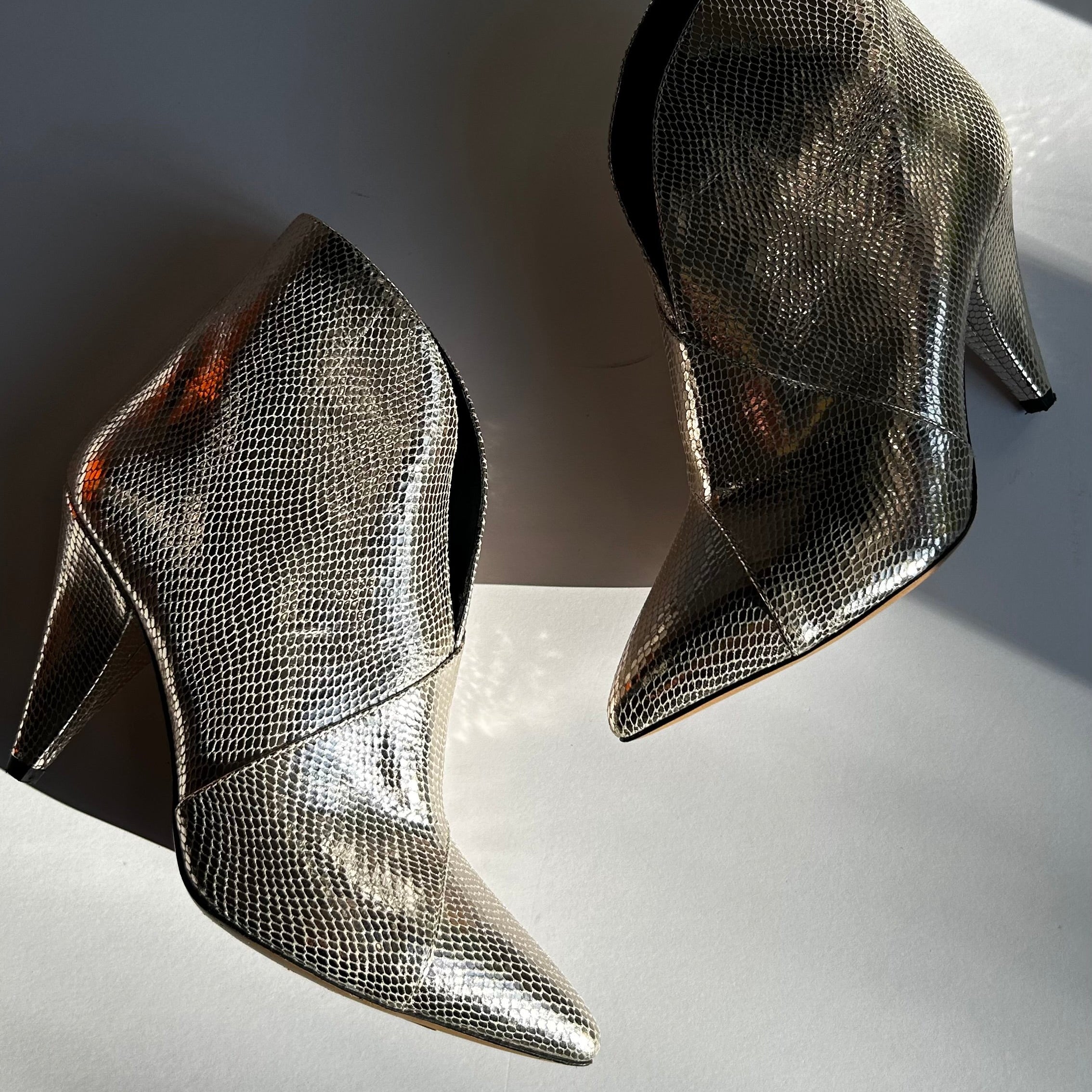 Isabel Marant silver embossed snake pattern leather Archenn ankle boots with a tapered heel, pointed toes, leather soles and a deep cut front.