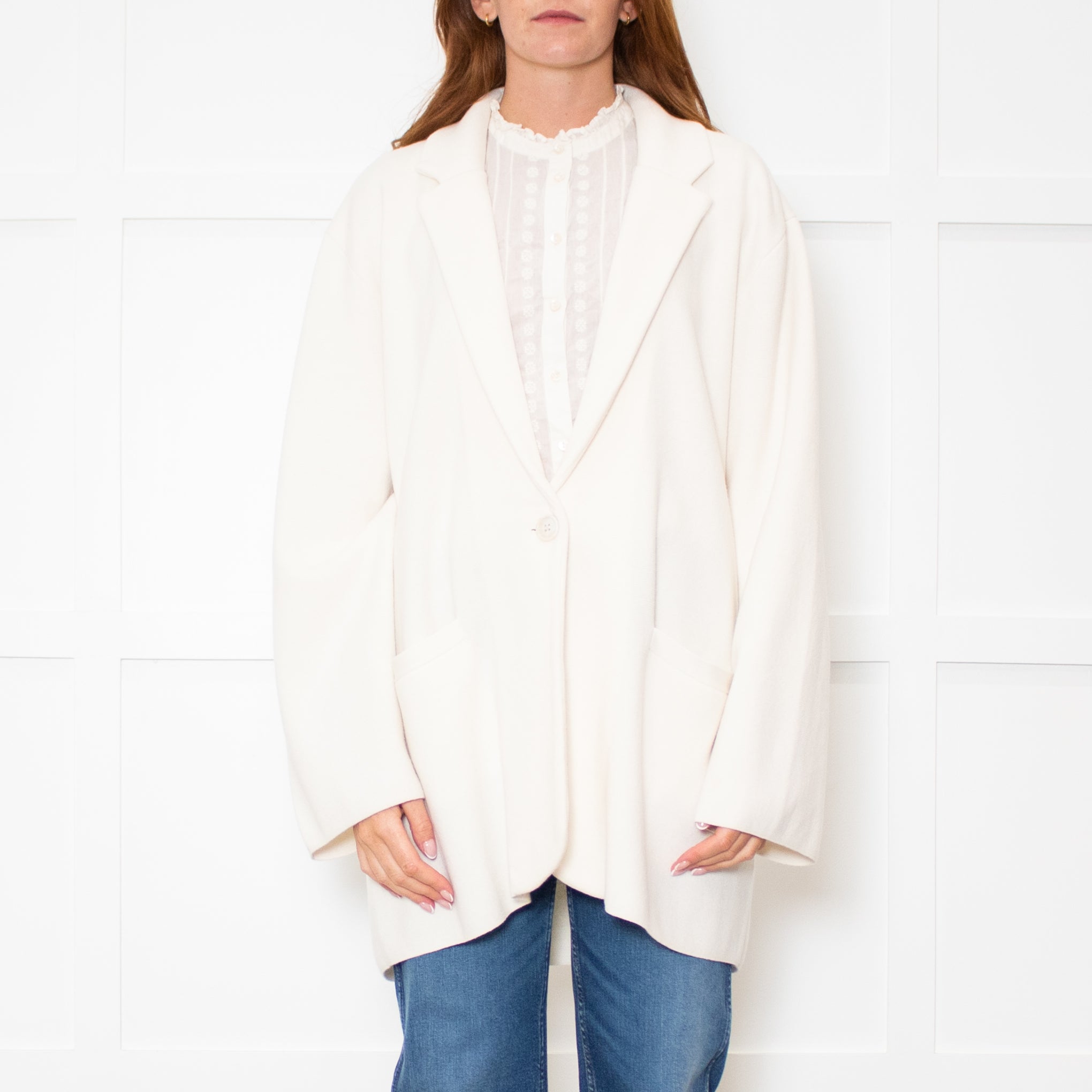 J Crew cream cotton blend knitted jacket with a notch collar and lapel, long sleeves, two front slip pockets, and a single button fastener.