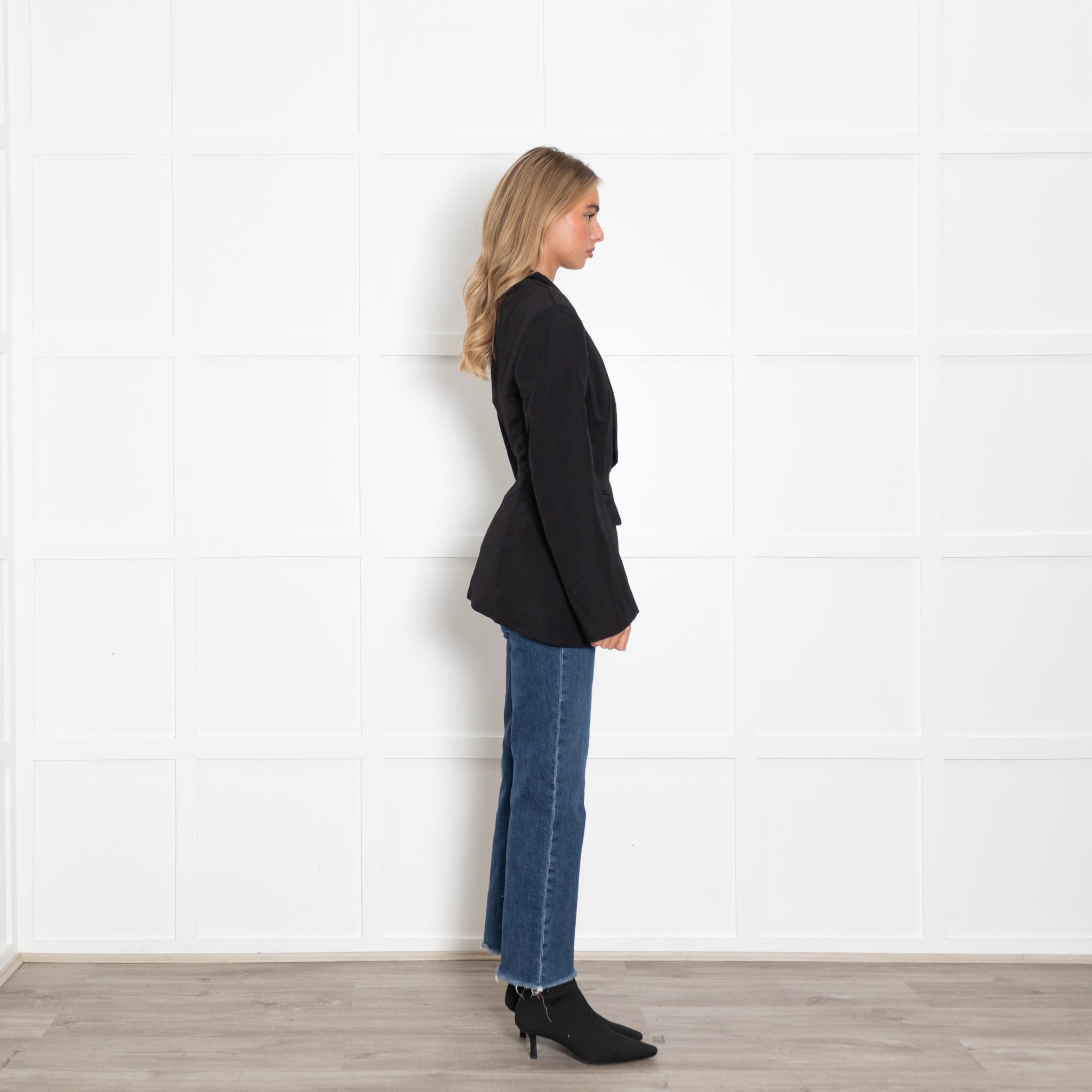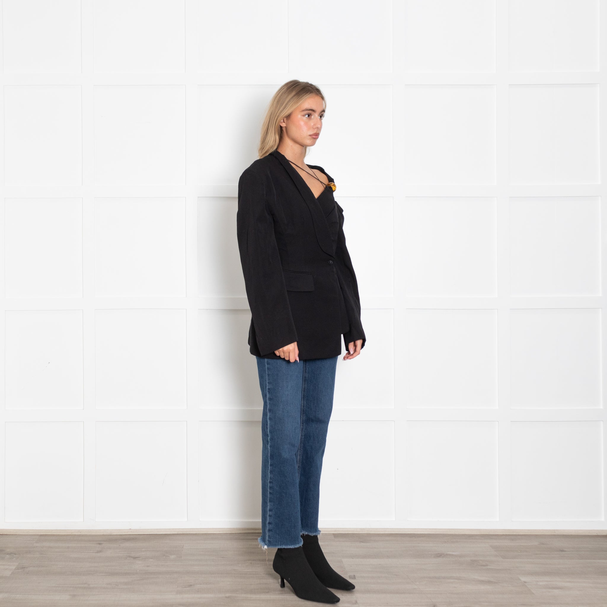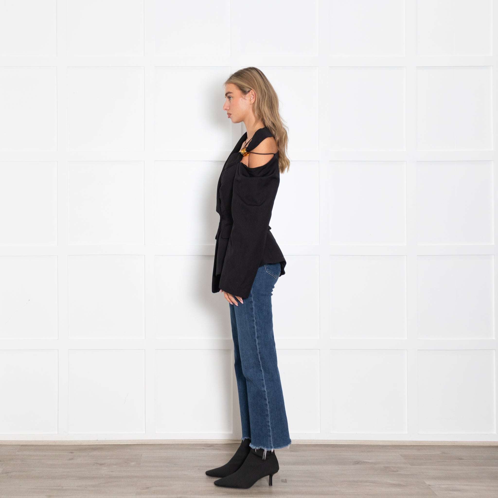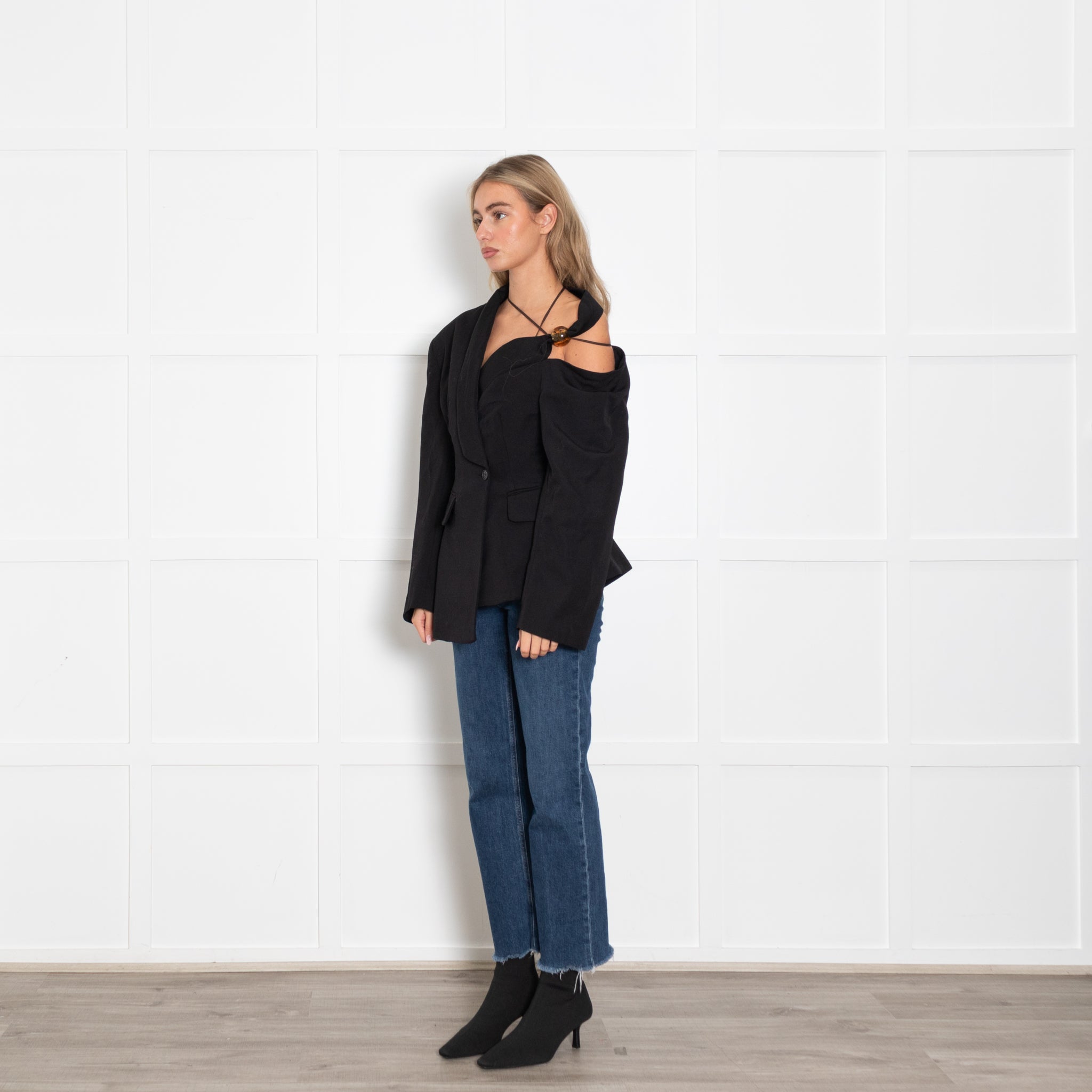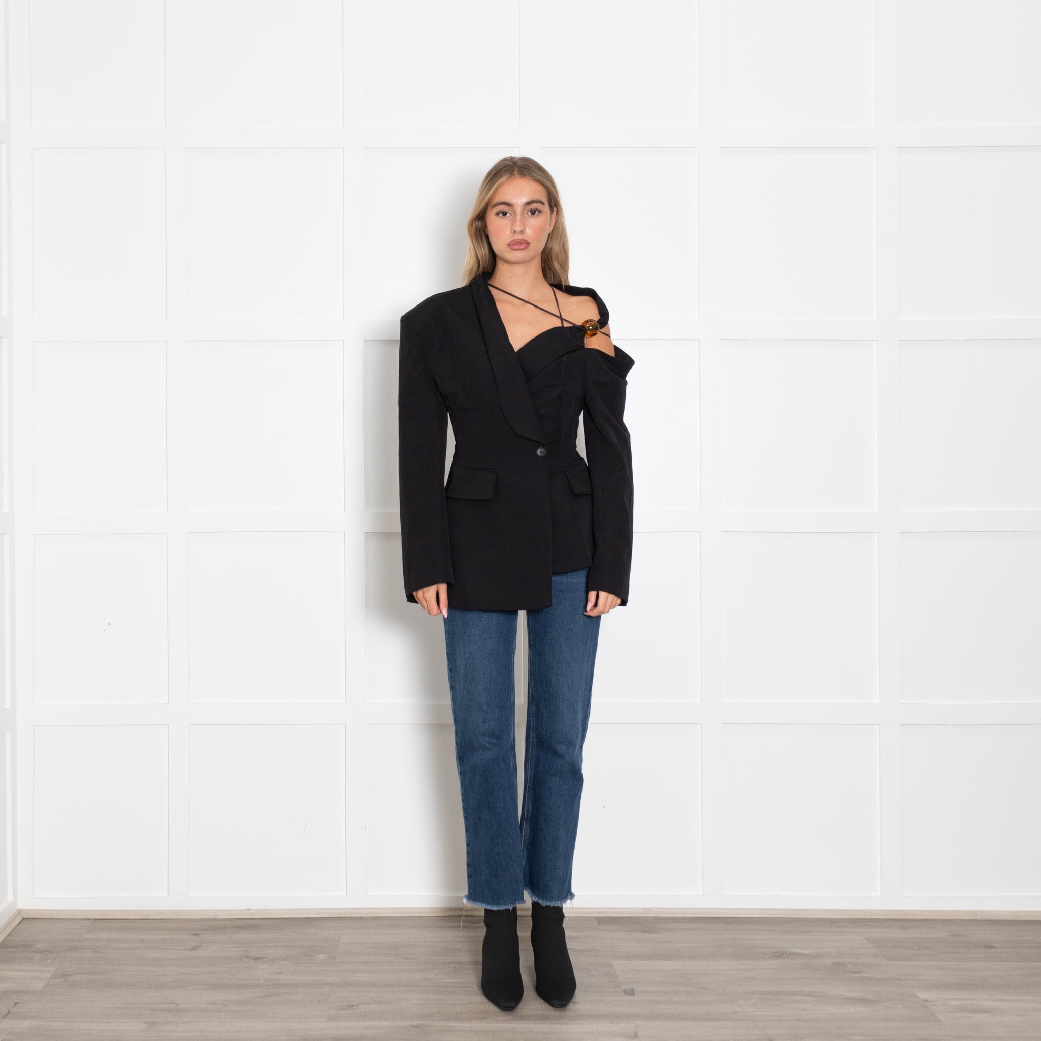 Jacquemus black long-sleeve jacket, crafted with a gorgoues soft cotton wool mix material, featuring a one-shoulder baska deisgn, with a stunning round transparent ball statement piece design on the neckline, and a button-up front closure and two front flap pockets.