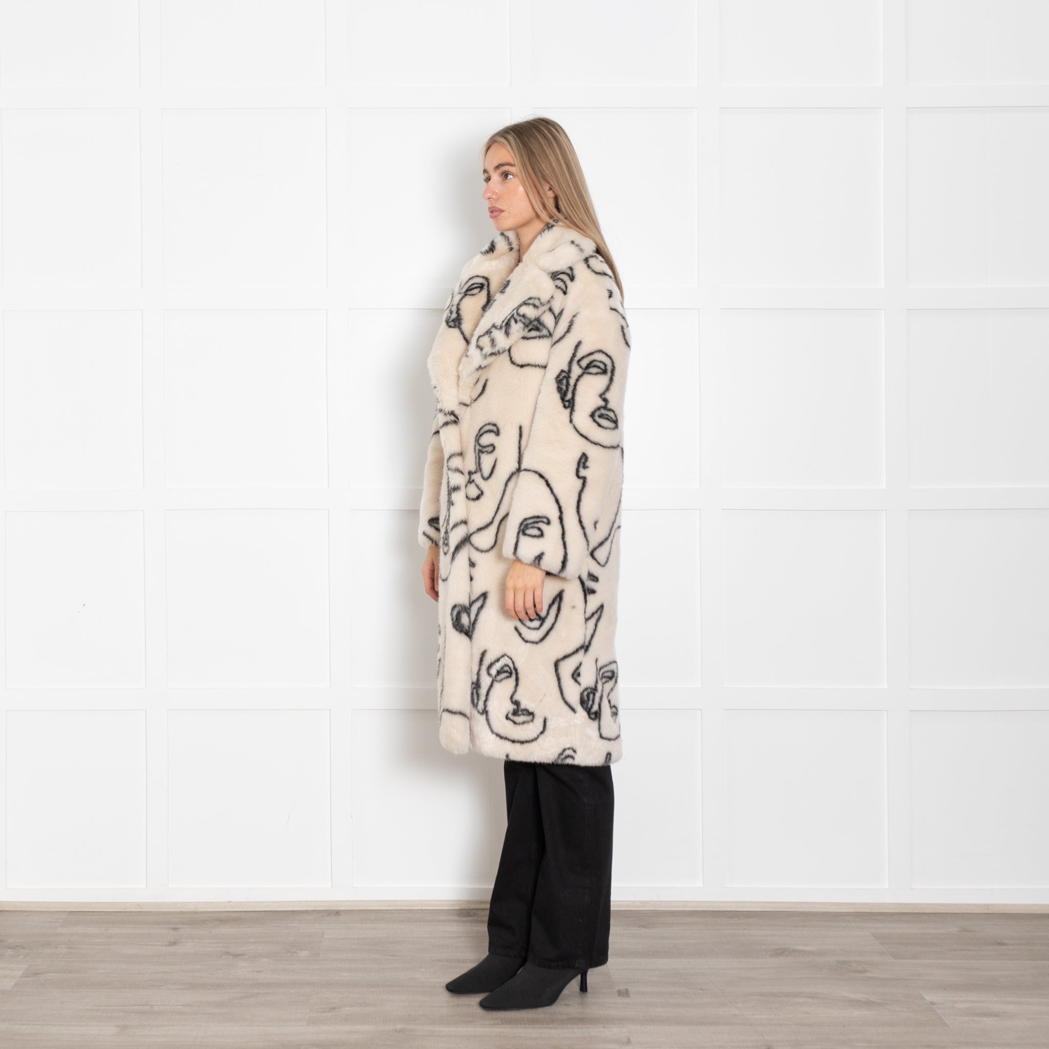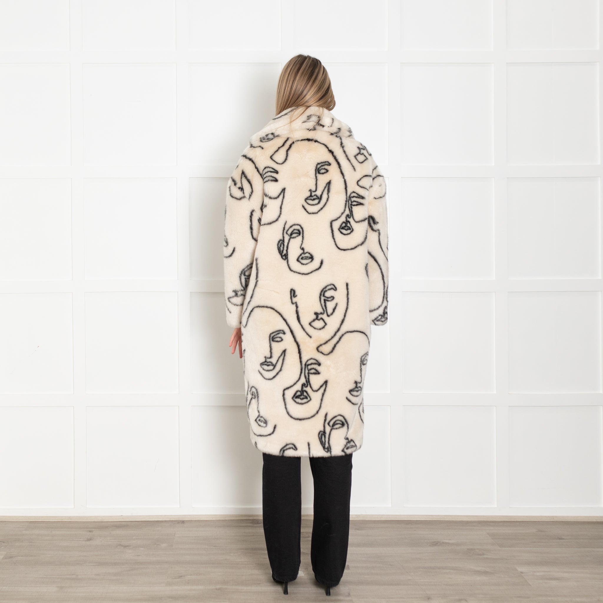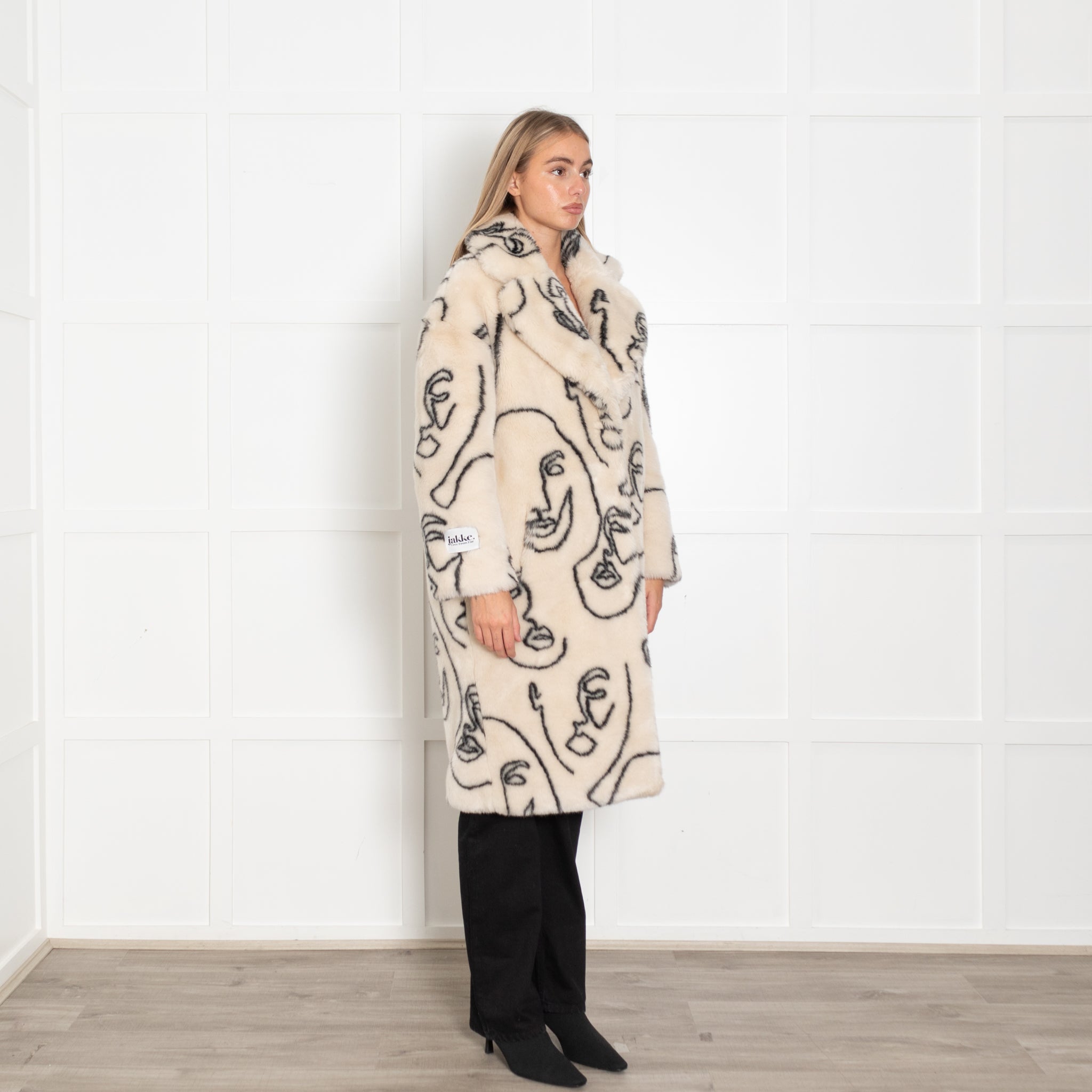 Jakke Cream Faux Fur Abstract Faces Coat