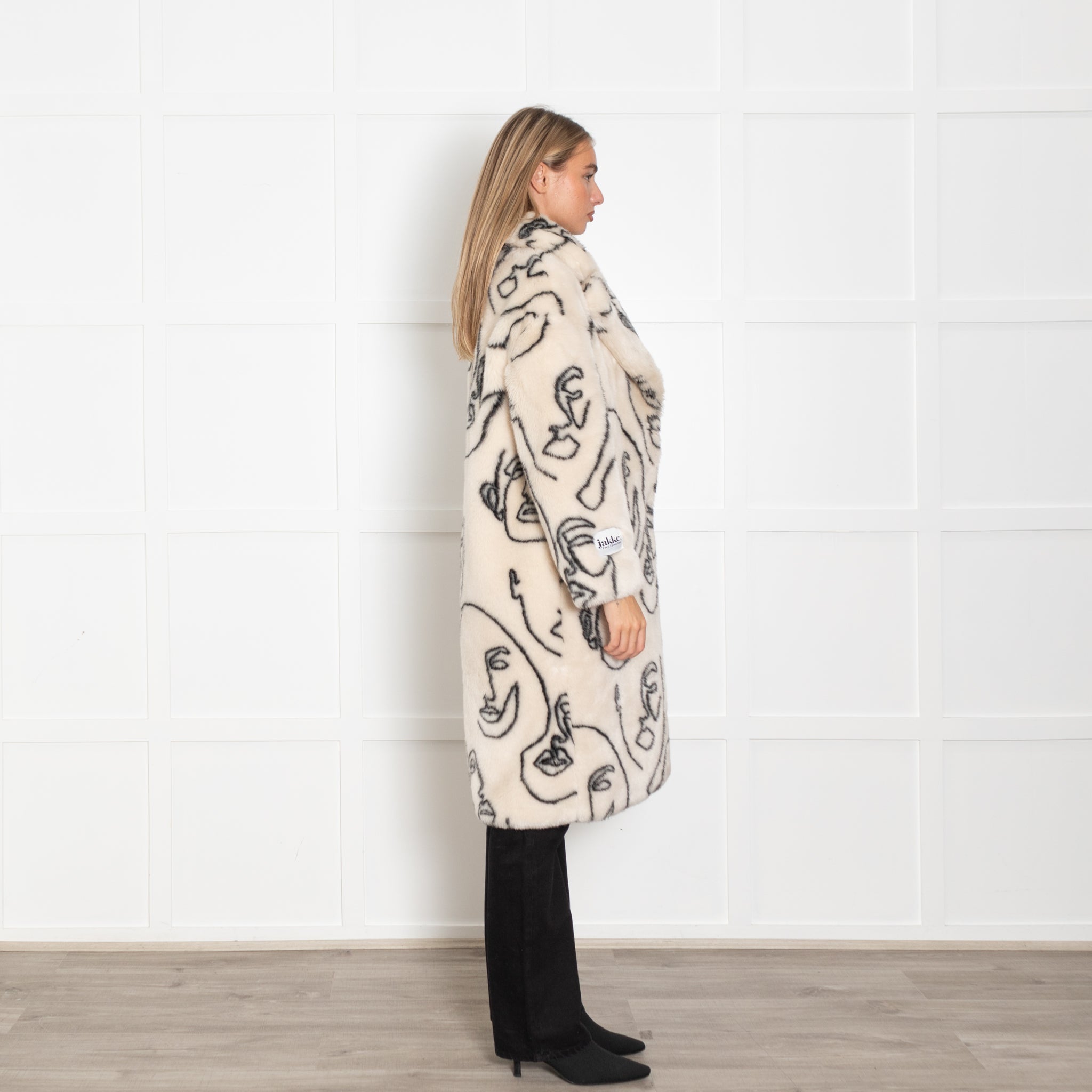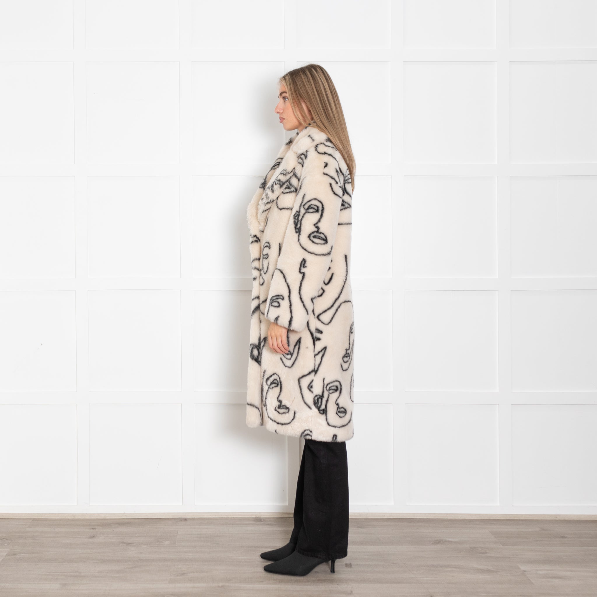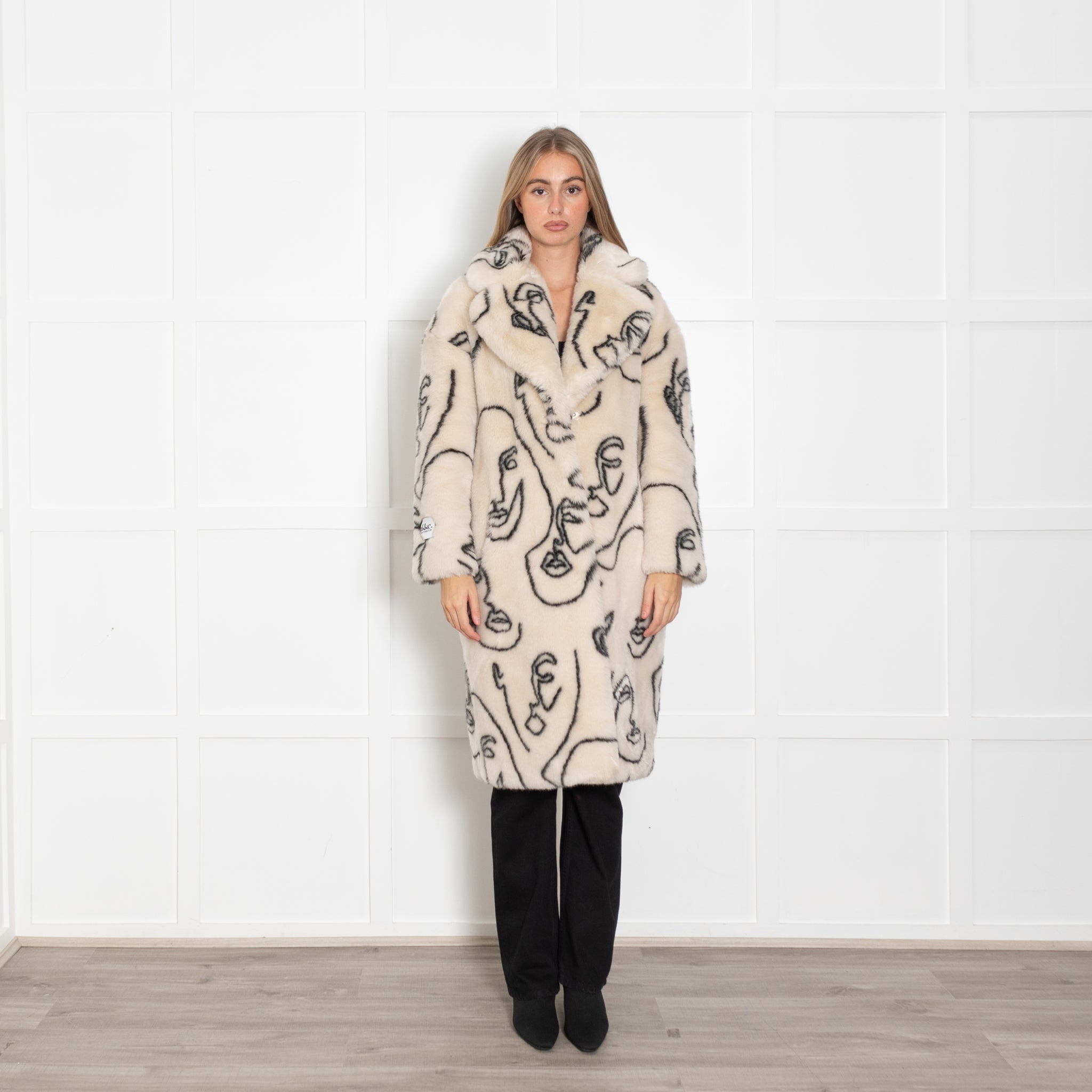 Jakke Cream Faux Fur Abstract Faces Coat