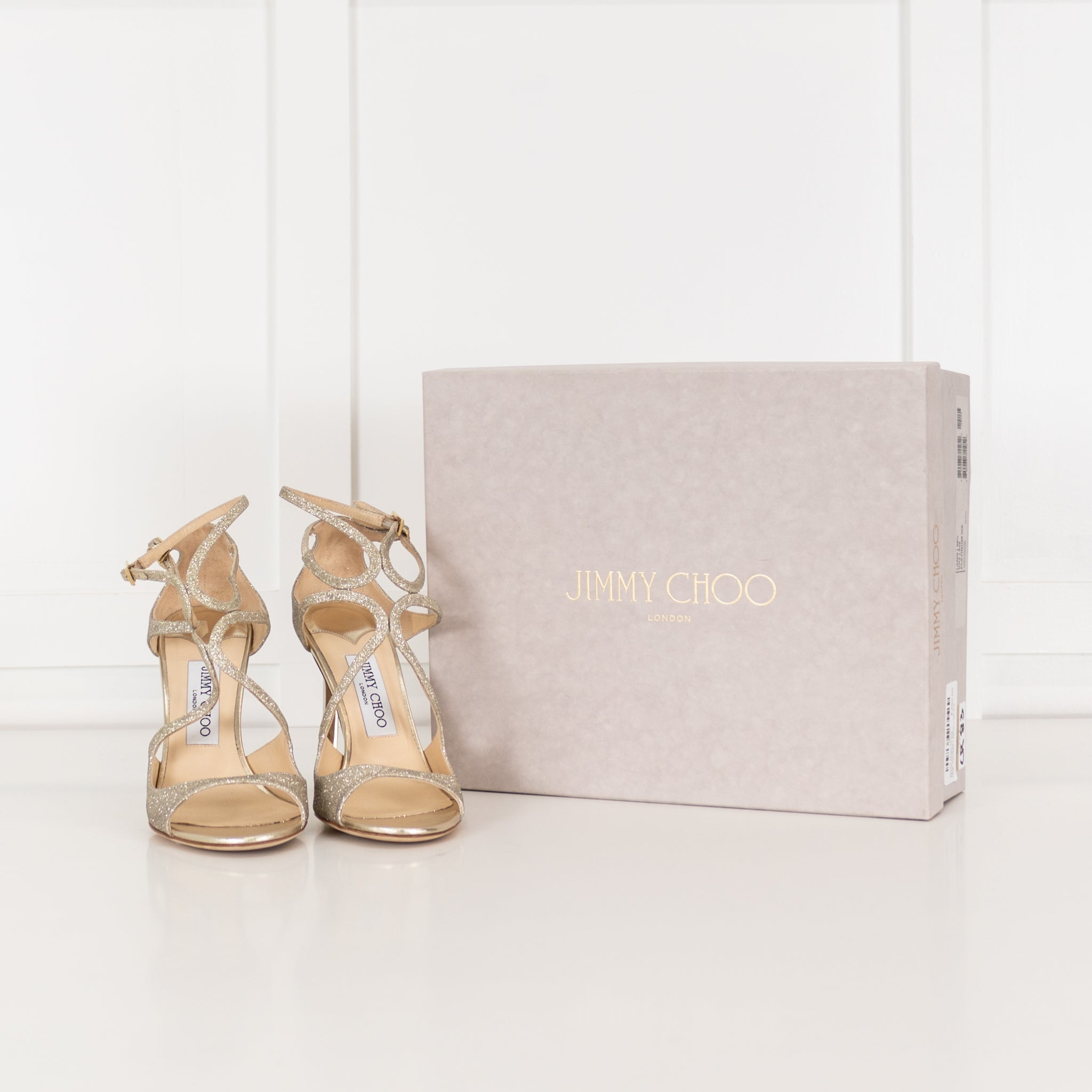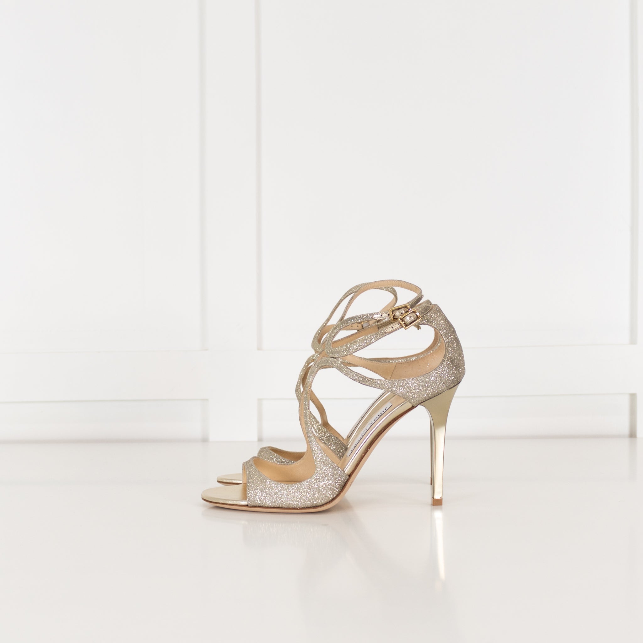 Jimmy Choo stunning dusty glitter platinum ice high sandals, featuring an adjustable ankle strap with a rounded toe. Heel height approximately 10cm. Accompanied by the original dust bag and box.