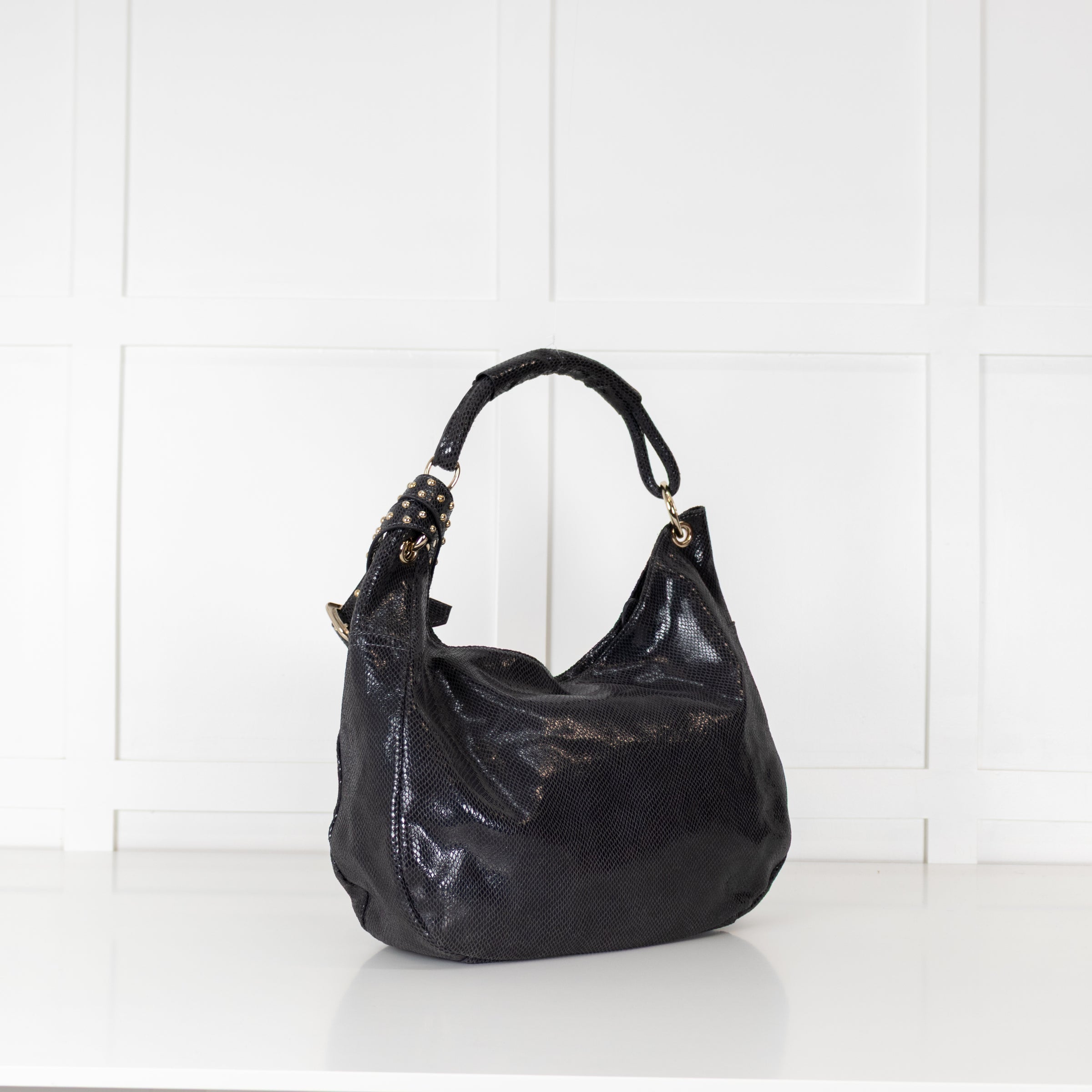 Jimmy Choo grey snake embossed leather bag with a rolled top handle gold-tone logo plaque and top zip closure. This bag features a beige suede lining and multiple internal slip pockets.